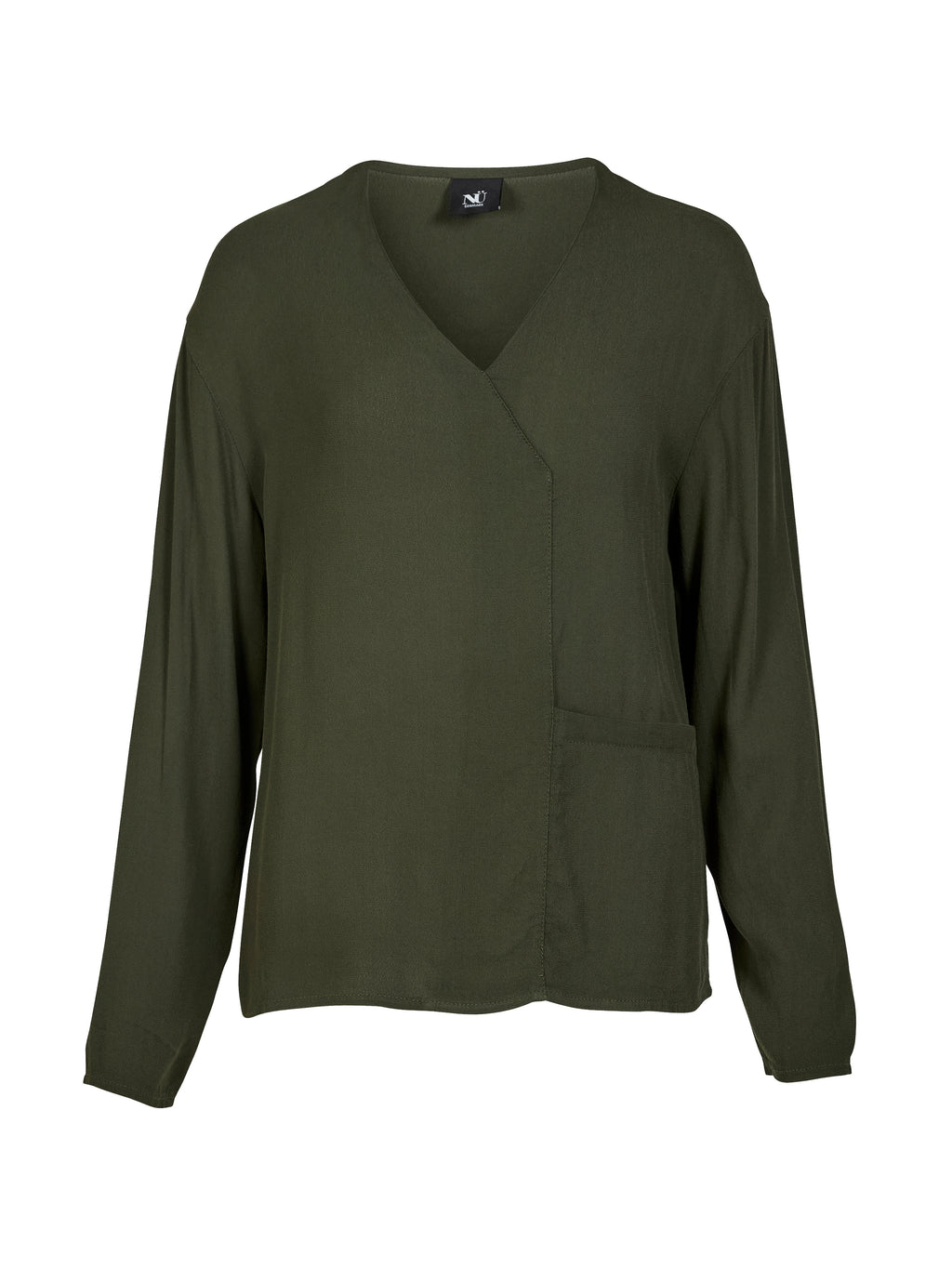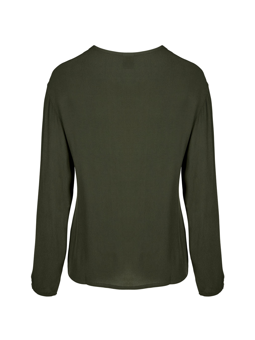 Denne blusen har en avslappet og moderne snitt med en v-hals og lange ermer. Den lette og myke kvaliteten gjør den behagelig å ha på, mens det dekorative frontpanelet gir blusen et grafisk og strømlinjeformet utseende. Den asymmetriske frontseam skaper et interessant detalj, og legger til dybde til det enkle designet.