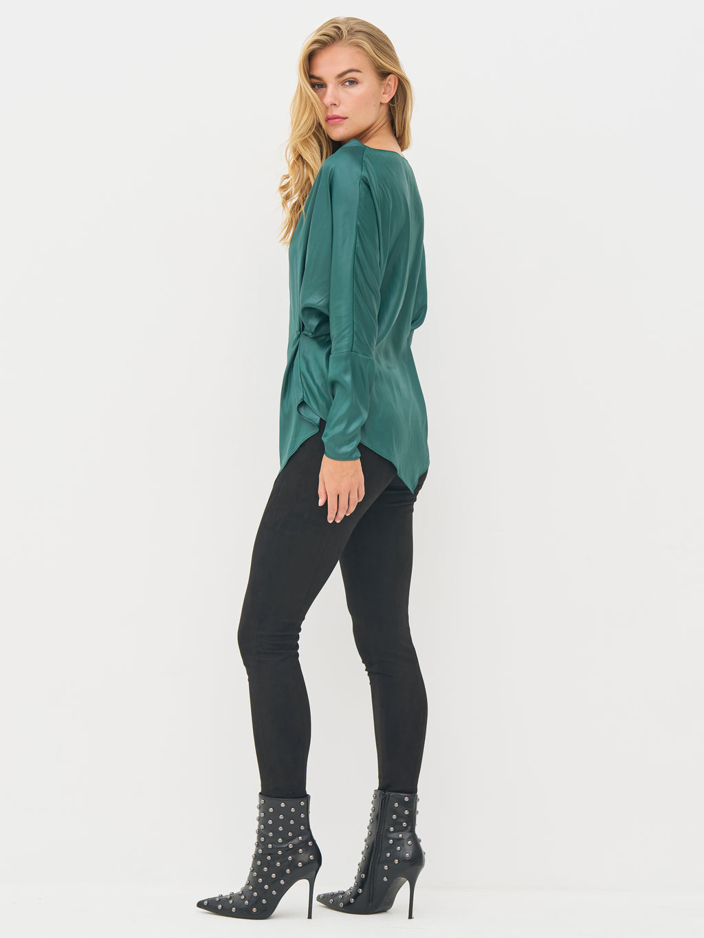 Legg til en moderne vri på garderoben med denne myke, blanke blusen. Den har en løs passform og en spesiell spiss skjørt som skaper en flatterende og iøynefallende silhuett. Ermene er lange med en vid mansjett og en lett rynking, som gir ekstra karakter til det enkle designet.