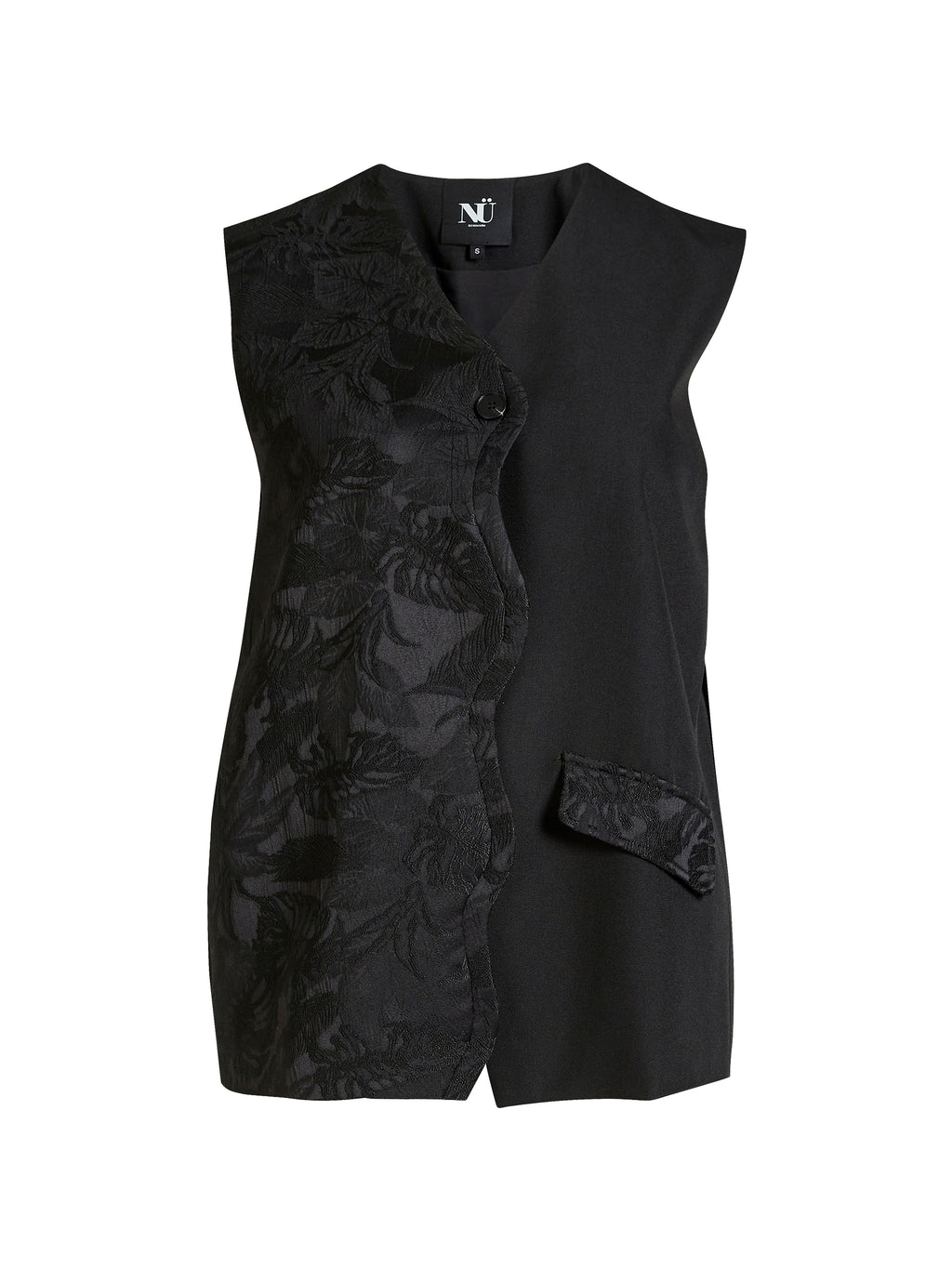 Denne vesten kombinerer klassisk skreddersøm med fine detaljer. Den er ermelløs og har en vakker asymmetrisk front med dekorativ knappelukking. Én side er prydet med teksturmateriale i et blomstermønster, som skaper en elegant kontrast. En liten skrå lommeflappdetalj foran fullfører utseendet.