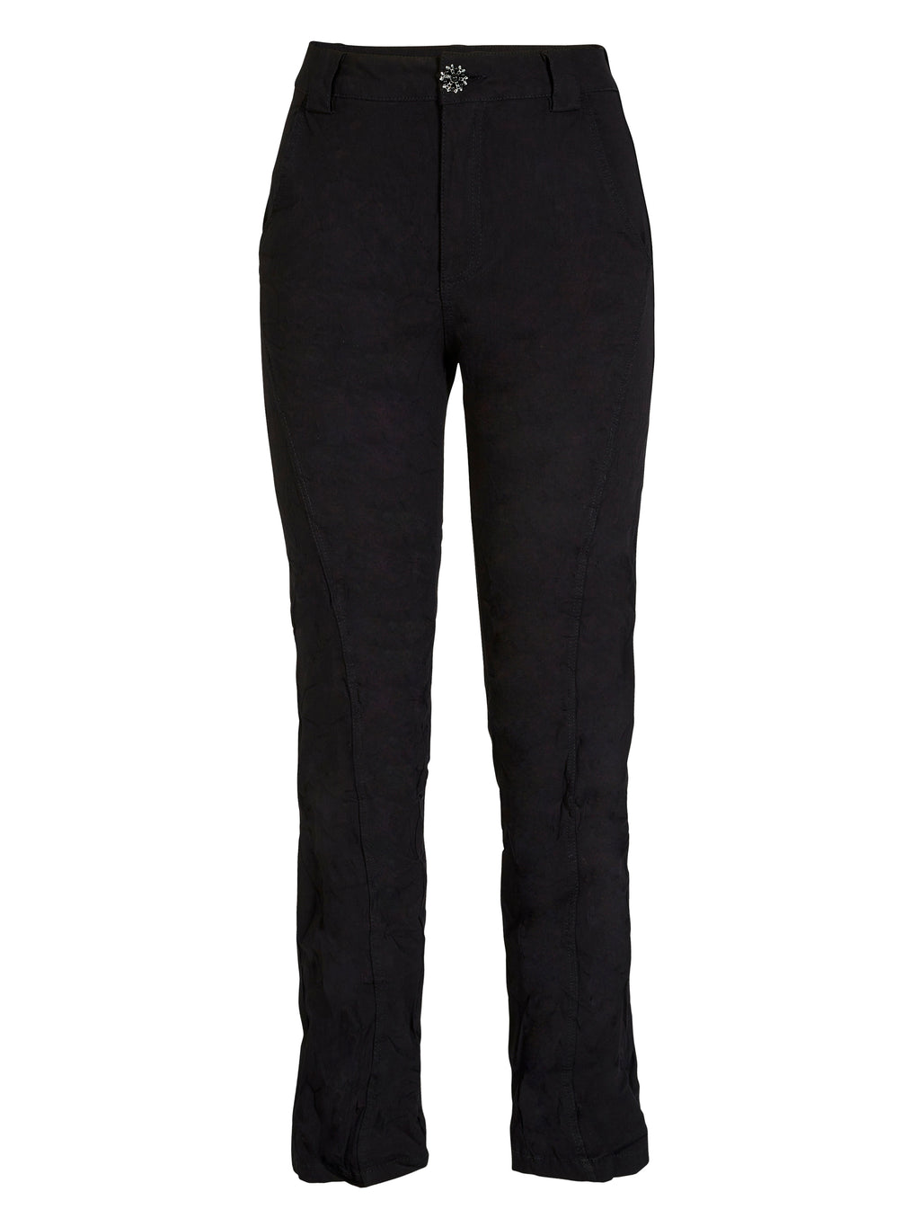 Disse buksene har en smigrende, rett passform og er designet i en lett strukturert kvalitet som gir et elegant uttrykk. Dekorative knapper med glitter på lommene foran og bak legger til et eksklusivt preg. Sømdetaljer nedover bena skaper en slankende effekt og understreker det elegante utseendet.