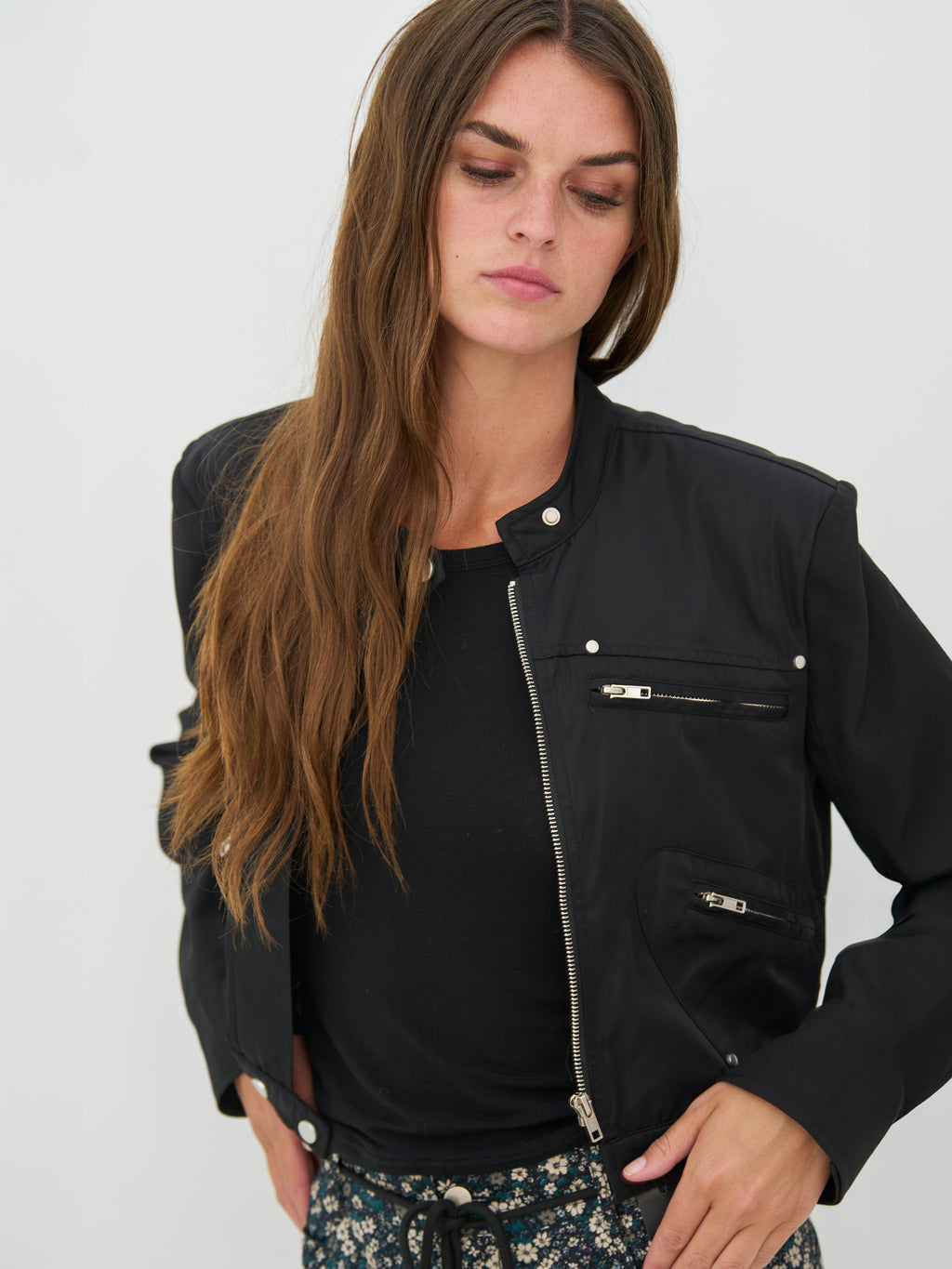 Denne jakken har et moderne, kul uttrykk med sin korte lengde og kombinasjonen av matte og blanke materialer. Foran har den flere glidelåser og trykknapper som legger til både funksjon og karakter til designet. Den høye kragen med trykknapp gir et skarpt utseende, mens de lange ermene avslutter antrekket på en klassisk måte. På baksiden holdes jakken enkel med rene linjer. Styl den over en topp, kjole eller lett strikk for et stilig hverdagsutseende med kant.