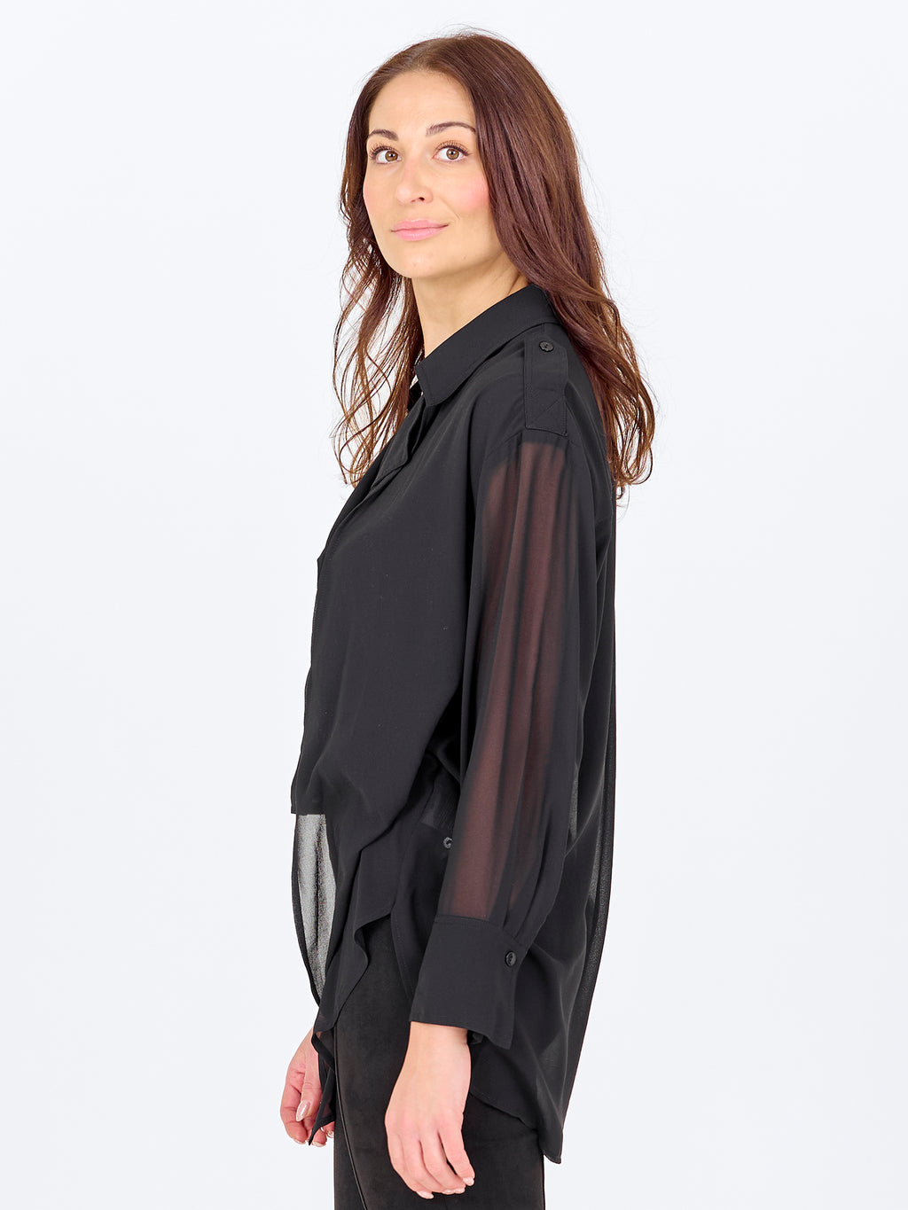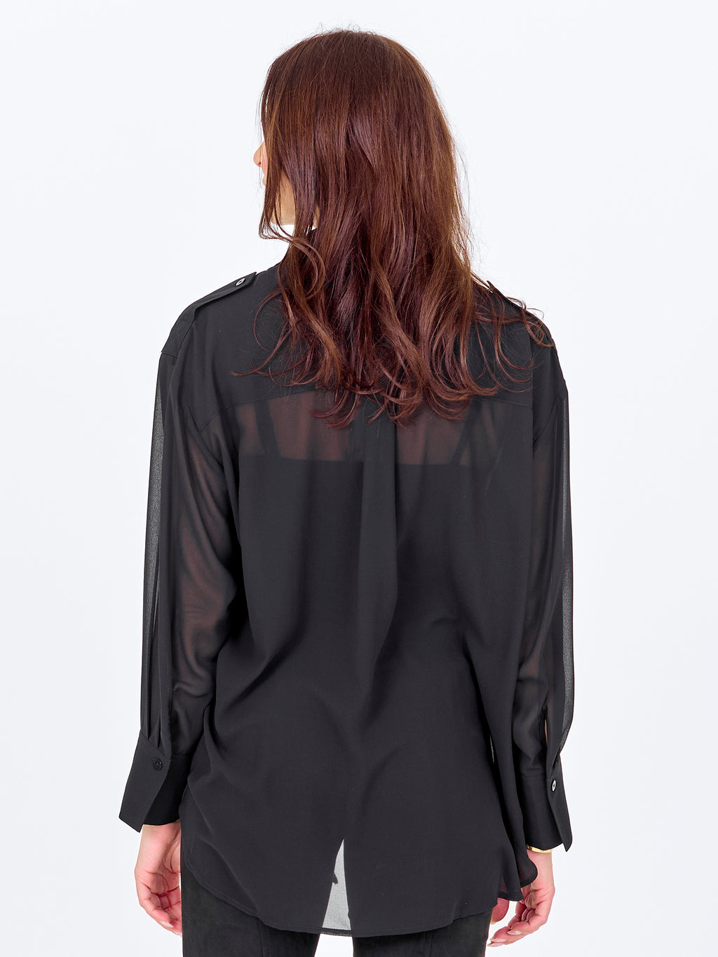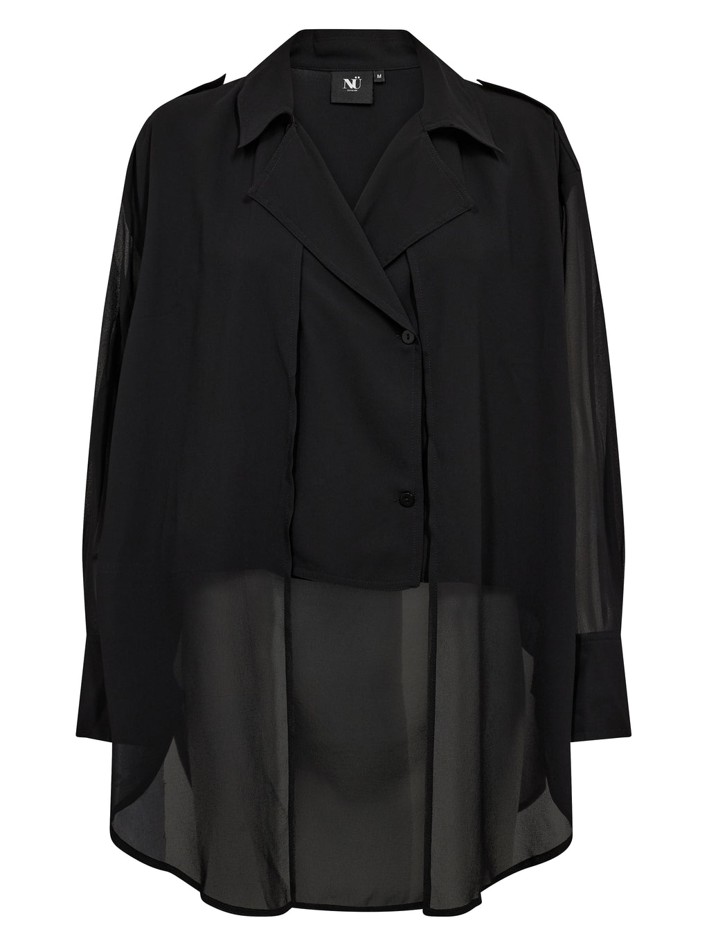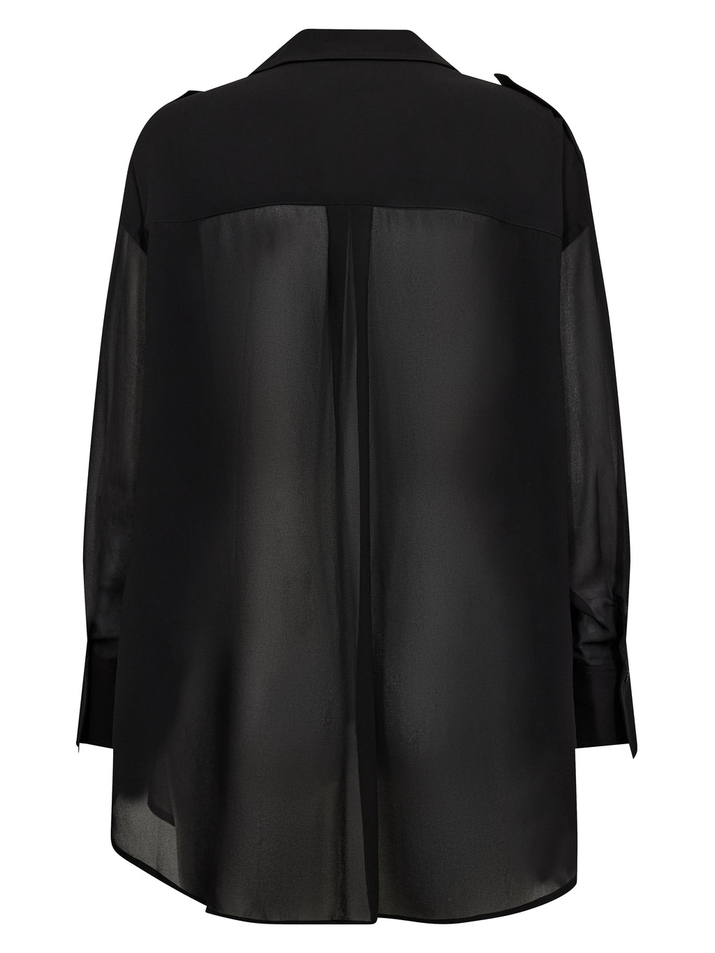 Denne skjorten har et lett og enkelt uttrykk med en løs passform som faller mykt på kroppen. Forsiden er klassisk med krage og knappestolpe, mens baksiden er lett gjennomsiktig med en diskret skuldersøm og legg som gir ekstra bevegelse. De lange ermene avsluttes med mansjetter og understreker den avslappede passformen. Style skjorten over en topp og sammen med bukser eller jeans for et avslappet hverdagsantrekk, eller la den stå åpen som et lett lag.