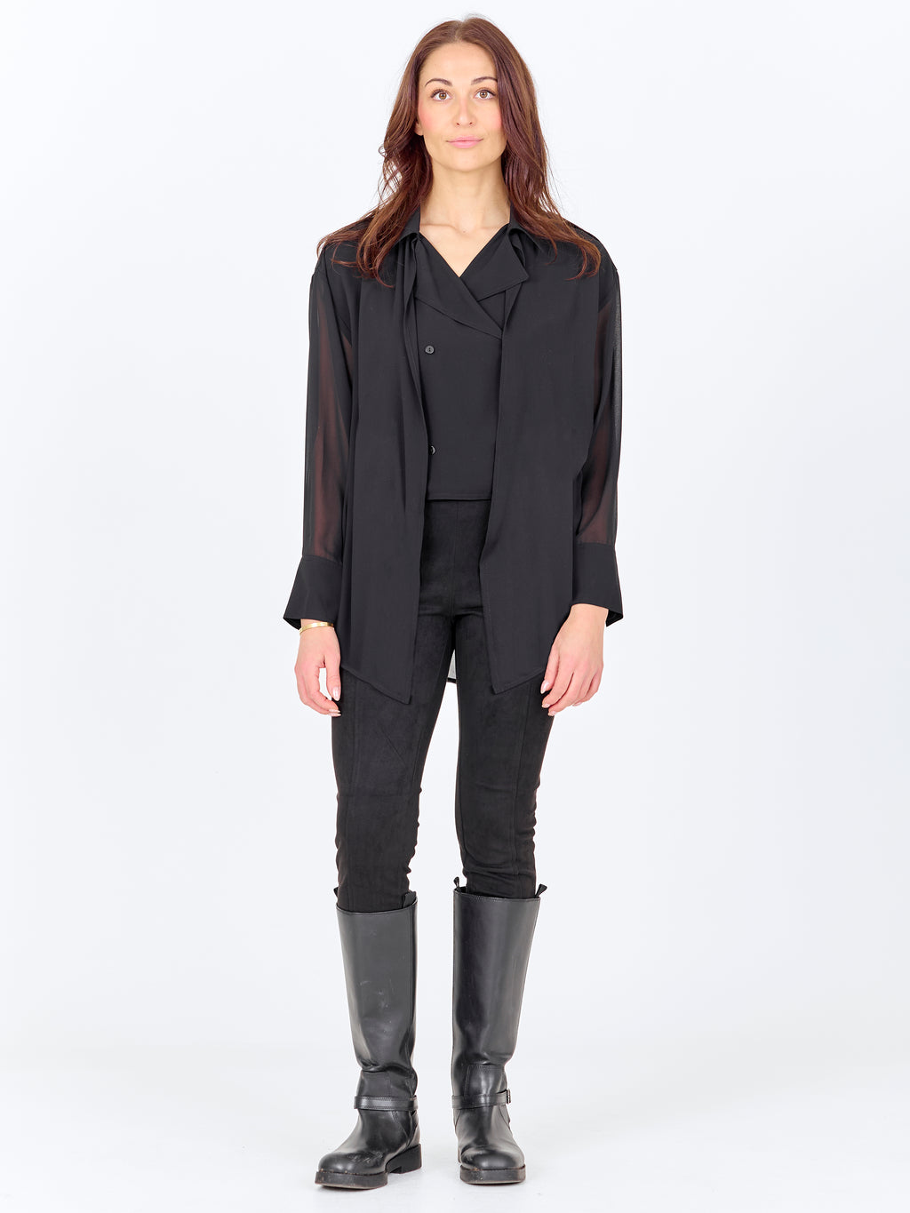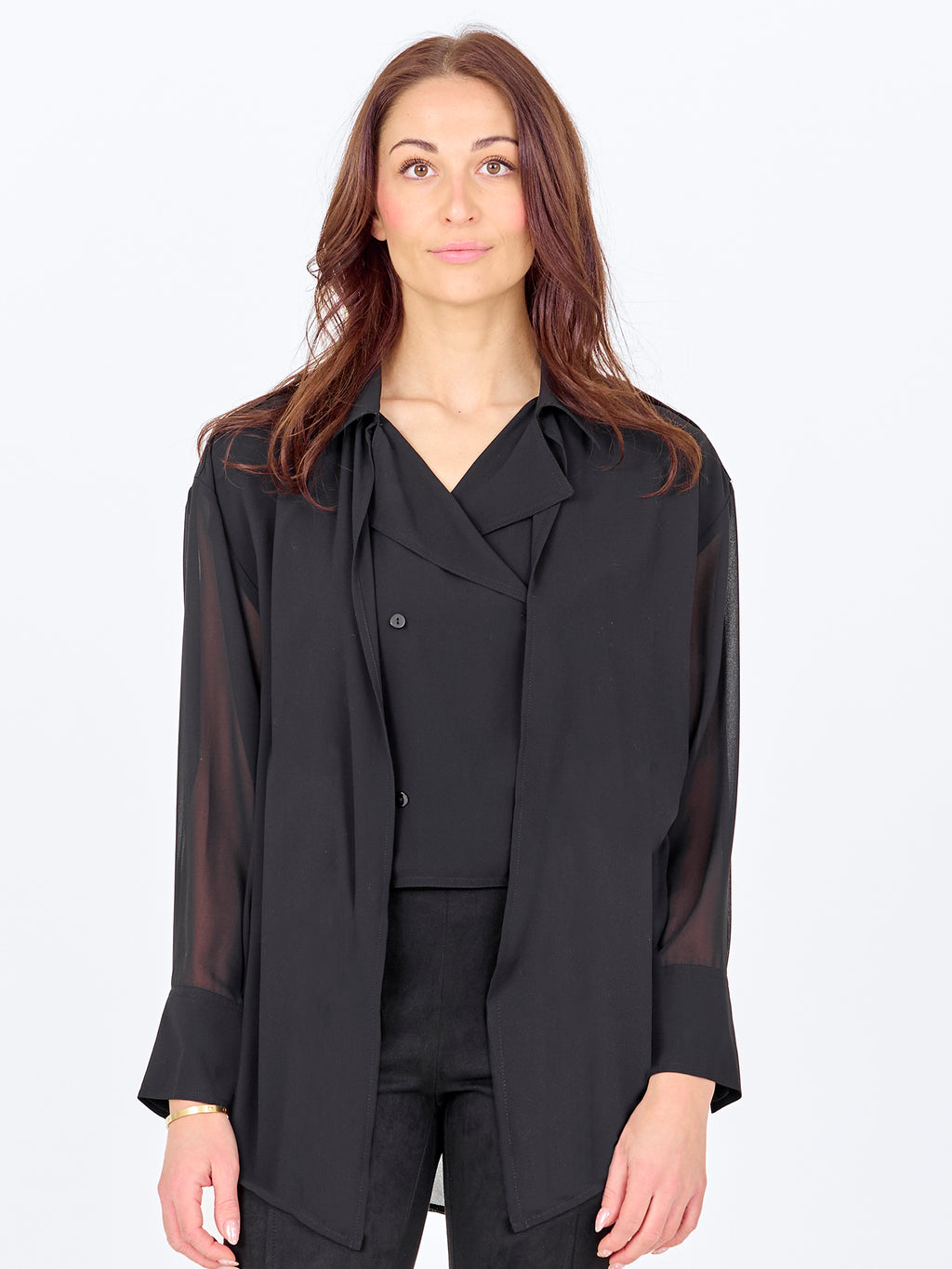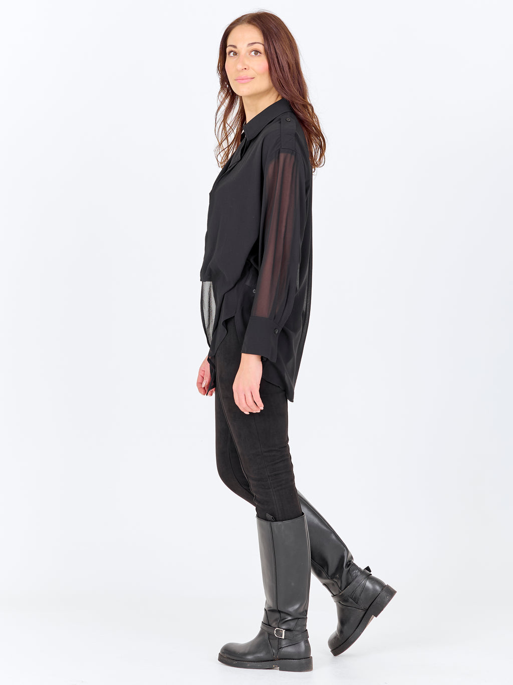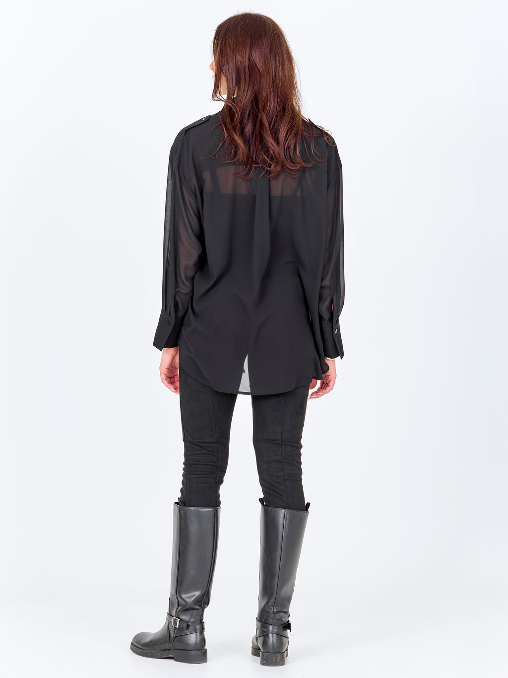 Denne skjorten har et lett og enkelt uttrykk med en løs passform som faller mykt på kroppen. Forsiden er klassisk med krage og knappestolpe, mens baksiden er lett gjennomsiktig med en diskret skuldersøm og legg som gir ekstra bevegelse. De lange ermene avsluttes med mansjetter og understreker den avslappede passformen. Style skjorten over en topp og sammen med bukser eller jeans for et avslappet hverdagsantrekk, eller la den stå åpen som et lett lag.