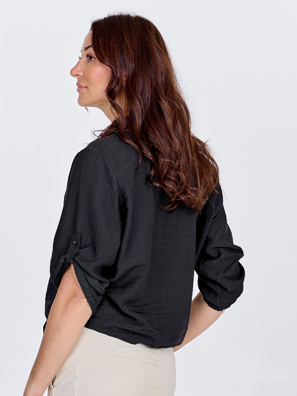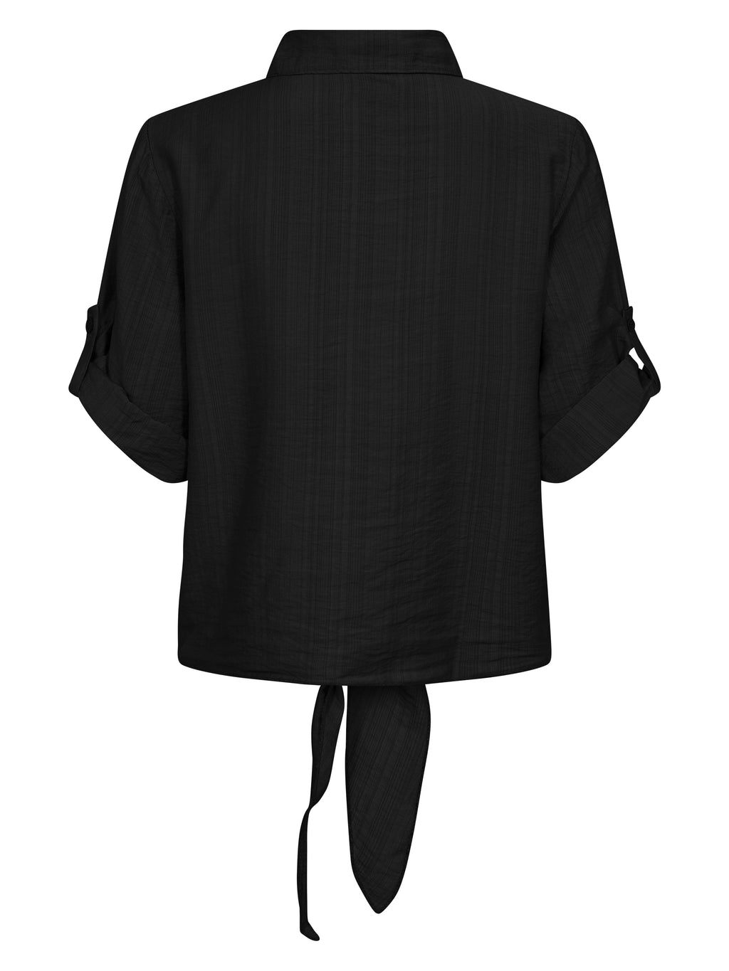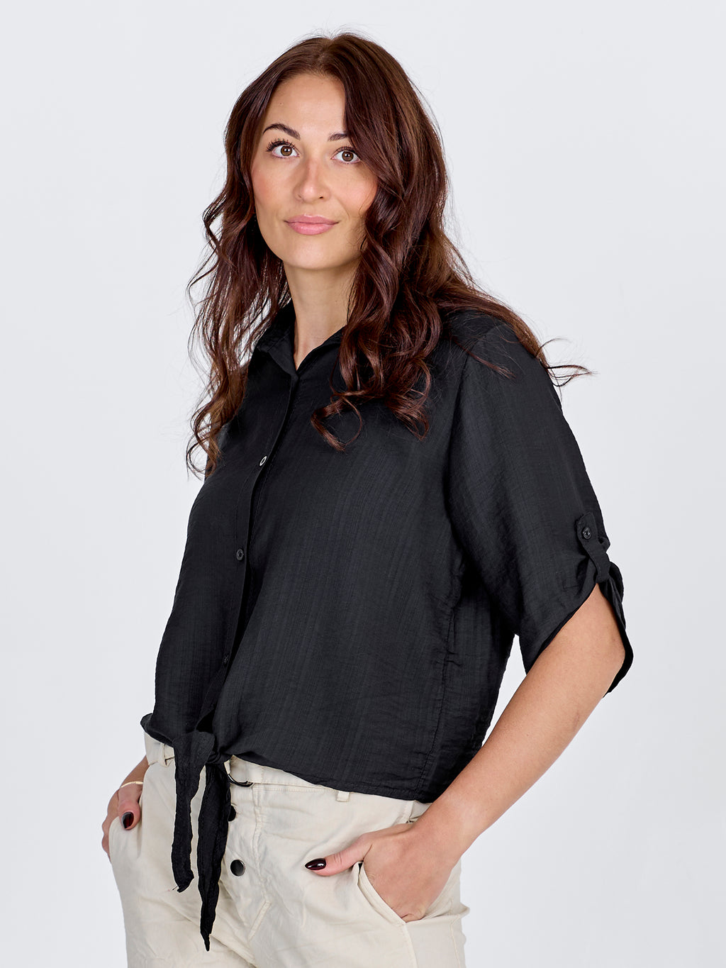 Denne skjorten har et lett og avslappet utseende med korte ermer som kan rulles opp og festes med en løkke. Den lukkes foran med knapper og avsluttes med en dekorativ bånddetalj som gir et feminint preg. Baksiden er enkel og rett skåret. Styl skjorten med løse bukser, en skjørt eller shorts for en avslappet hverdagslook, eller bruk den åpen over en enkel topp på varme dager.