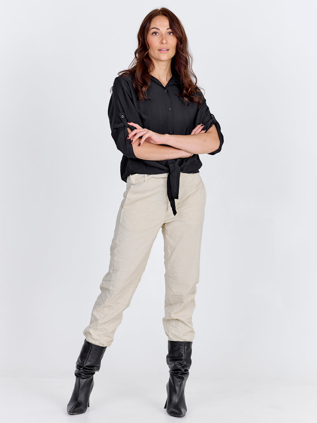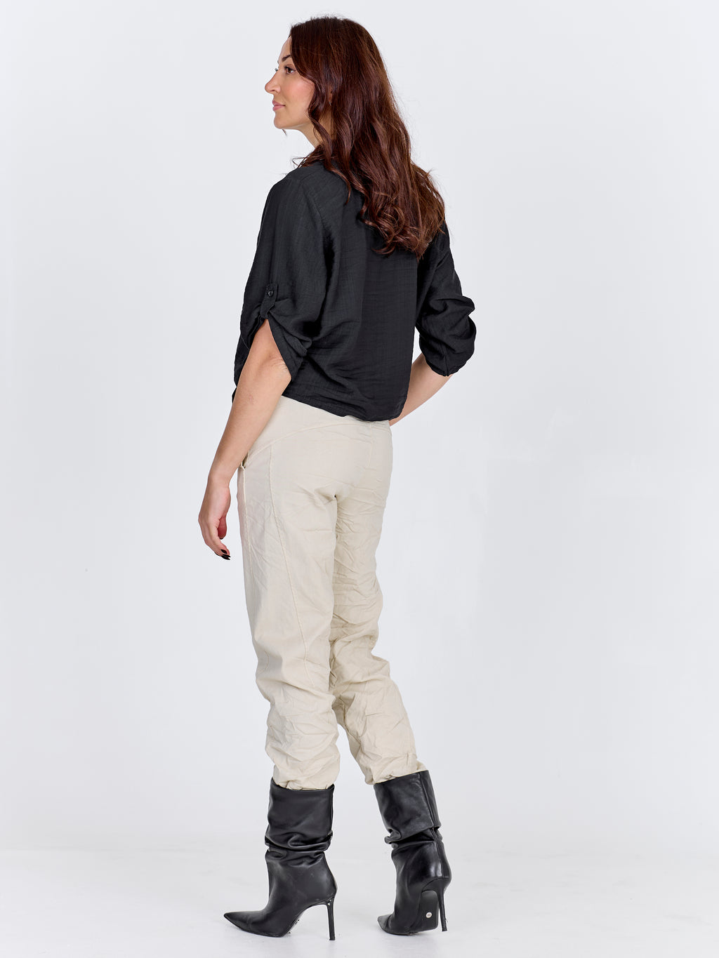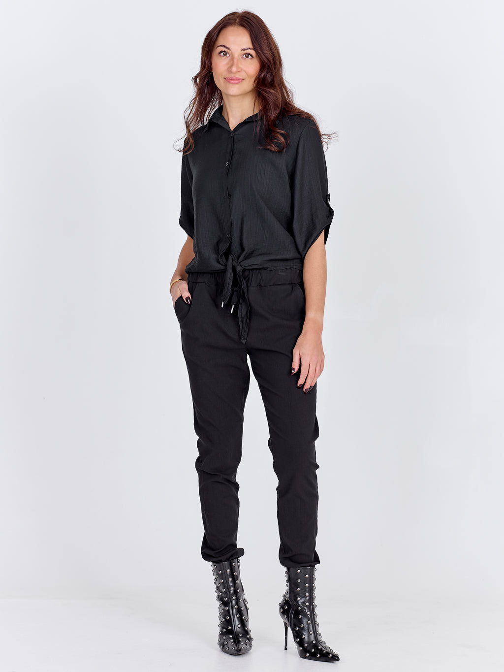 Denne skjorten har et lett og avslappet utseende med korte ermer som kan rulles opp og festes med en løkke. Den lukkes foran med knapper og avsluttes med en dekorativ bånddetalj som gir et feminint preg. Baksiden er enkel og rett skåret. Styl skjorten med løse bukser, en skjørt eller shorts for en avslappet hverdagslook, eller bruk den åpen over en enkel topp på varme dager.