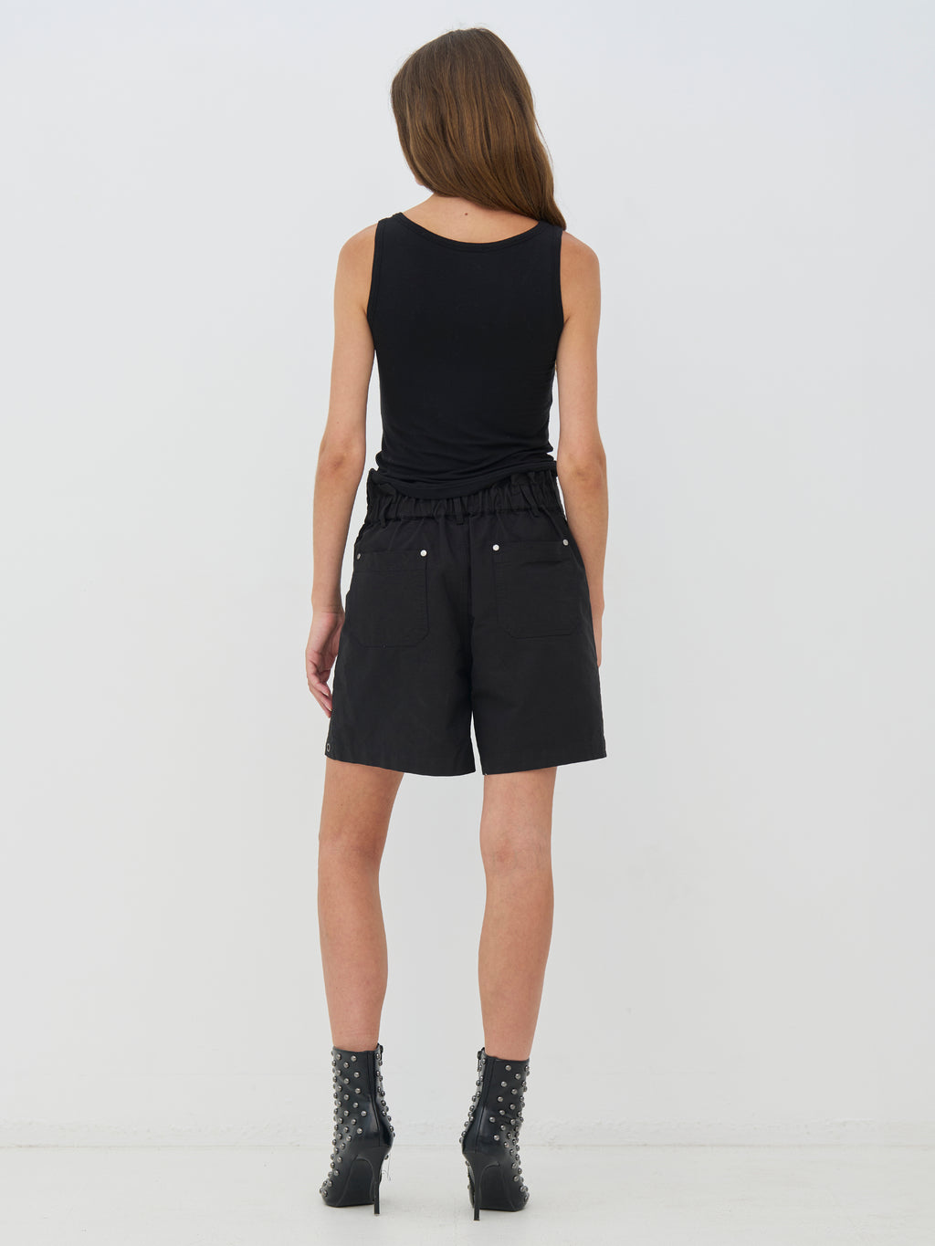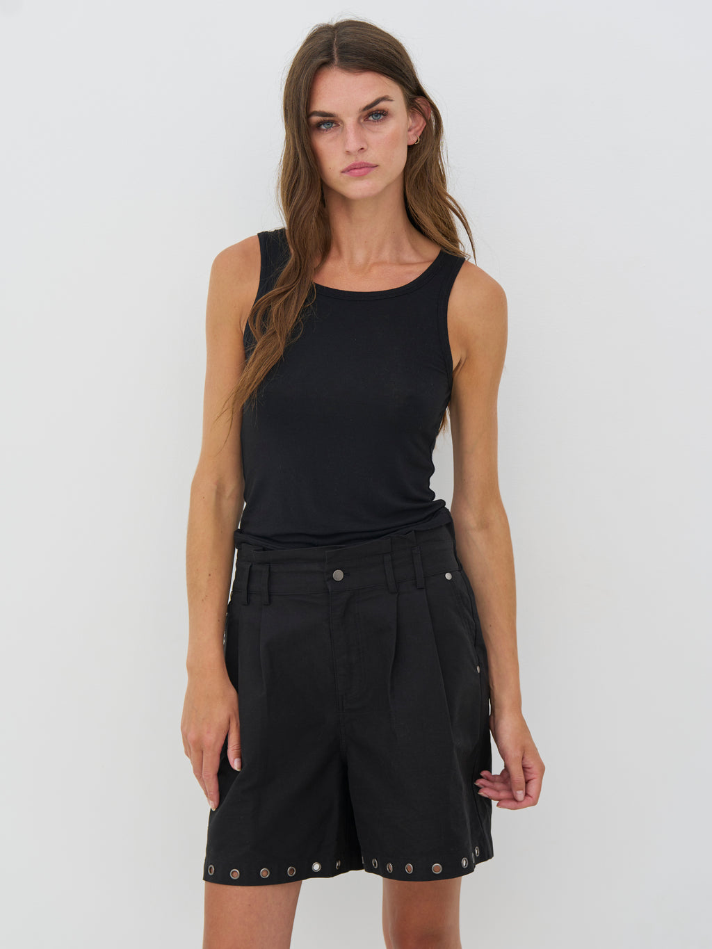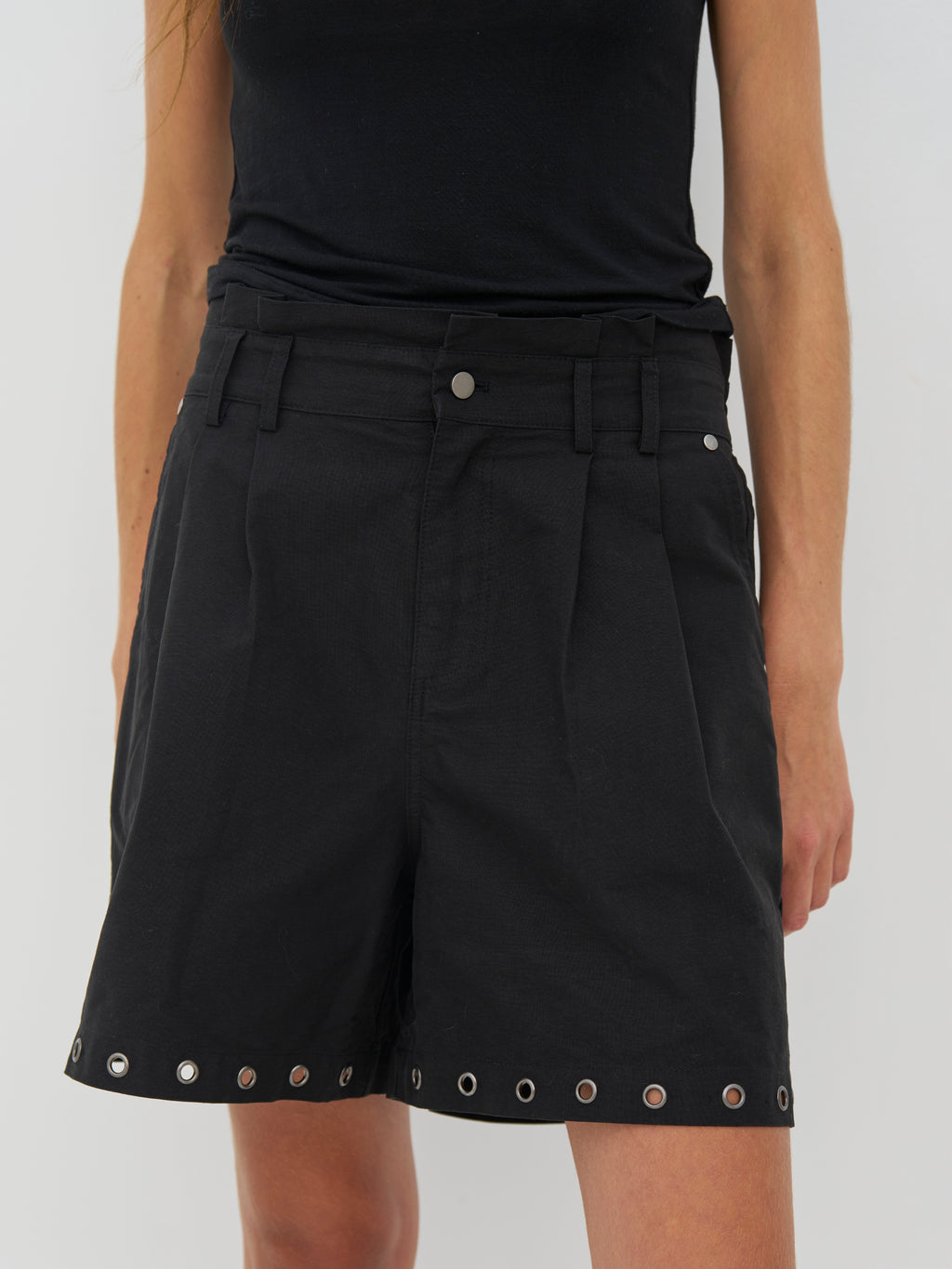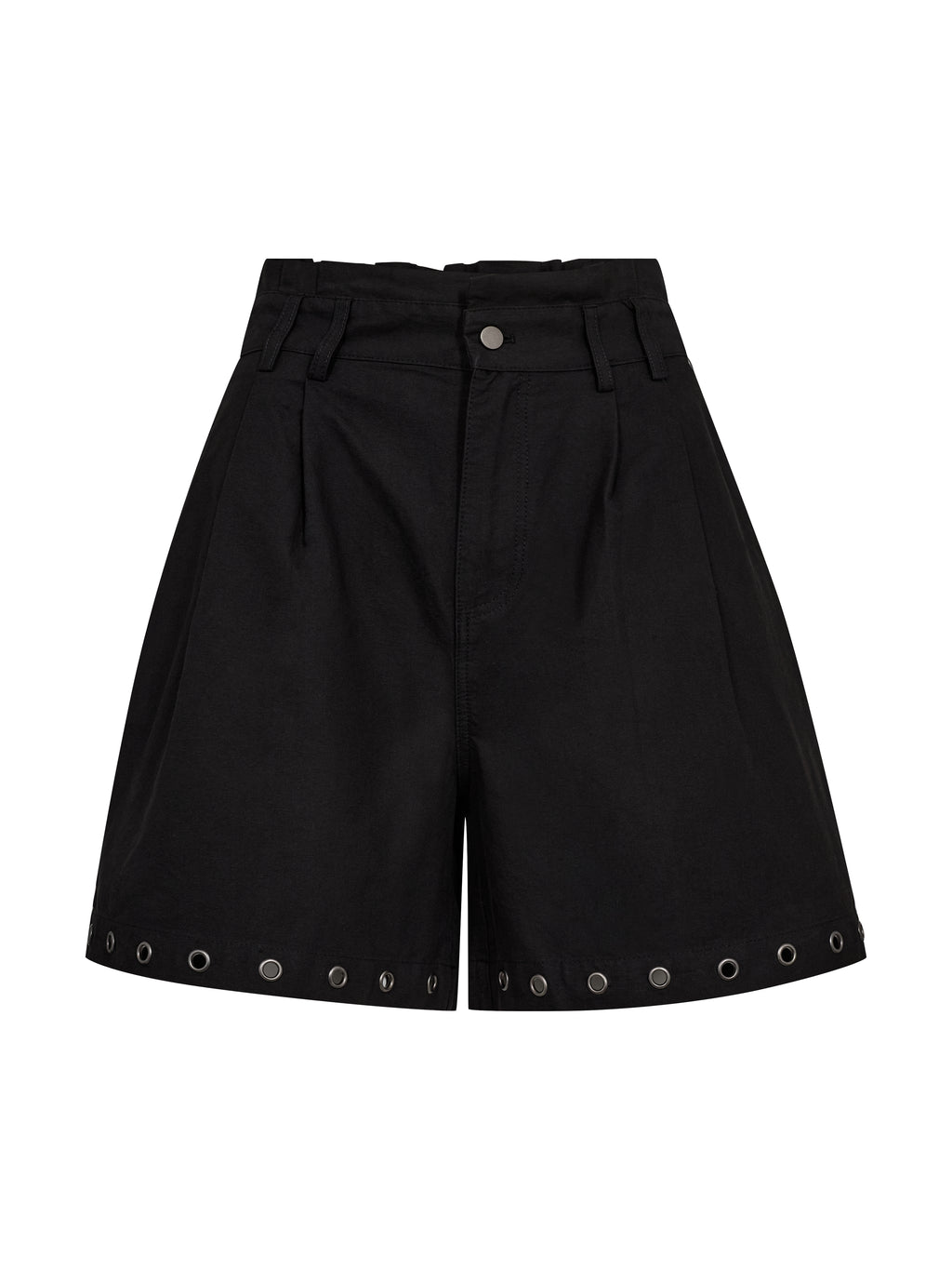 Disse shortsene har et enkelt og markant uttrykk med en rett passform og fine legg foran, som gir litt ekstra form. De små metalløkkene langs kanten tilfører en rå tvist og gjør designet mer karakteristisk. Shortsen sitter komfortabelt i livet og fungerer godt både til hverdagsbruk og mer avslappede stiler med en topp, skjorte eller lettstrikk.
