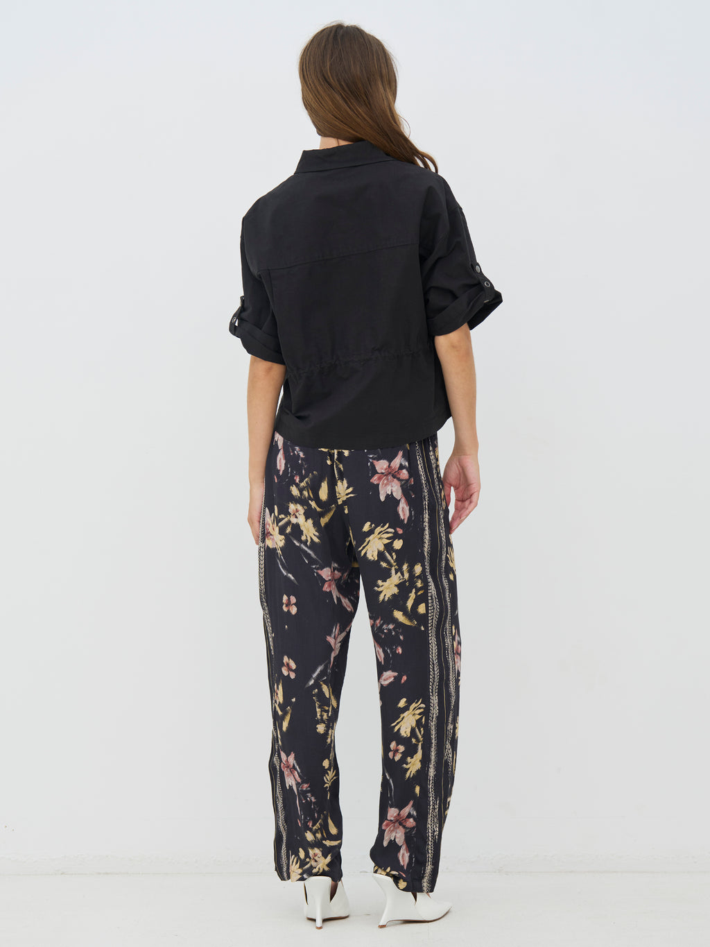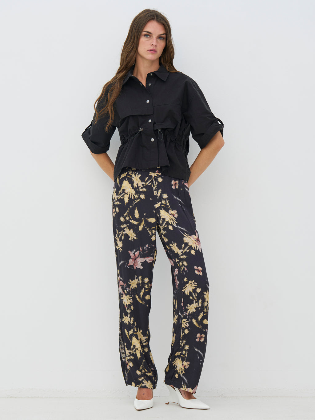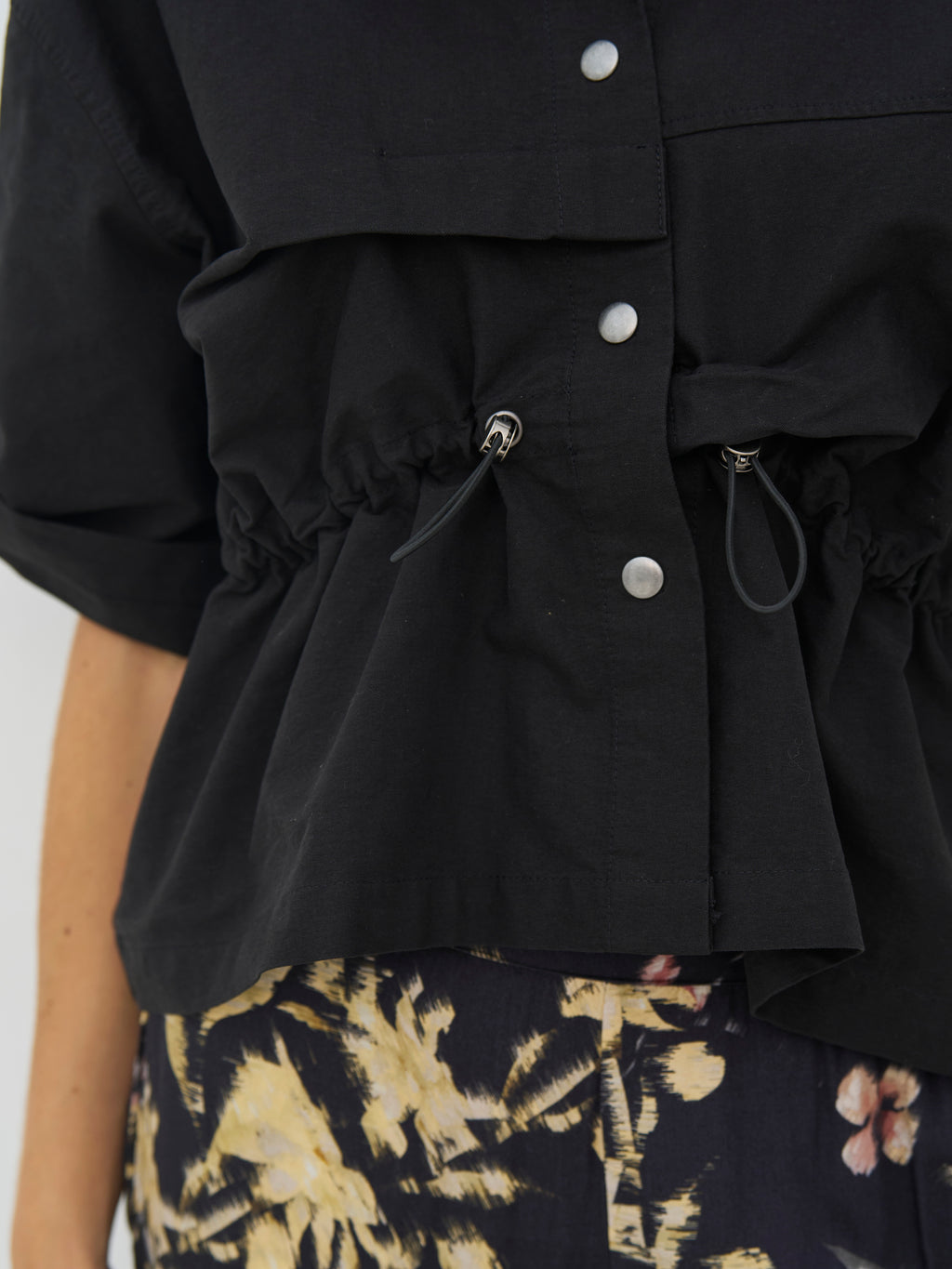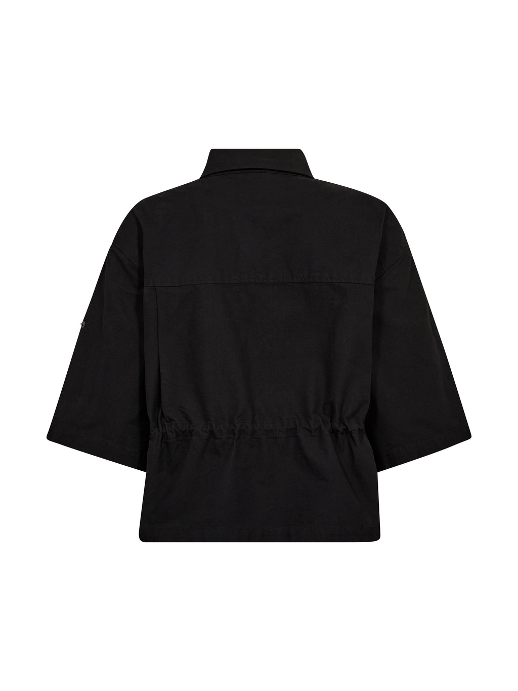 Denne svarte skjorten har et gjennomført og funksjonelt uttrykk med korte ermer og klassisk krage. Foran lukkes den med trykknapper, og den justerbare snoren i livet gjør at du kan forme passformen etter behov. De lette rynkene tilfører et tøft preg, mens baksiden er holdt enklere og faller pent. Skjorten fungerer både lukket og åpen og er enkel å style med både bukser og skjørt.
