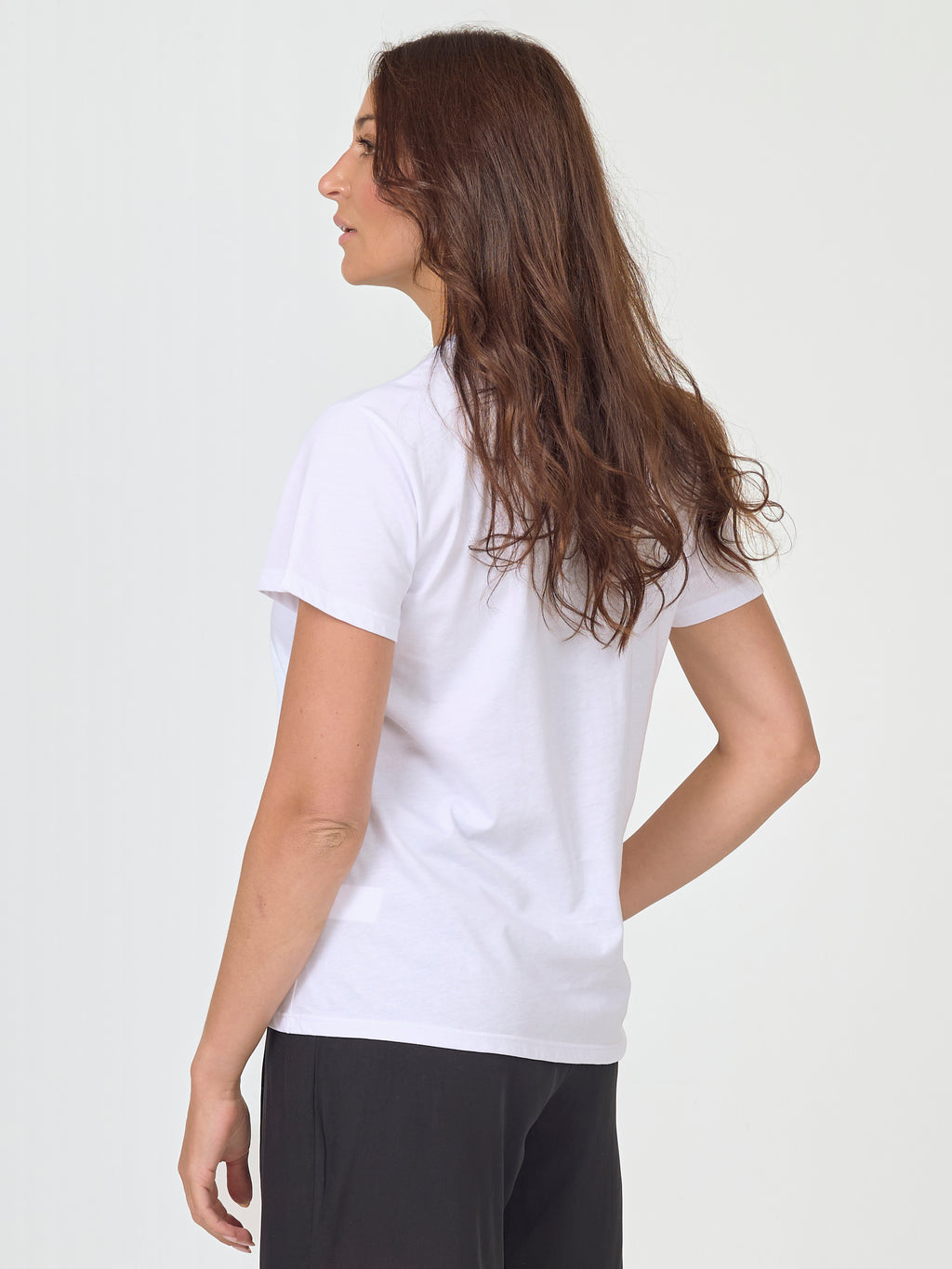 Et moderne basisplagg med et kreativt preg - denne t-skjorten har et iøynefallende, abstrakt trykk på forsiden, som gir karakter til ellers enkelt silhuett. Den er laget i en myk bomullskvalitet med rund hals og korte ermer, noe som gjør den både komfortabel og allsidig for daglig bruk.