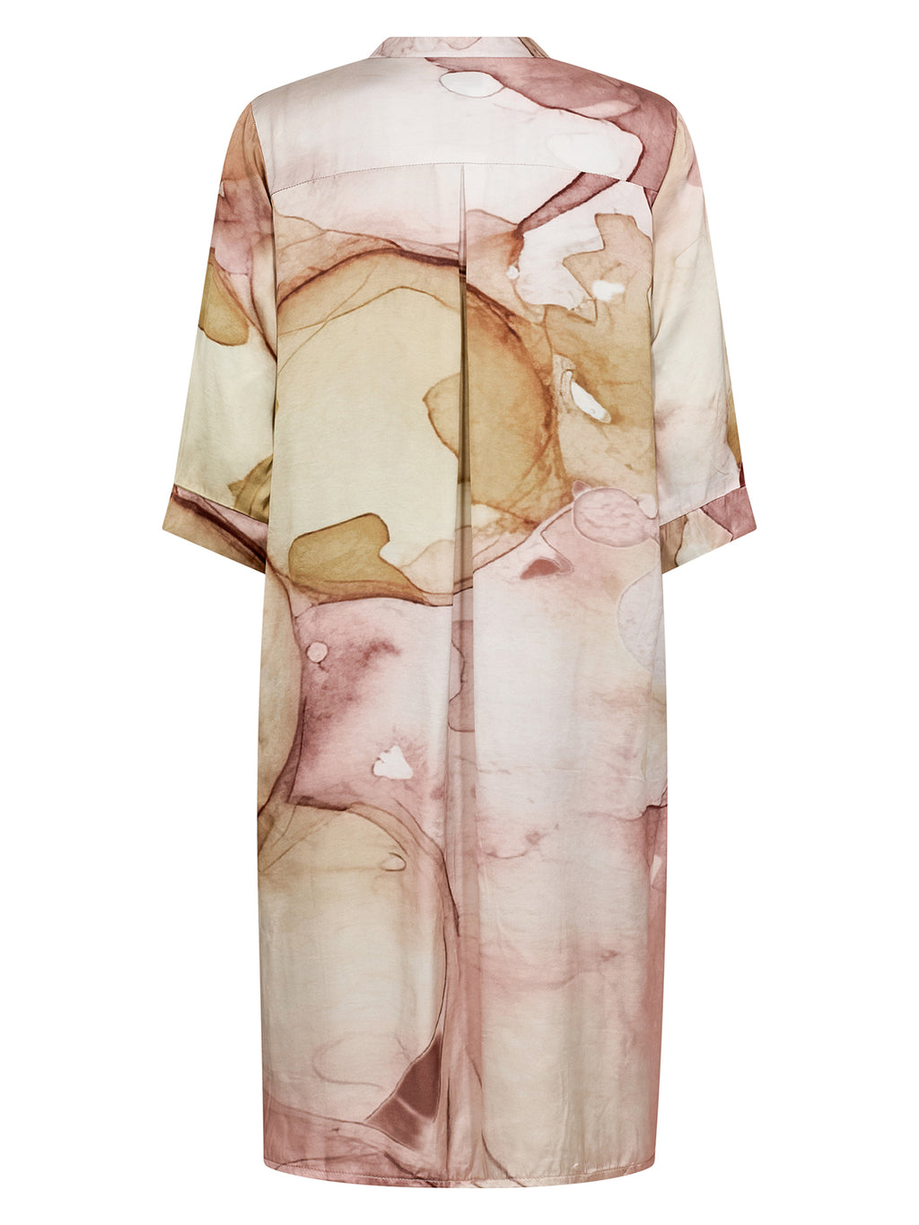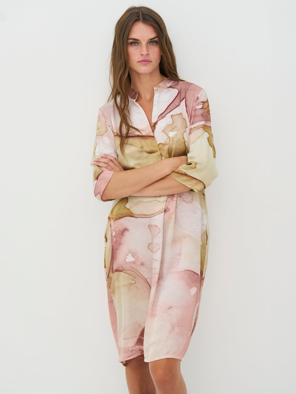Denne tunikakjolen har et enkelt snitt og en rett passform som faller lett og behagelig langs kroppen. Den åpne V-halsen gir et elegant utseende, mens de 3/4 ermelengdene legger letthet til silhuetten.