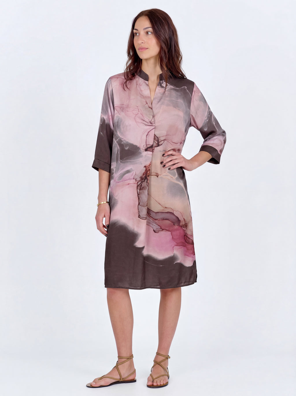 Denne tunikakjolen har et enkelt snitt og en rett passform som faller lett og behagelig langs kroppen. Den åpne V-halsen gir et elegant utseende, mens de 3/4 ermelengdene legger letthet til silhuetten.