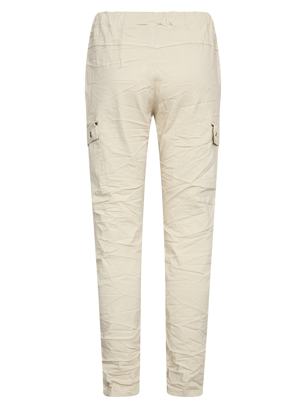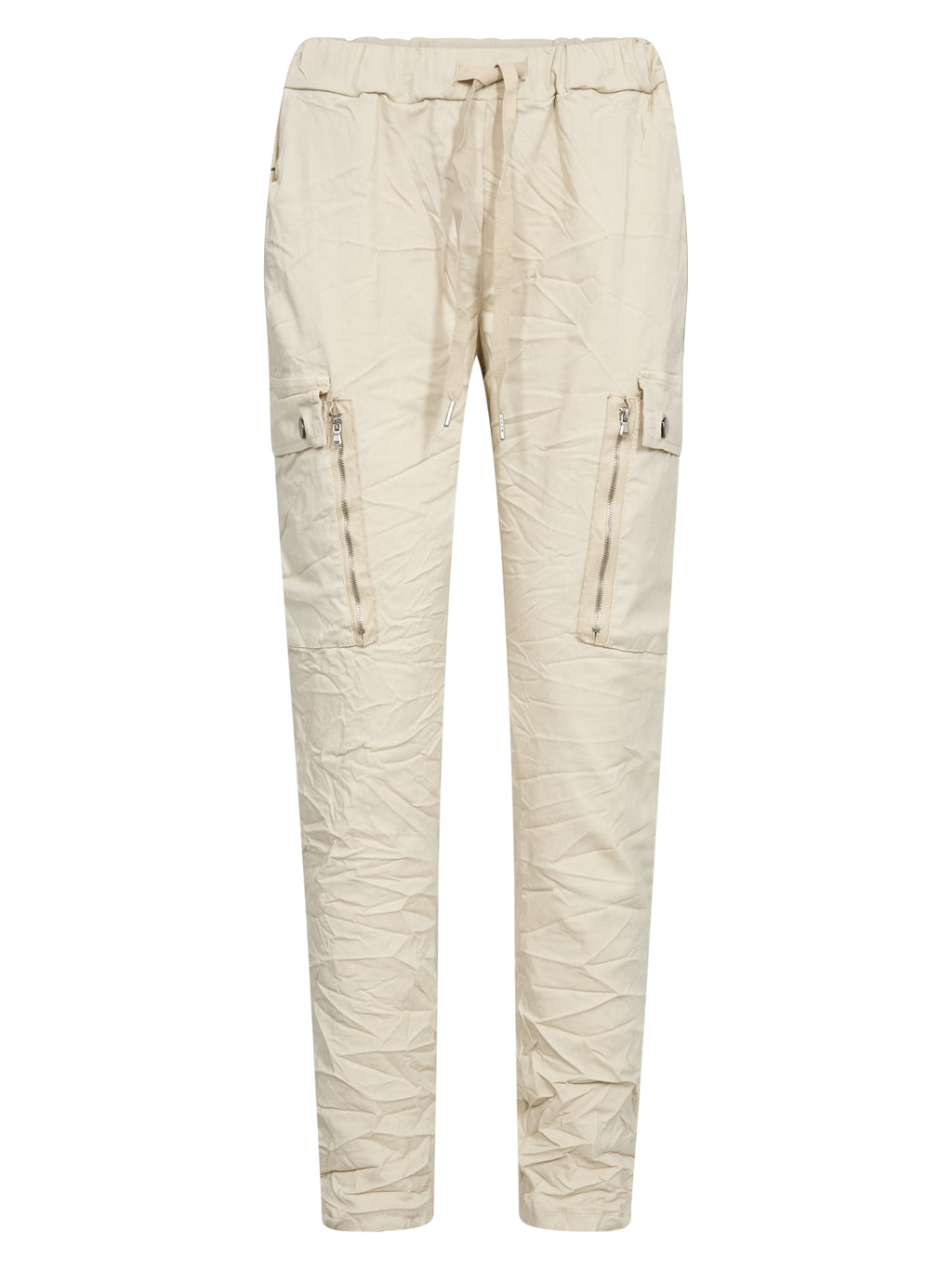 Disse kule buksene kommer i herlig bomullskvalitet med god stretch. Buksene har en litt løs passform og en elastisk midje med et snørebånd, som sikrer fantastisk komfort. På midten av buksene er det to store knappede lommer og en lang dekorativ glidelås, som tilføyer et rått detalj.