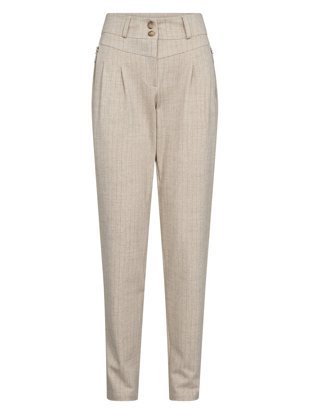 Disse klassiske buksene har en tidløs passform med lett avsmalnede ben og legg som gir et skarpt og elegant utseende. De har en dobbel knappelukking foran, diskrete legg, sidelommer og dekorative baklommer. Stoffets subtile tekstur legger til en raffinert touch til det enkle designet.
