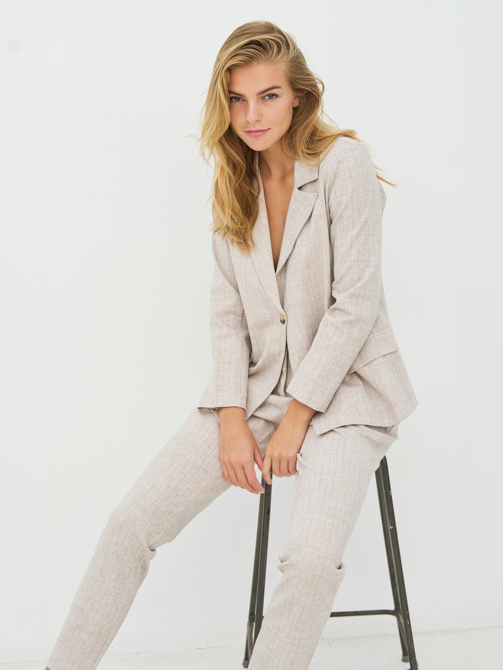Forhøy din hverdagslige look med denne elegante blazeren som kombinerer klassiske detaljer med et moderne snitt. Den har en enkelt knappelukking foran, spiss revers og to klafflommer foran som fullender den elegante uttrykket. Det subtile, vertikale mønsteret legger til et raffinert preg på blazeren, og den lett strukturerte kvaliteten gir komfort.