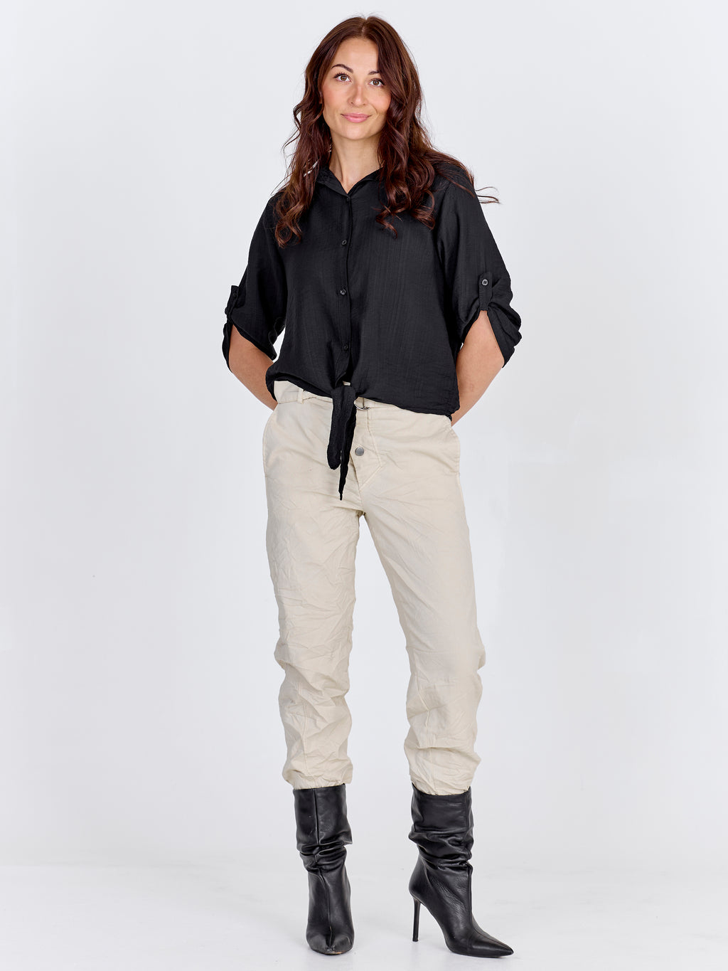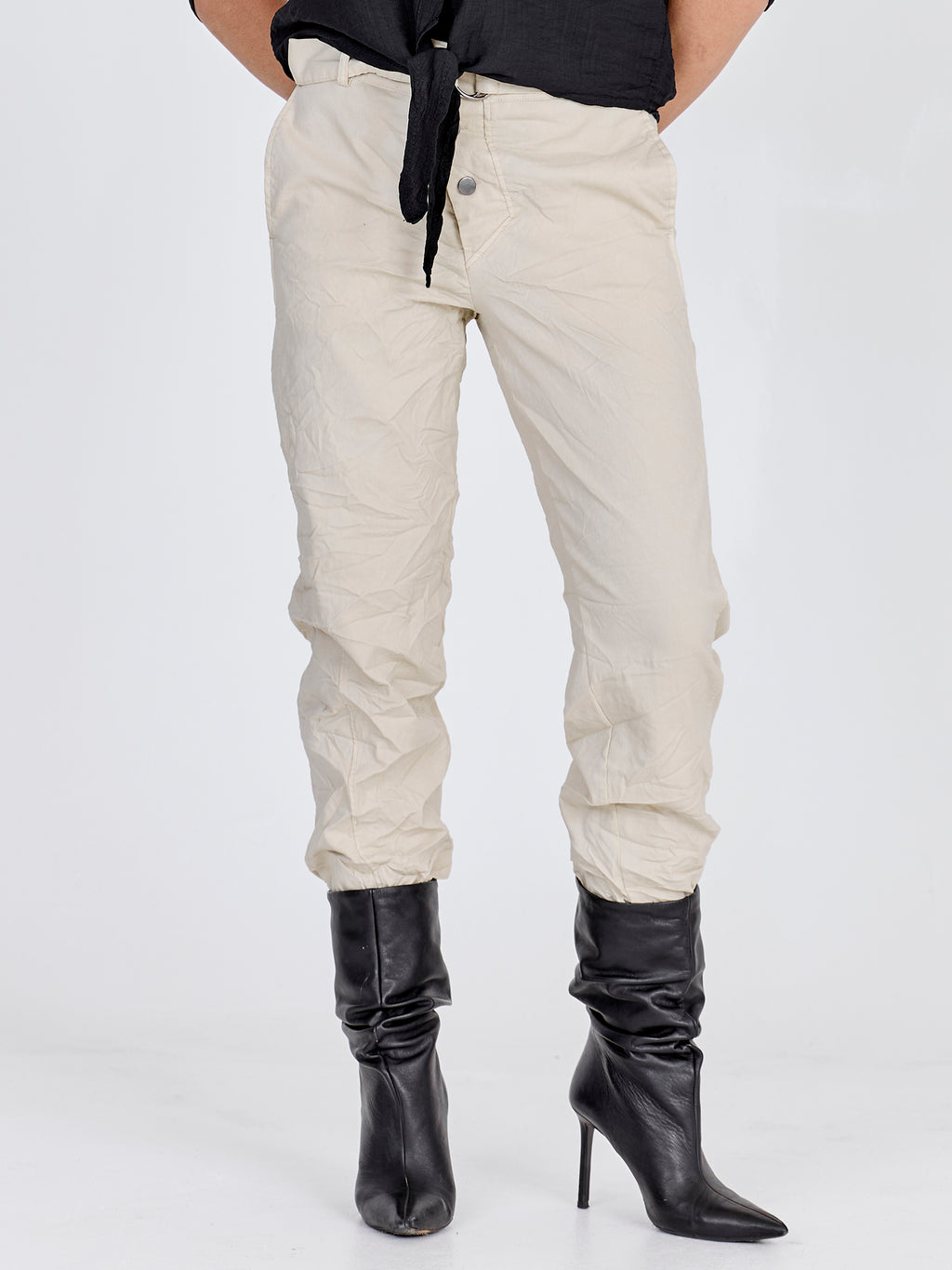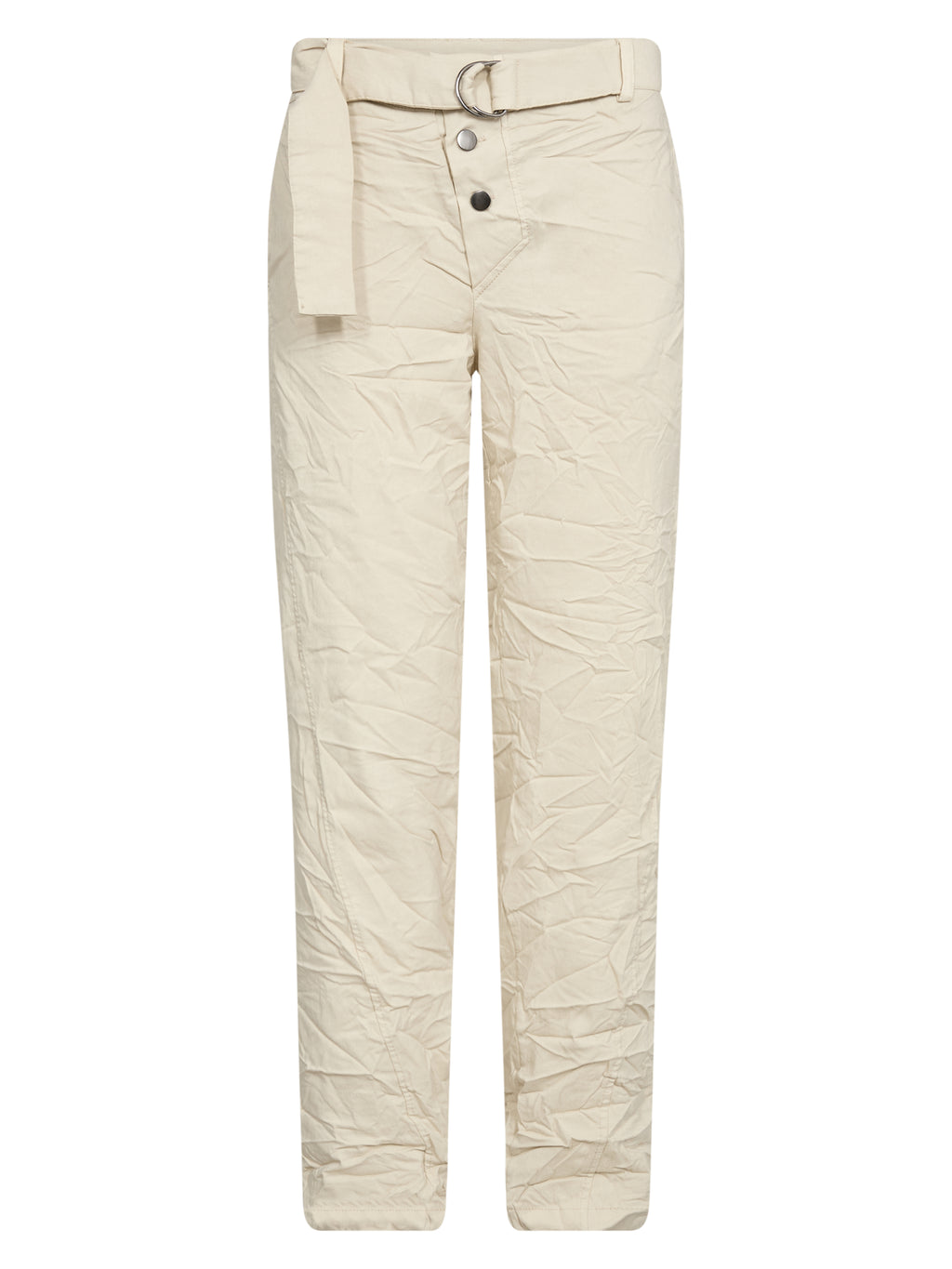 Disse buksene er designet med et smalt ben og en markant linning, som gir et enkelt og tidløst utseende. Foran har de en skrå knappelukking og belte med metallring som legger til en ren og stilig detalj. Bak er snittet rent med beltestropper og markeringer som fremhever passformen. Style dem med en lett strikkegenser eller en skjorte for et avslappet, men gjennomtenkt utseende til hverdagsbruk.