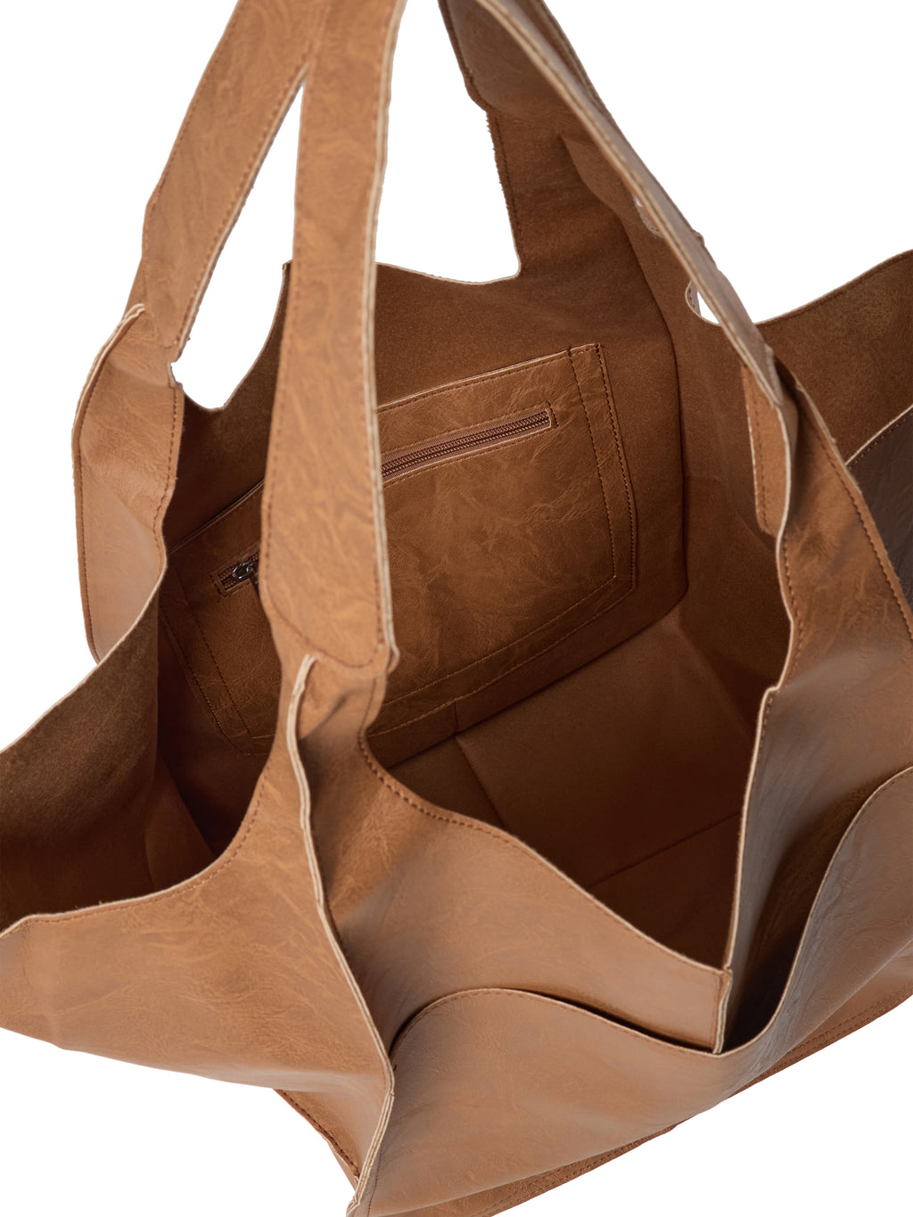 Enkel og romslig – denne vesken er et allsidig valg for både hverdags- og helgebruk. Den har et mykt og fleksibelt materiale som gir et avslappet uttrykk, mens de brede stroppene gjør den behagelig å bære over skulderen. Vesken har et enkelt design med synlige sømmer og ingen lukking, noe som gjør den enkel å bruke og rask å pakke.