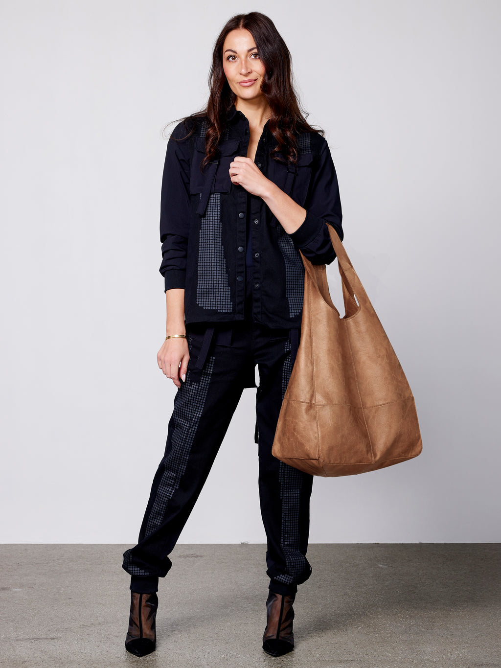 Styl vesken med en lang cardigan og joggesko for et avslappet og funksjonelt utseende.