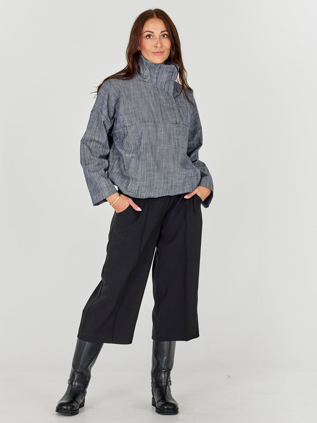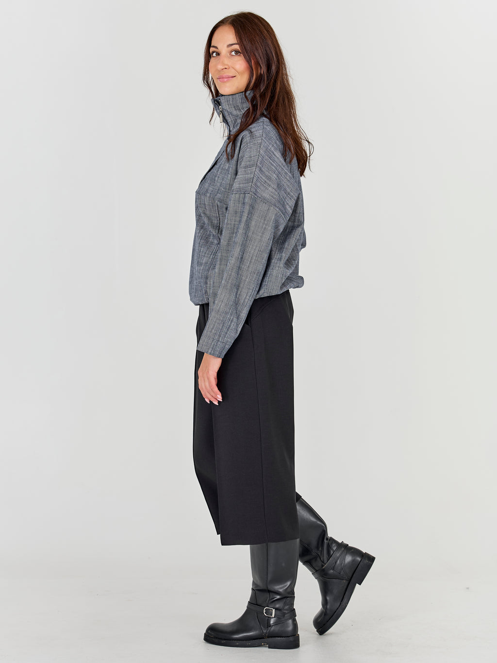 Disse shortsene har en løs passform og en lengde som når til midten av leggen, noe som skaper et moderne og luftig utseende. De har frontfolder, skrå lommer og en asymmetrisk knappelukking i midjen. Den elastiske linningen i ryggen sikrer komfort og bevegelsesfrihet.