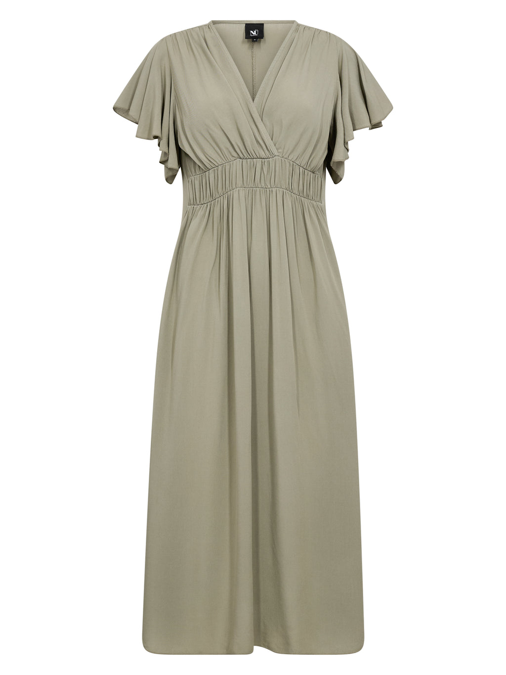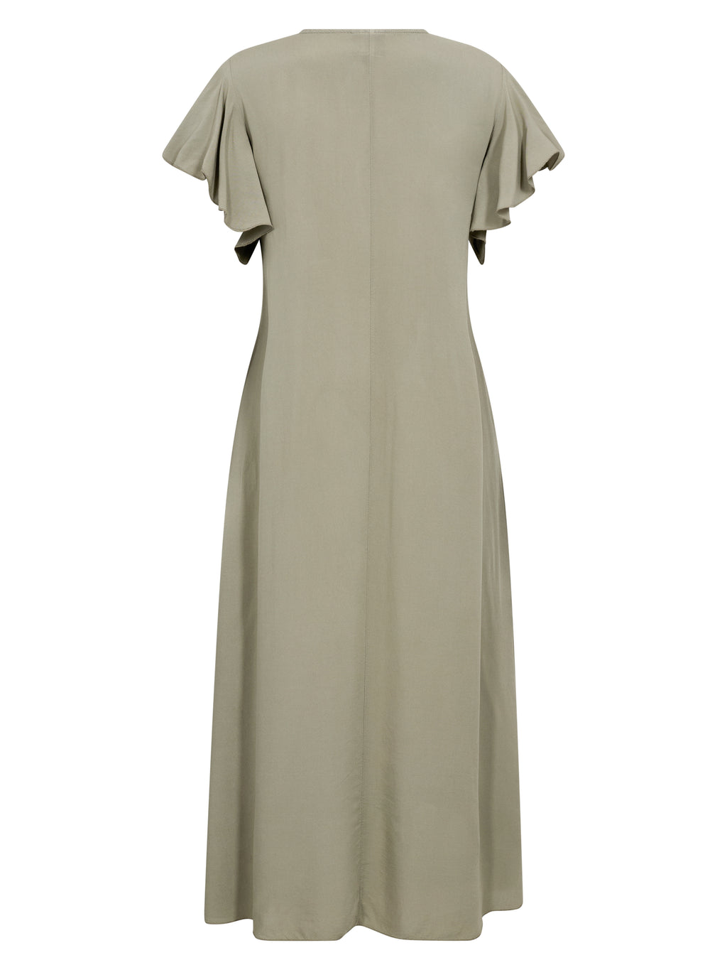 Kjolen har en myk og feminin passform med v-hals og en liten delikat erme. Et smalt elastisk bånd foran skaper en smigrende silhuett og gir en naturlig fall. Ryggen er enkel og jevn, og understreker kjolens elegante utseende. De lette materialene og den løse passformen gjør den behagelig å ha på hele dagen.