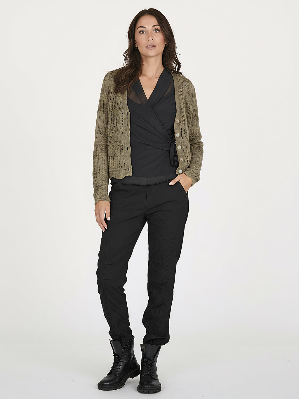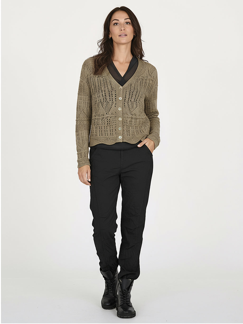 Denne strikkede cardiganen tilbyr en vakker kombinasjon av mønstret strikking og feminine detaljer. Den er laget i et lett materiale med blondestrikker i ulike varianter og har en elegant V-hals. Nacre-knapper foran og en bølgekant langs kanten og ermene fullfører det romantiske utseendet.