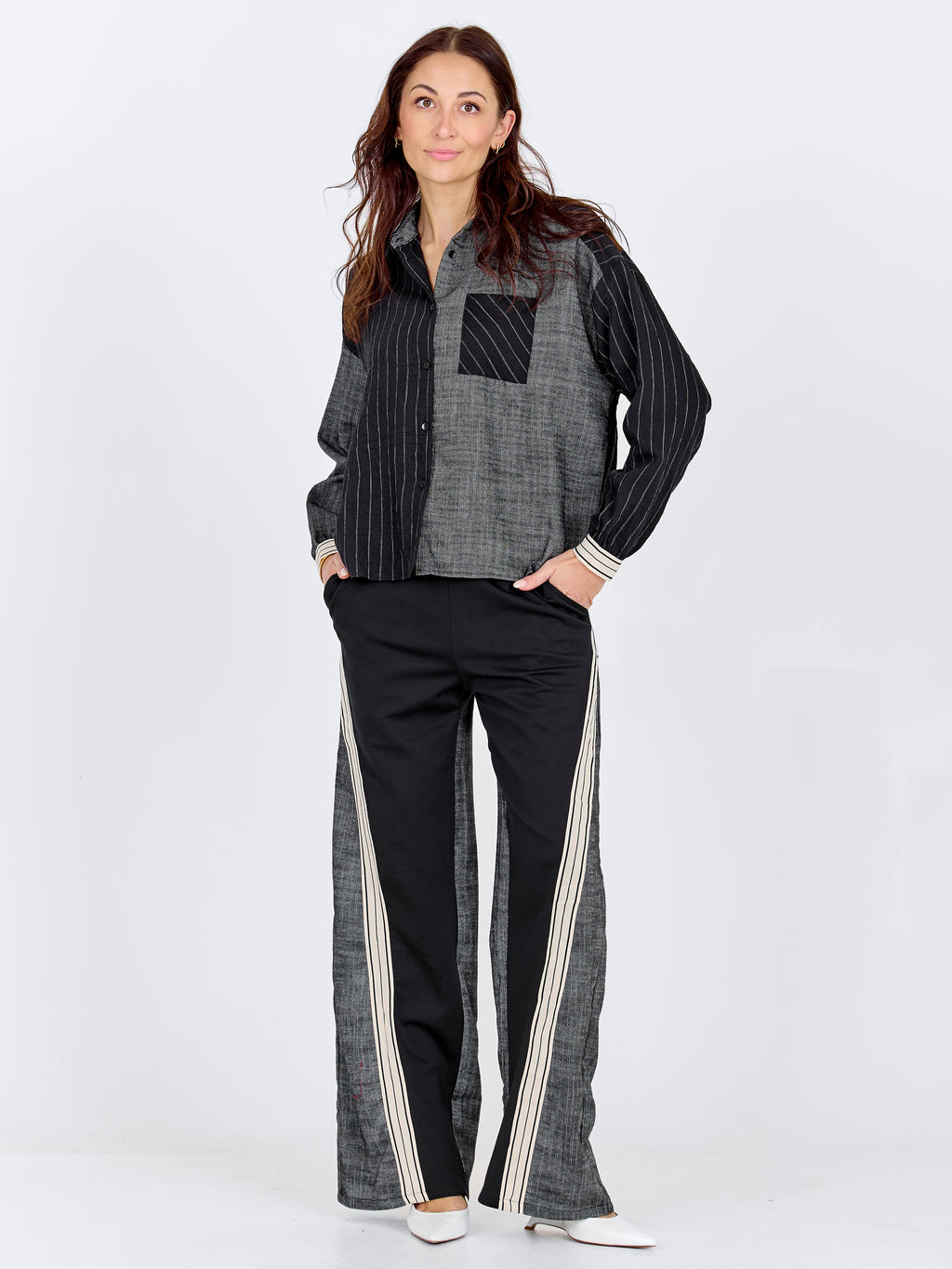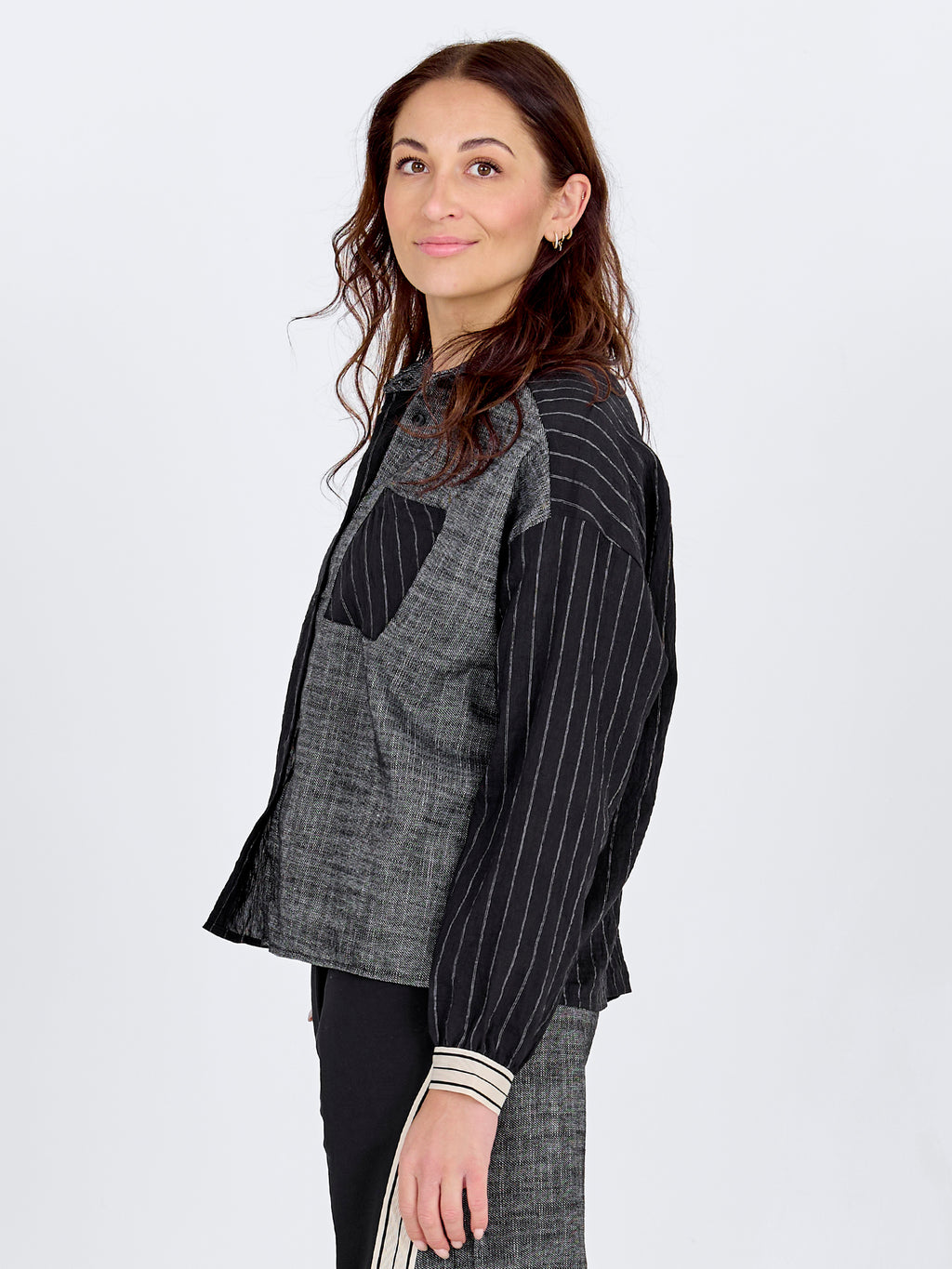 Denne skjorten kombinerer ulike teksturer og striper i et moderne patchwork-design. Den har korte ermer, en klassisk krage og en gjennomgående knappelukking. På brystet er det en enkelt lomme med vertikale striper som står i kontrast til det asymmetriske mønsteret på forsiden. Ryggen fortsetter det stripede utseendet og gir en harmonisk avslutning.