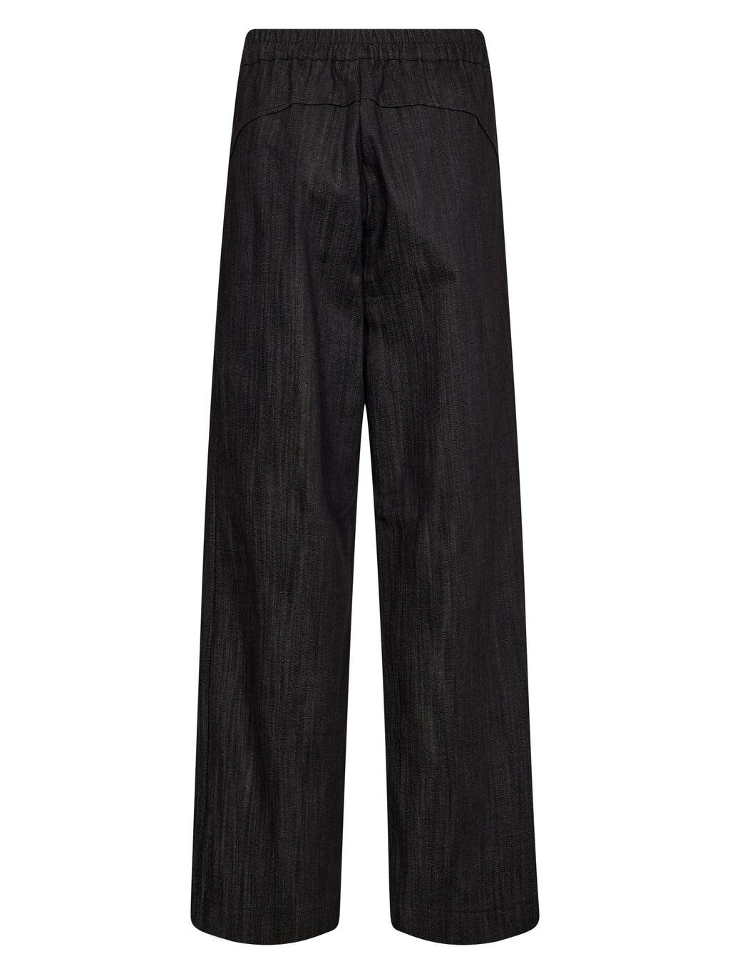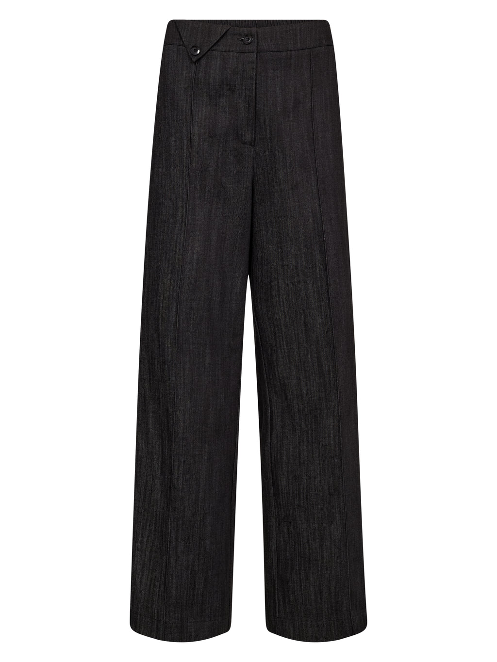 Disse buksene har et klassisk, rent utseende med brede, rette ben og en glatt, strukturvevd kvalitet som draperer pent rundt bena. Midjen er lukket med knapp og glidelås, og designet er holdt enkelt og allsidig - perfekt for både avslappede og mer formelle utseender.