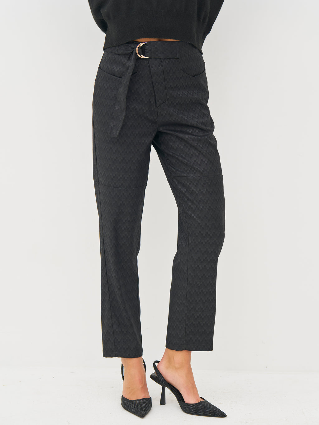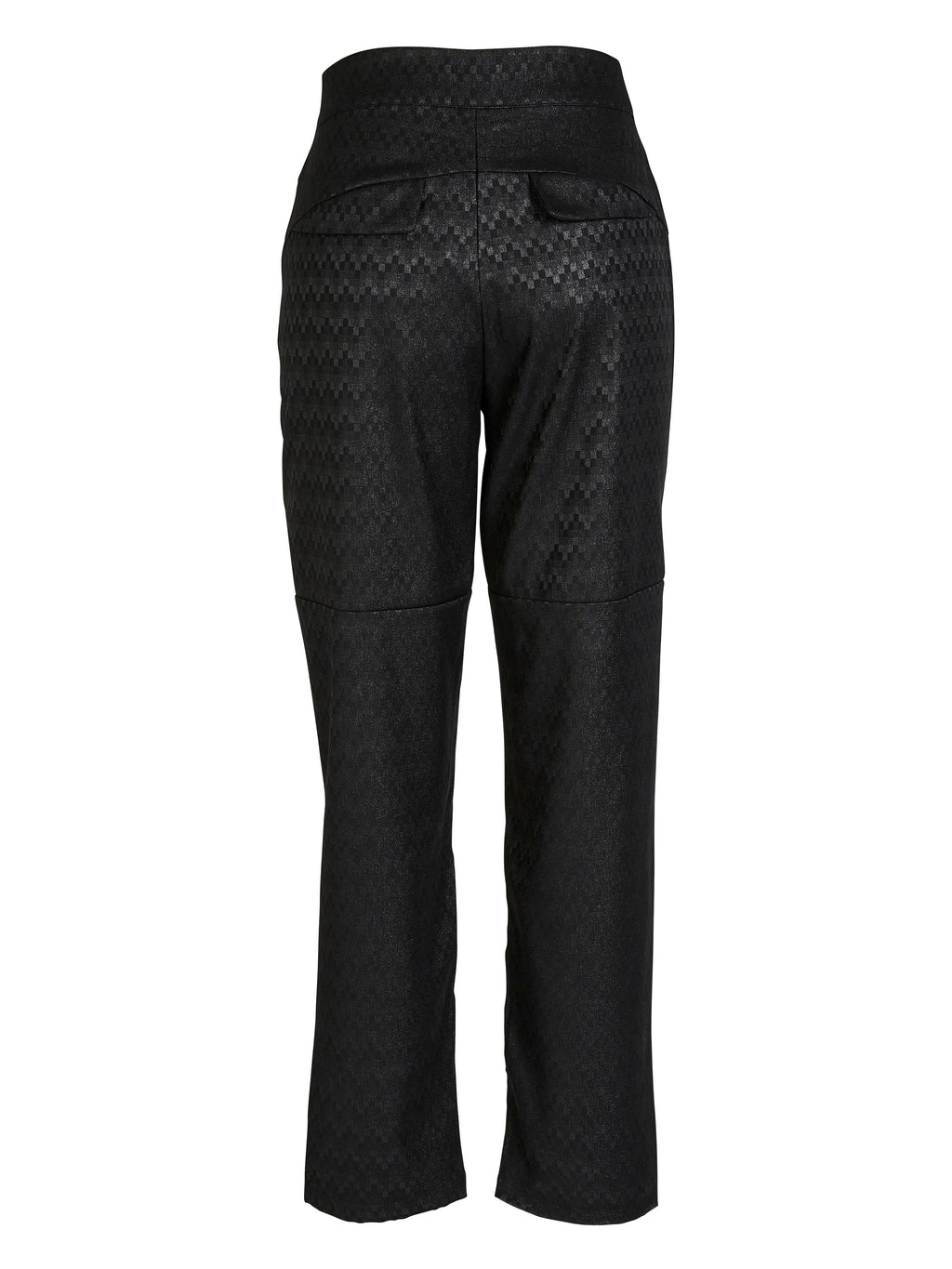 Buksene har et diskret, men iøynefallende mønster, som gir stoffet en eksklusiv uttrykksform. De rette beina og den faste linningen skaper en elegant silhuett, mens beltet med D-ring legger til et stilig element og sikrer en justerbar passform. De fremre lommene er funksjonelle, mens de stikklommer bak fullfører det sofistikerte designet. Knesømmer gir ekstra struktur.