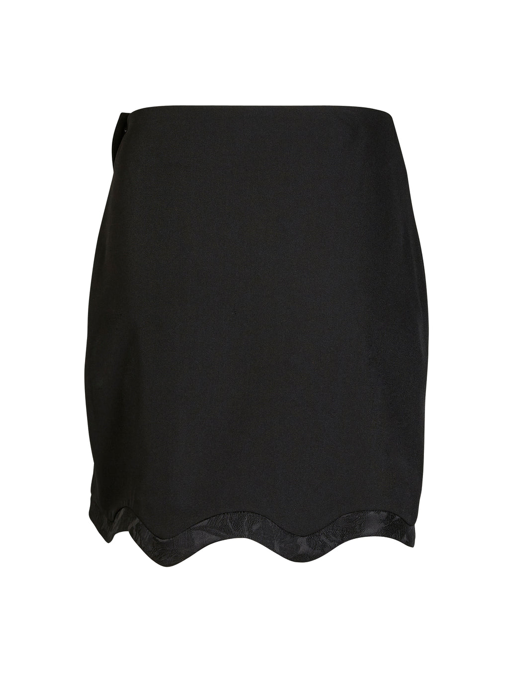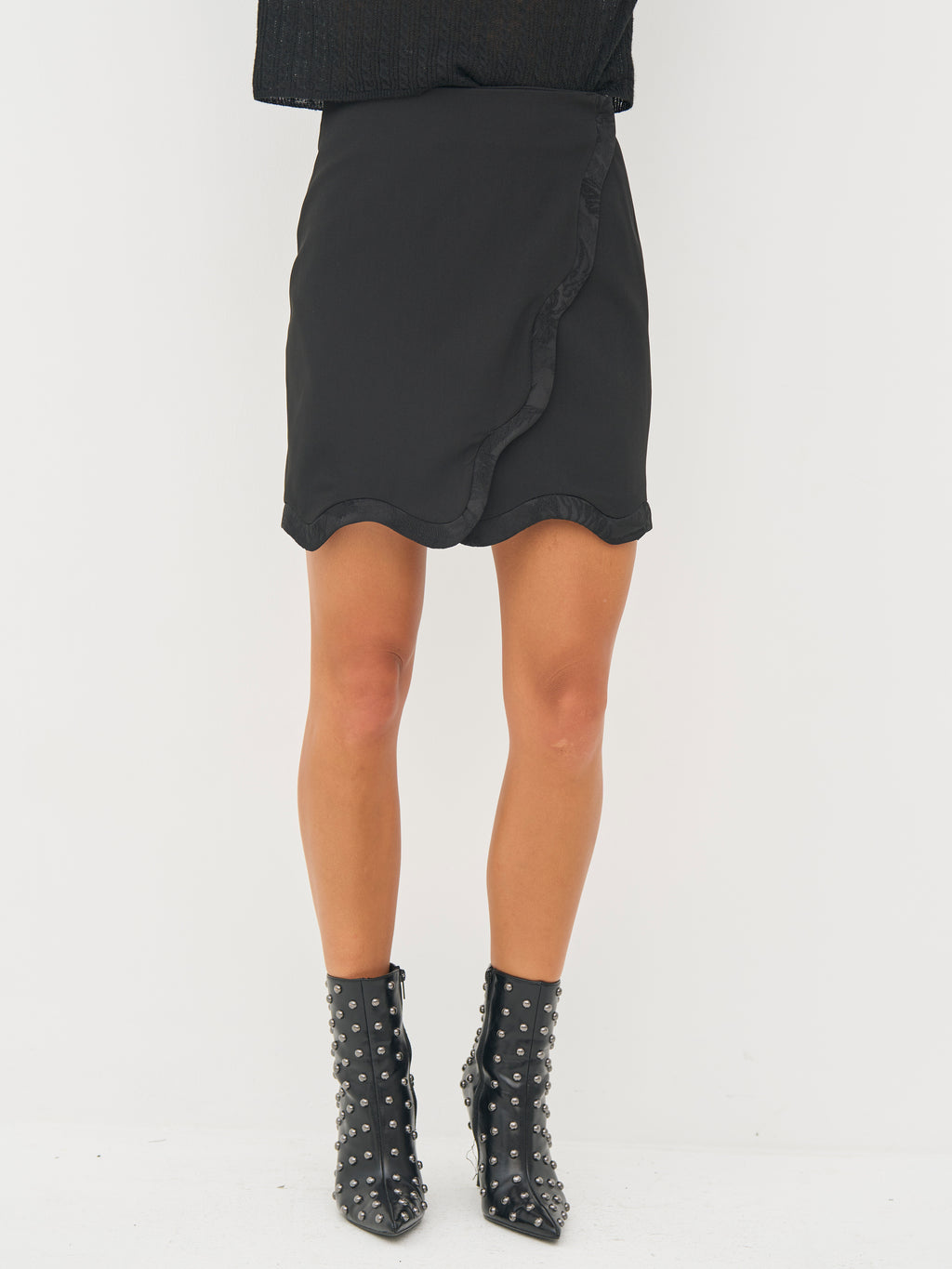 Denne elegante skjørtet har en enkel og feminin uttrykk med sitt omslag design og bølgete kant. Det lukkes diskret med knapper på venstre side, som også legger til dekorativt detalj. En blank kant med lett tekstur fremhever silhuetten og gir skjørtet et sofistikert preg.