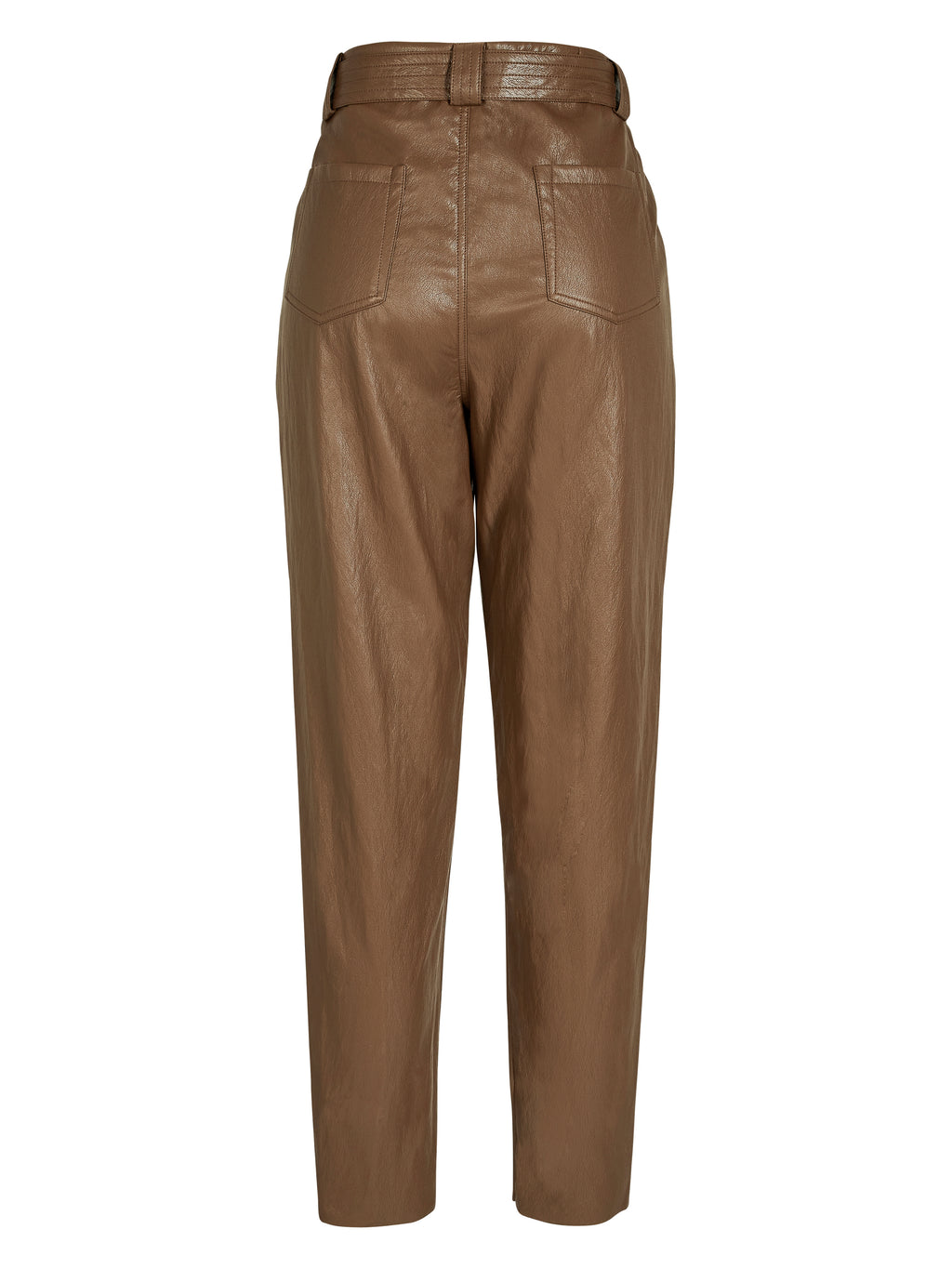 Skap en stilig look med disse buksene i imitert skinn, som elegant kombinerer struktur og mykhet. De har en rett, lett avsmalnende beinform og høy midje med belte som fremhever silhuetten på en smigrende måte. De synlige frontlommene og påsydde baklommene legger praktiske detaljer til det fullførte designet.