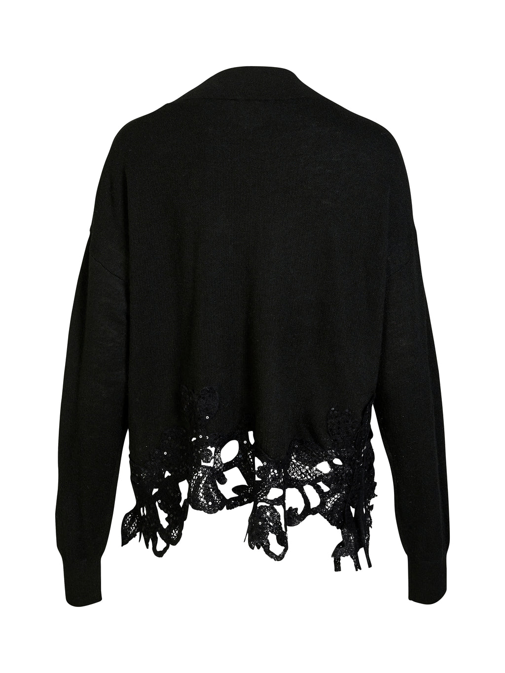 Gi antrekket ditt en eksklusiv touch med denne strikkede ponchoen med dekorativ blonderkant. Den har en avslappet passform og rund halsutringning, mens den fremtredende blonderkanten nederst legger til et feminint og festlig utseende. Det lett gjennomsiktige blonderpanelet er prydet med små paljetter som fanger lyset og skaper en subtil glans.