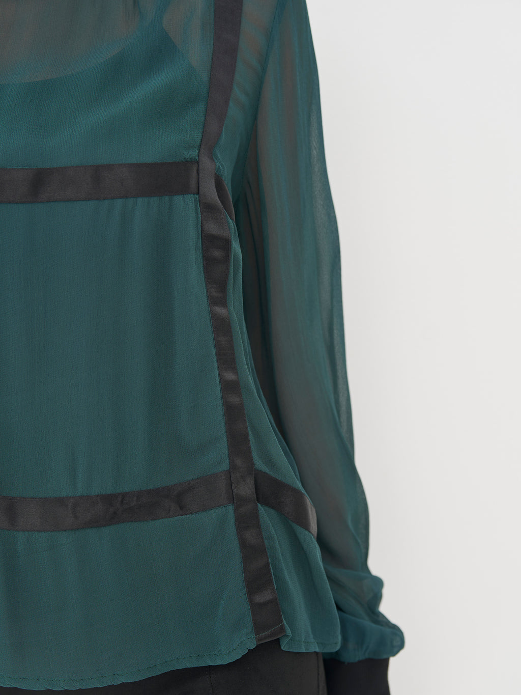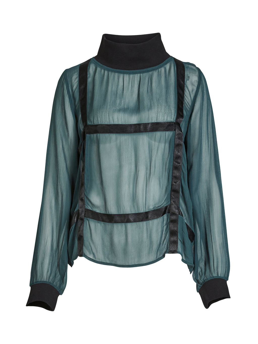 Skill deg ut med denne stilige blusen i lett gjennomsiktig materiale med markante kontrastbånd. Den har lange ermer med ribbekanter og en høy, myk ribbet krage, som gir en sporty og moderne kontrast til det feminine stoffet. De brede båndene skaper en grafisk effekt og fremhever blusens unike design.