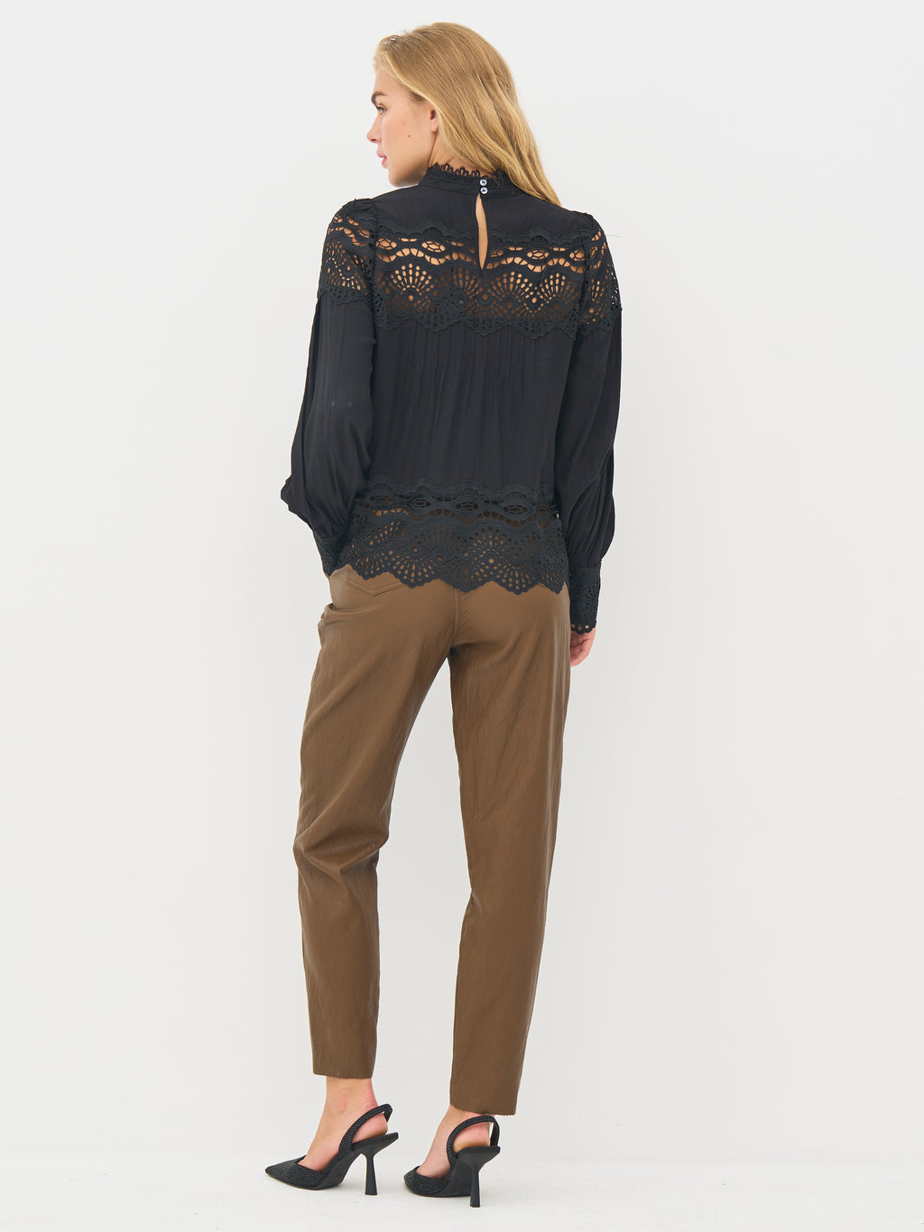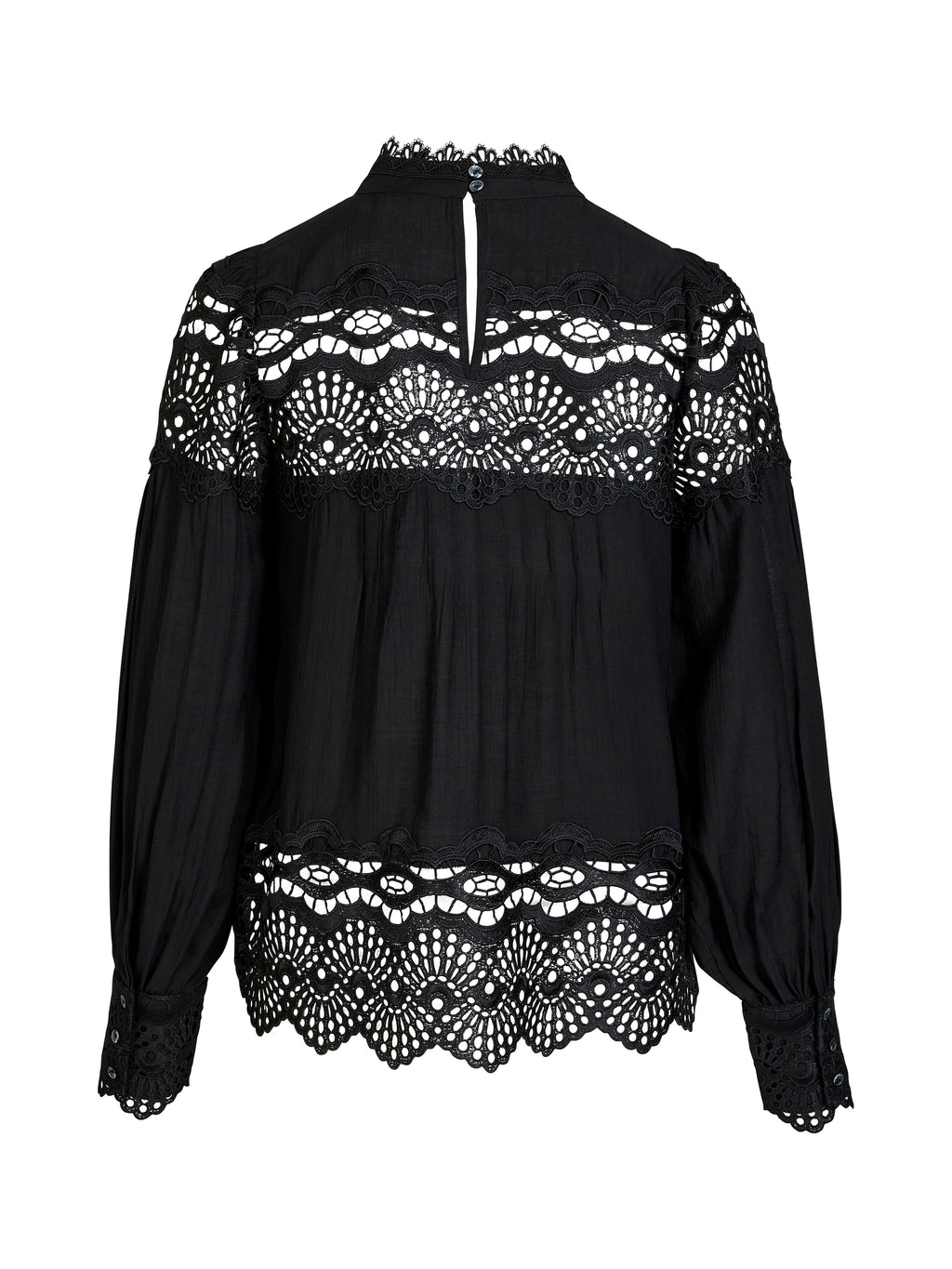 Få en forfinet og romantisk uttrykk med denne vakre skjorten som kombinerer klassiske snitt med dekorative blonder detaljer. De brede blonder bånd pryder både brystet, ryggen, mansjettene og kanten, skaper en elegant samspill mellom gjennomsiktighet og tetthet. Den lille ståkrage og knappelukking på baksiden legger til en stilig finish.