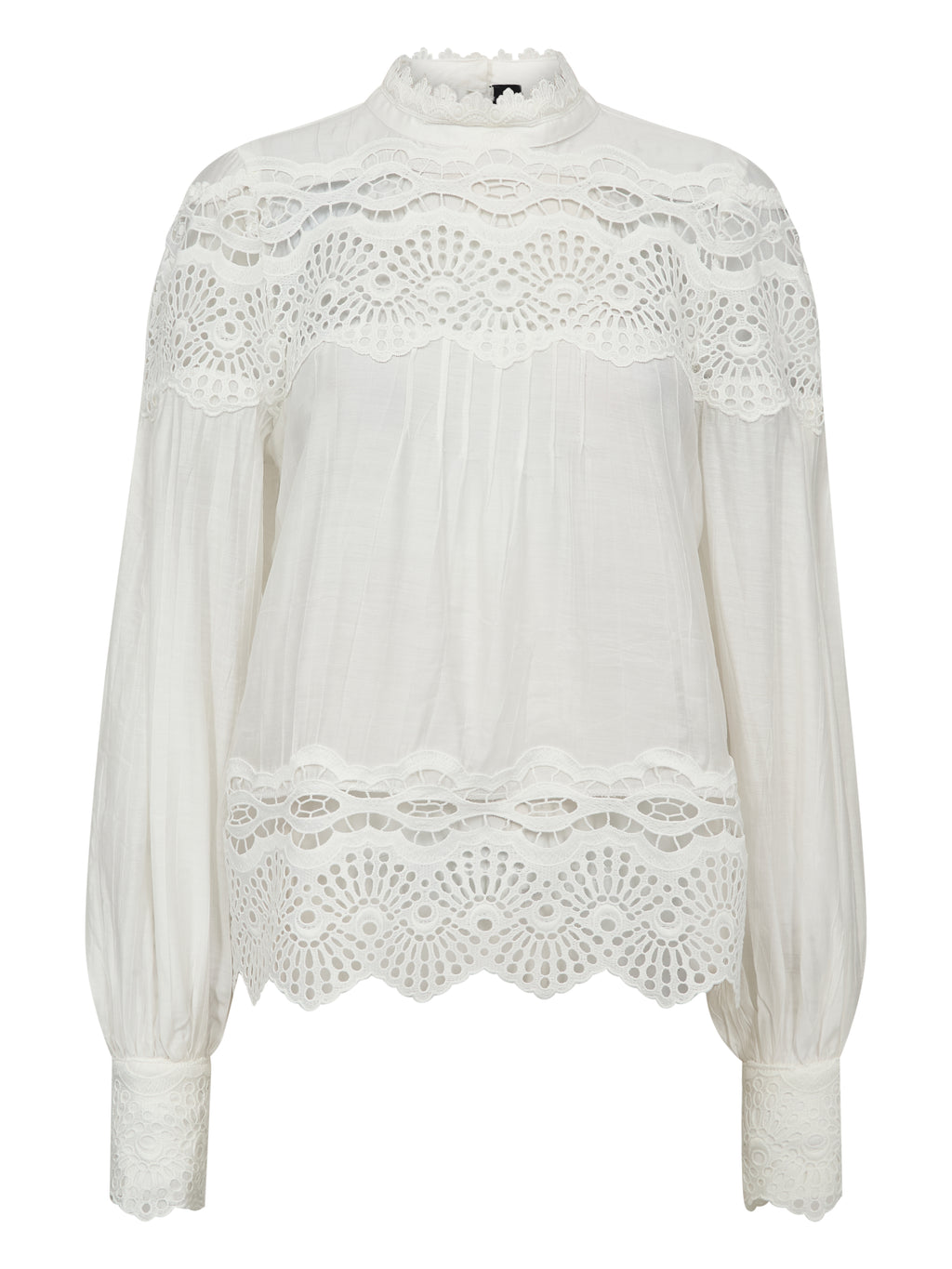 Få en forfinet og romantisk uttrykk med denne vakre skjorten som kombinerer klassiske snitt med dekorative blonder detaljer. De brede blonder bånd pryder både brystet, ryggen, mansjettene og kanten, skaper en elegant samspill mellom gjennomsiktighet og tetthet. Den lille ståkrage og knappelukking på baksiden legger til en stilig finish.