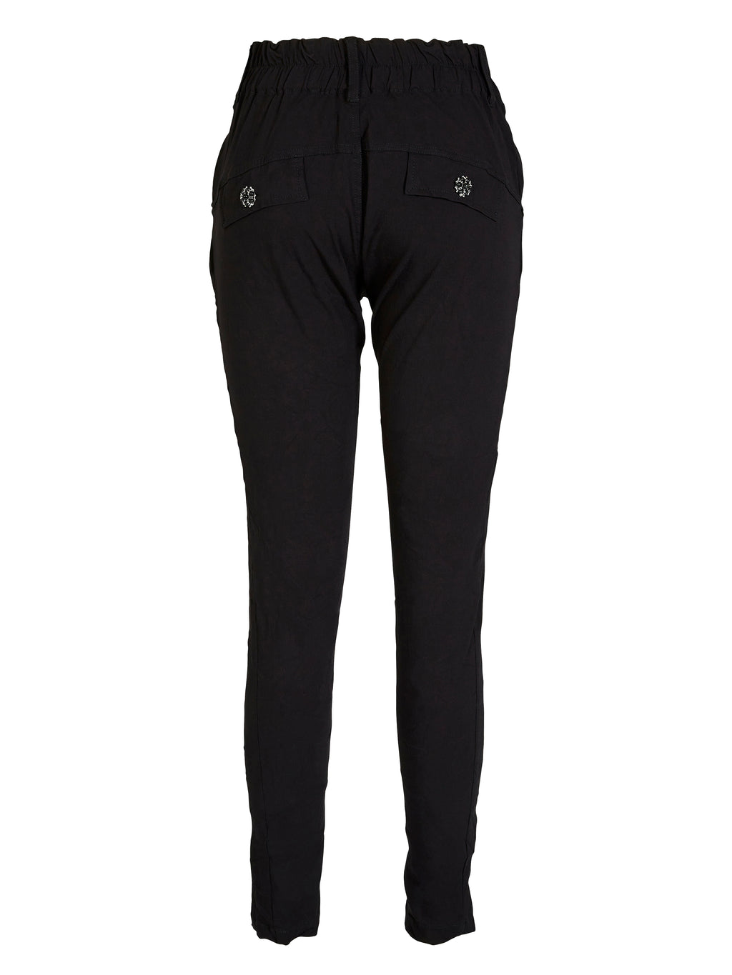 Disse buksene har en smal passform og dekorative detaljer, som gir et elegant og moderne uttrykk. De asymmetriske fremre knappene med glitrende steiner skaper et iøynefallende element, mens elastikken bak sikrer en behagelig passform. De skrå sømmene og klafflommene bak fullfører det stilige designet.