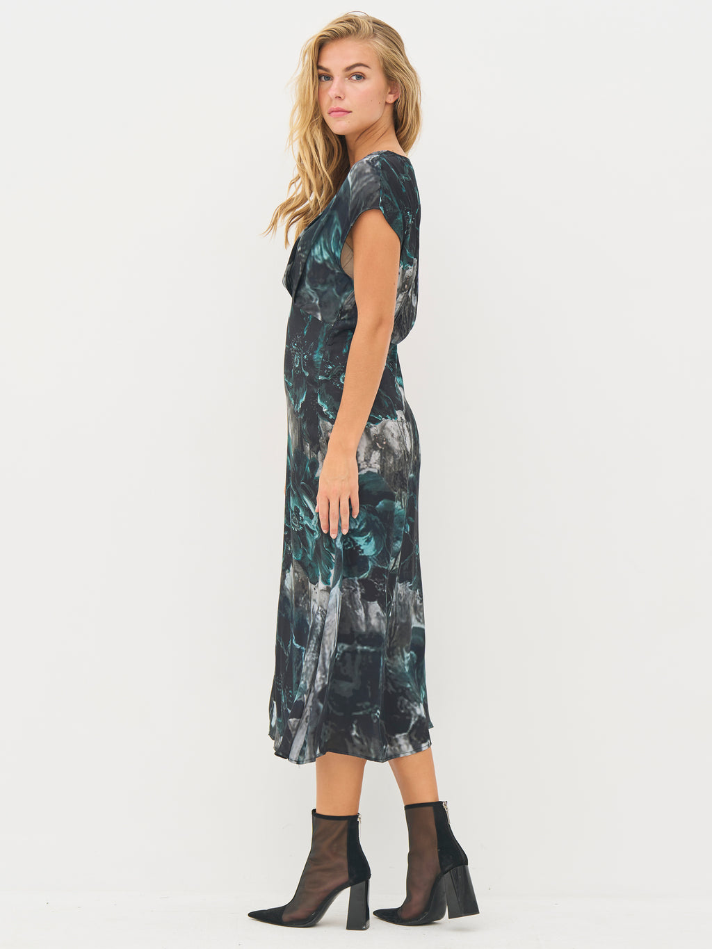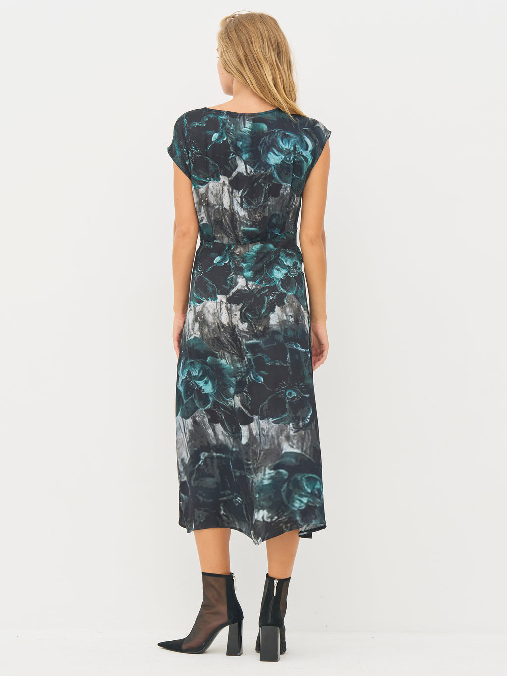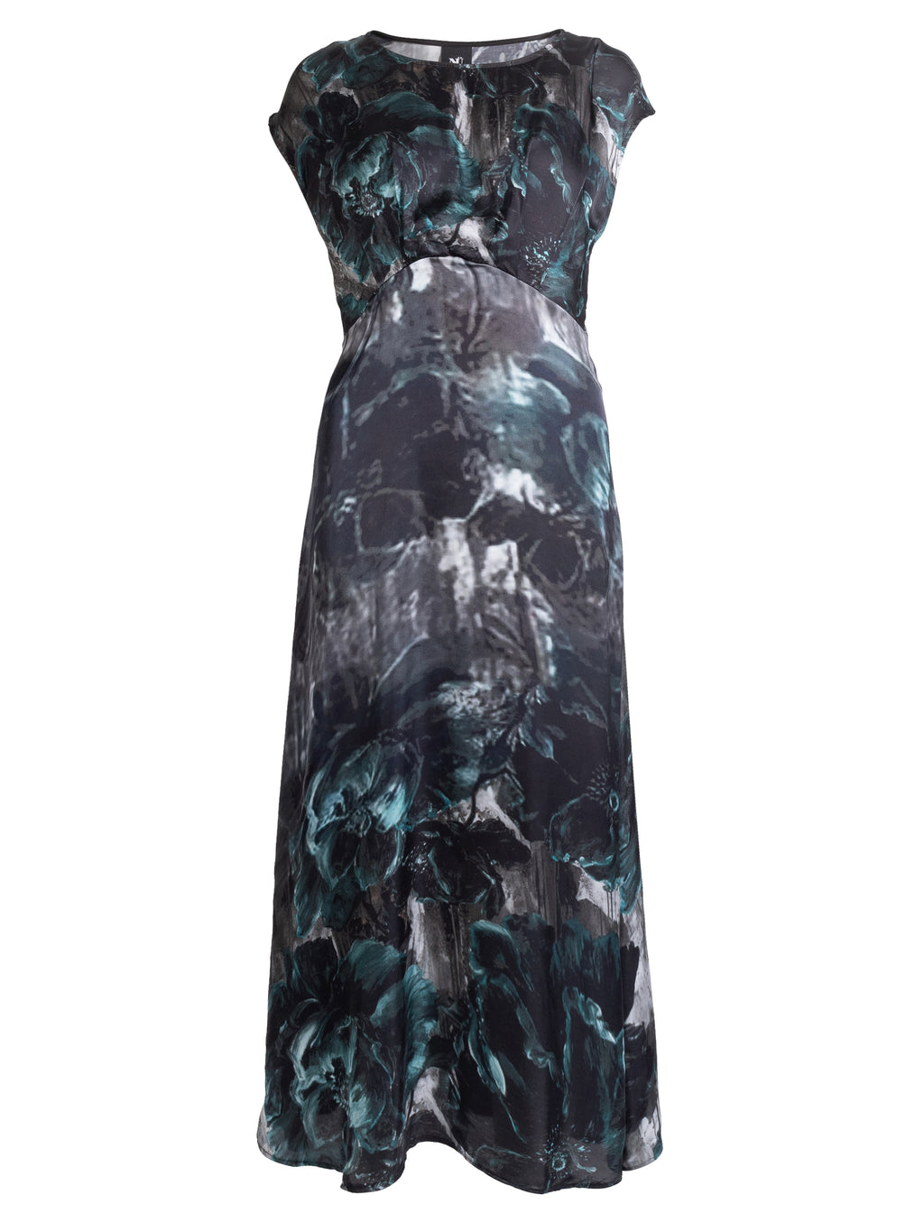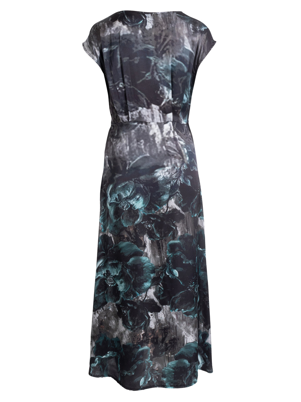 Et elegant valg både for hverdagsbruk og festlige anledninger. Denne lange kjolen har en vakker drapering og en feminin snitt med en lett definert midje. Det myke stoffet følger kroppen på en smigrende måte, mens det iøynefallende blomstertrykket legger dybde og karakter til designet. De korte ermene og den runde halsen gir et enkelt og tidløst uttrykk.