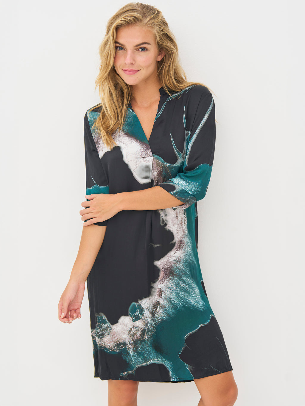 Denne tunikaen kombinerer komfort og stil i ett design. Den har en løs, rett passform med 3/4-ermer og en myk krage, som gir et avslappet men likevel sofistikert utseende. Den heldekkende blomsterprinten legger til visuell dybde, mens den skjulte knappefronten skaper et rent og elegant utseende. En liten fold på baksiden gir ekstra bevegelse og luftstrøm.