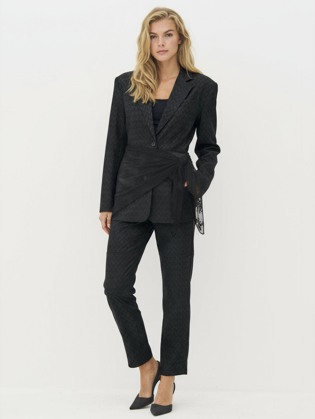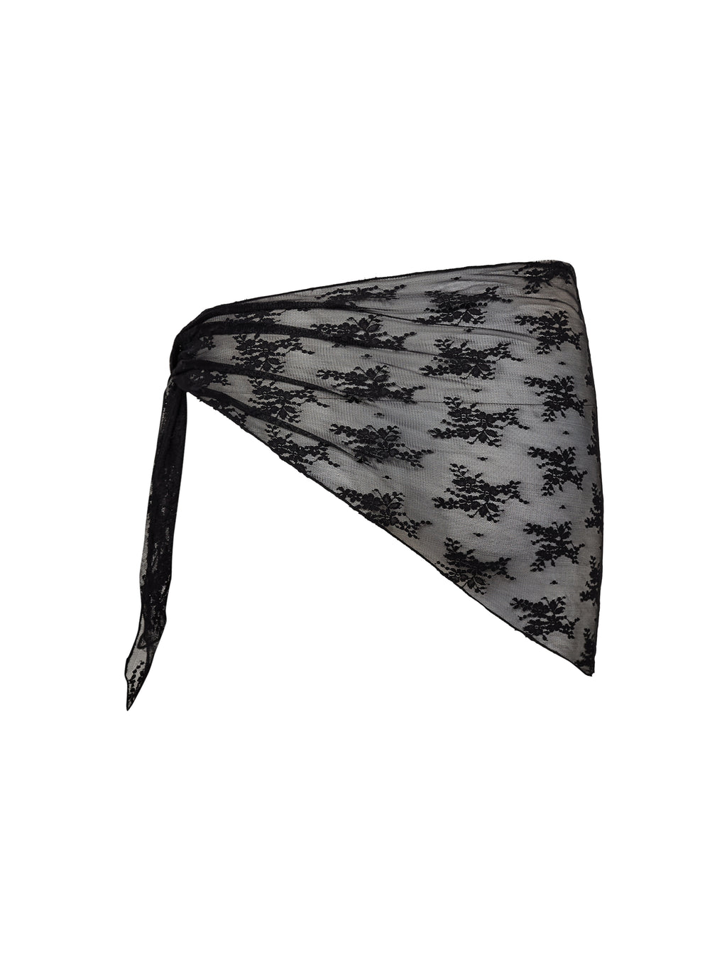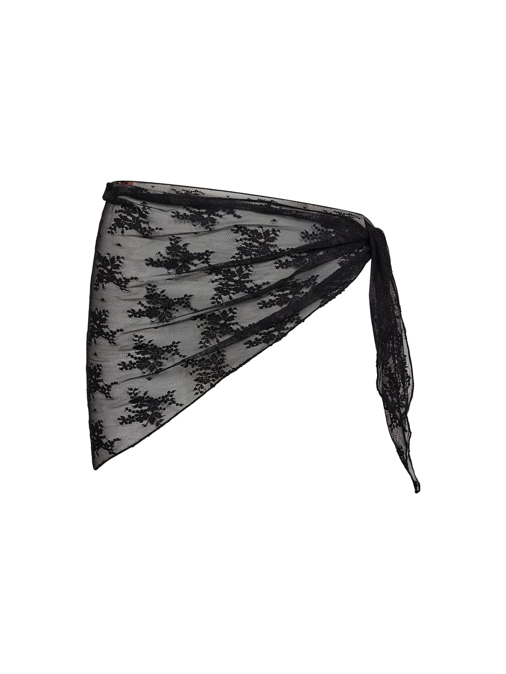Et lett og dekorativt skjerf i gjennomsiktig mesh med brodert blondemønster. Den trekantede formen og den myke kvaliteten gjør det enkelt å style på flere måter - knyt det rundt livet som et belte, bruk det i håret eller over skuldrene. Et elegant og dekorativt tilbehør som legger til et feminint og personlig preg på antrekket.