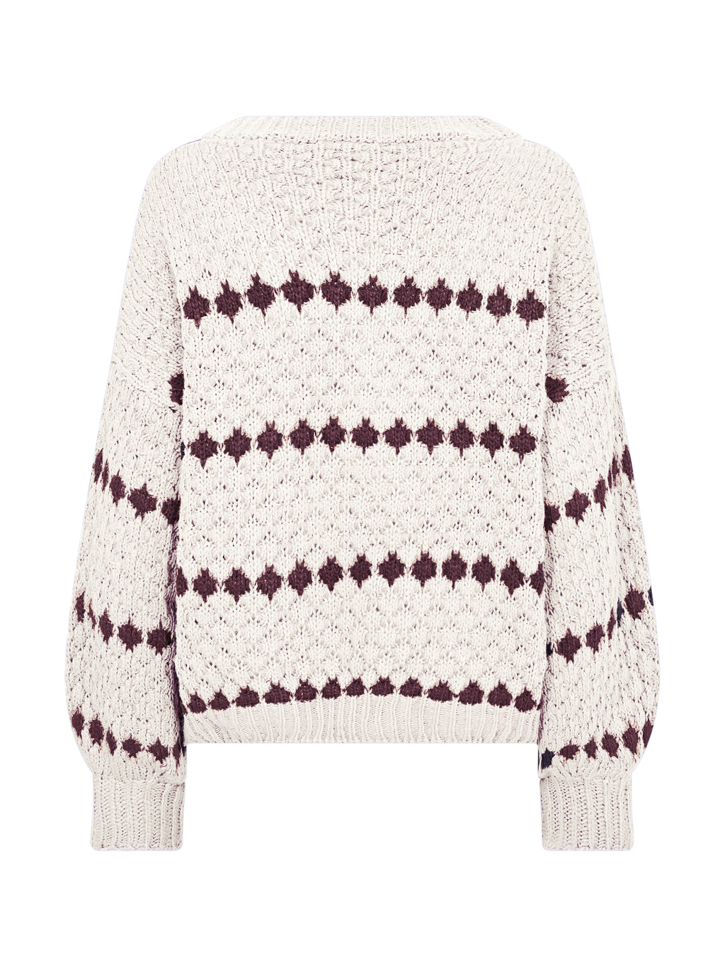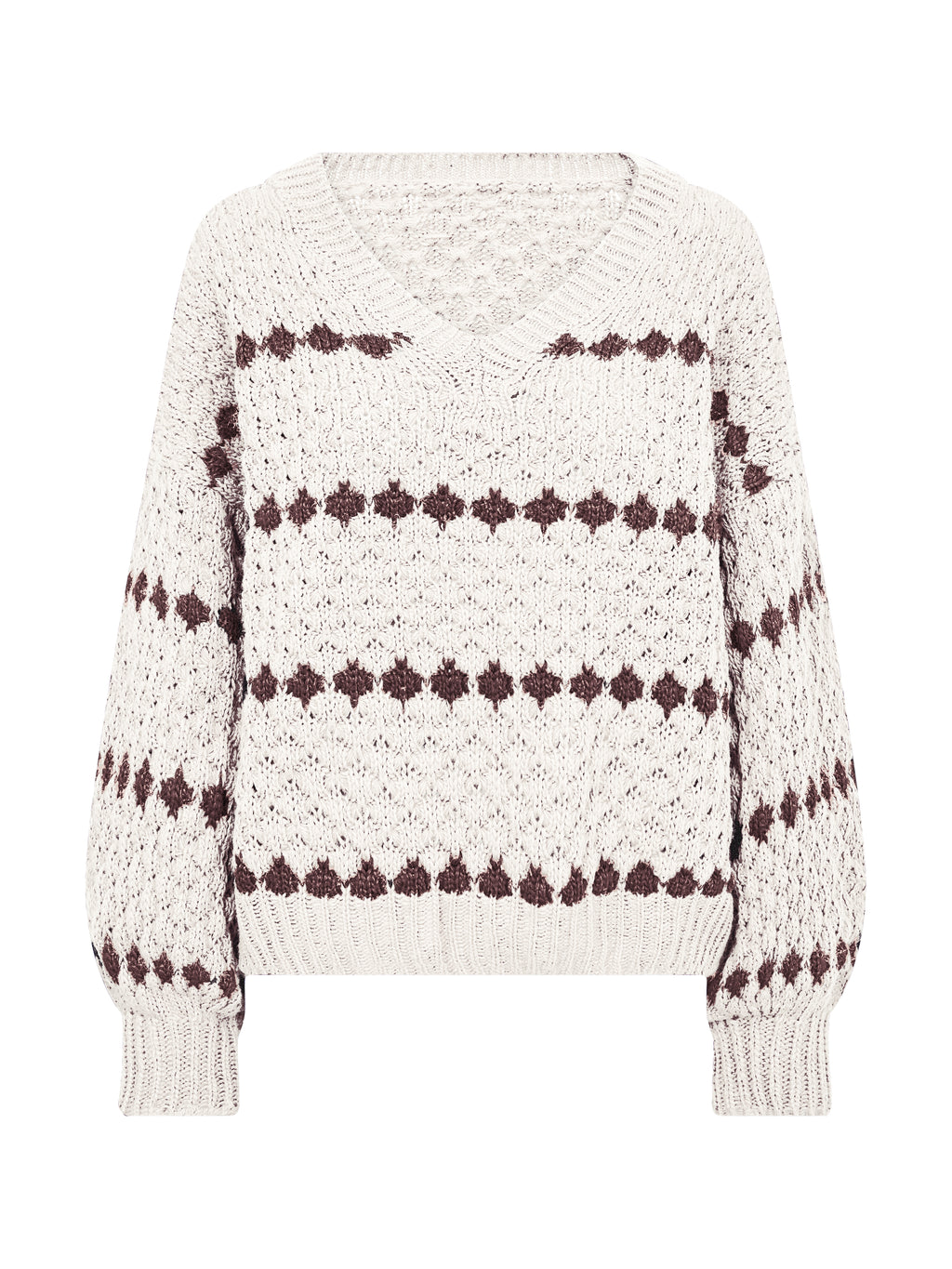 Genseren har fine detaljer og et klassisk utseende. Den har en v-hals, lange ermer og et mønstret strikket design med striper, som gir karakter til strikken. Passformen er normal med ribbestrikk nederst og ved ermene, som avslutter looken på en enkel måte.