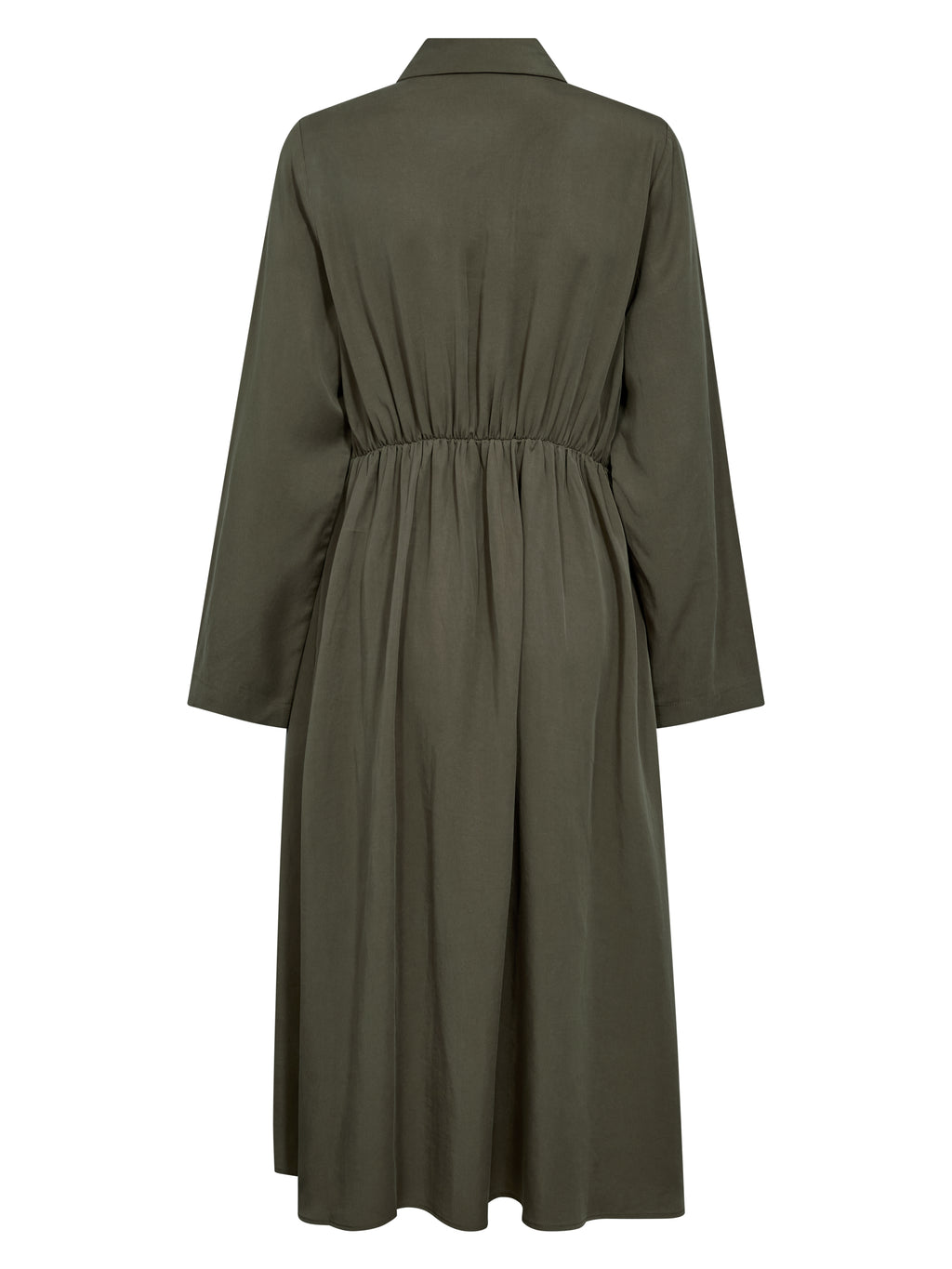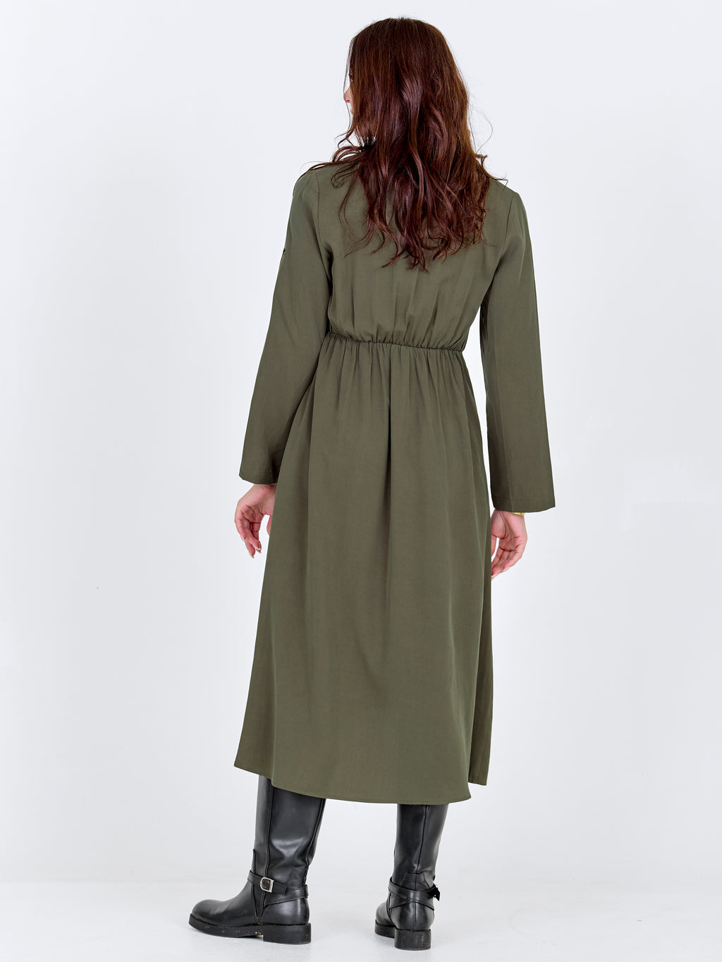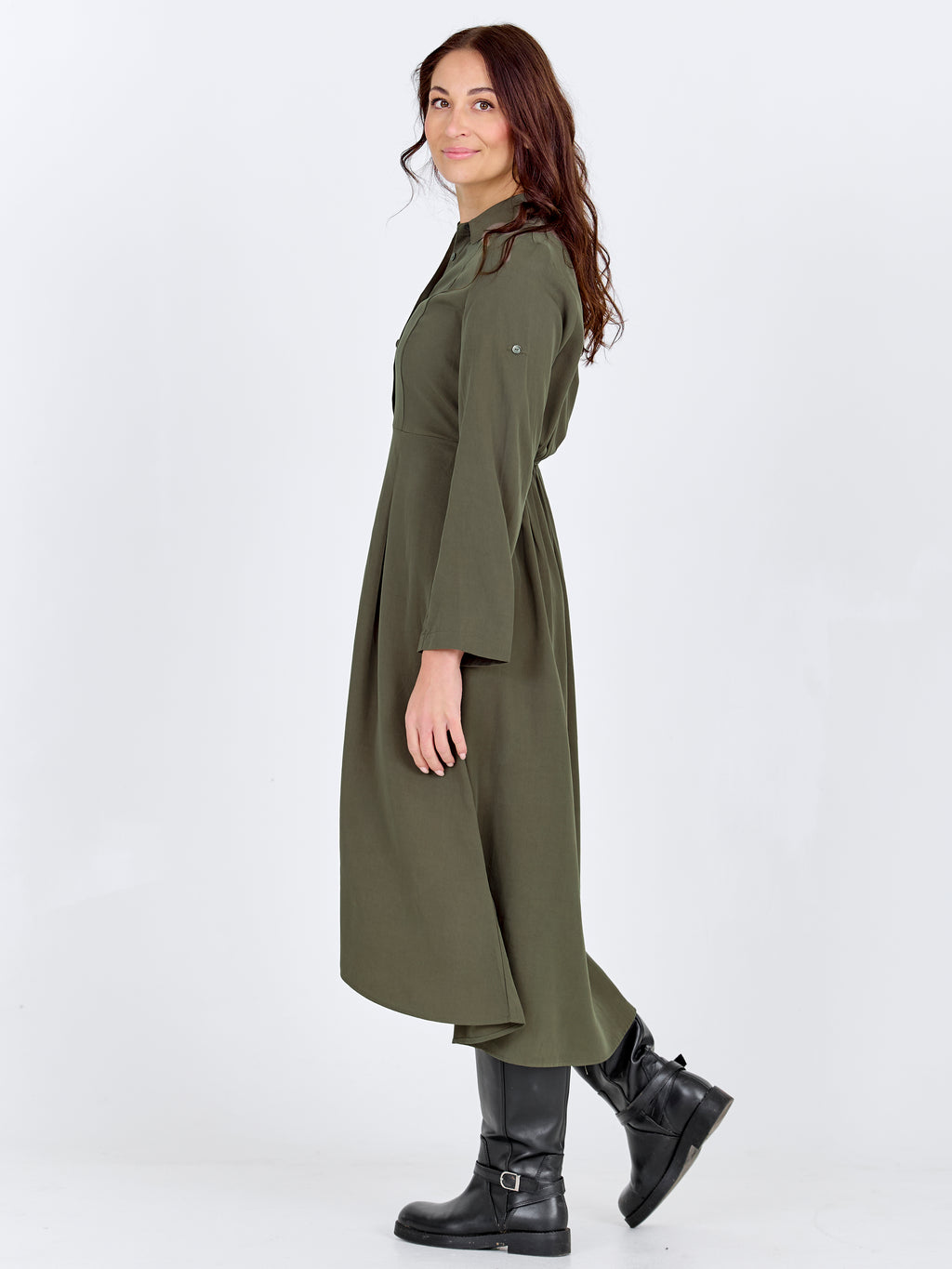 Denne kjolen har et enkelt og tidløst utseende med sin skjortekrage, knaplukking og rene linjer. Foran har den fine folder som gir en lett fall i skjørtet, mens elastikken bak sikrer en behagelig og velformet passform. De lange ermene avslutter designet og gjør kjolen ideell for både hverdagsbruk og mer formelle anledninger. Style den med støvler for en moderne look eller med flate sko for en mer avslappet fremtoning.