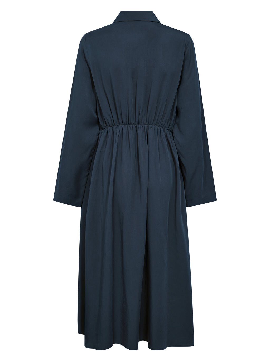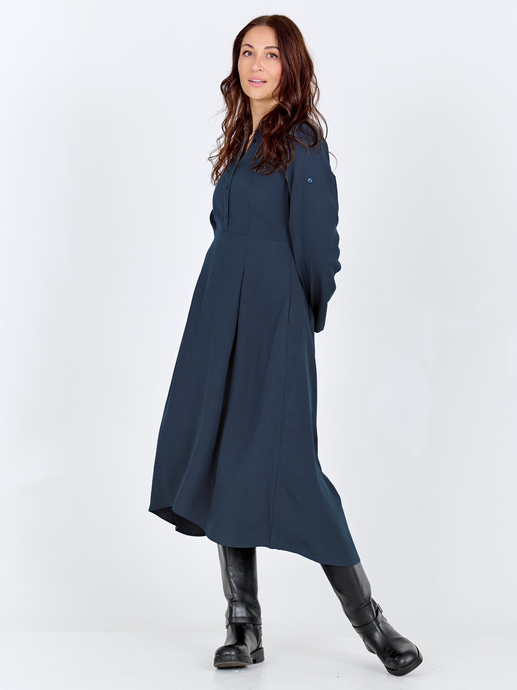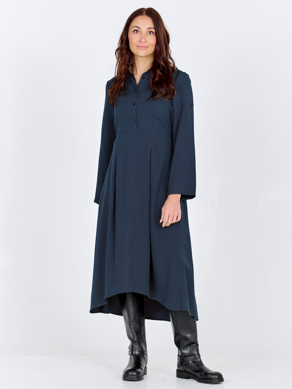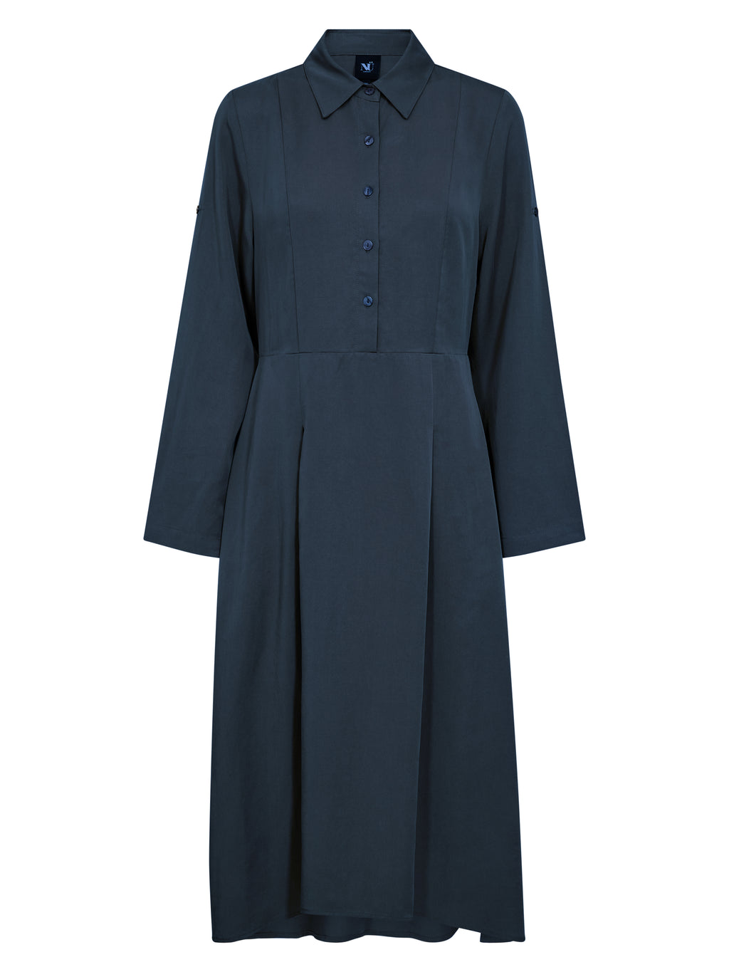 Denne kjolen har et enkelt og tidløst utseende med sin skjortekrage, knaplukking og rene linjer. Foran har den fine folder som gir en lett fall i skjørtet, mens elastikken bak sikrer en behagelig og velformet passform. De lange ermene avslutter designet og gjør kjolen ideell for både hverdagsbruk og mer formelle anledninger. Style den med støvler for en moderne look eller med flate sko for en mer avslappet fremtoning.