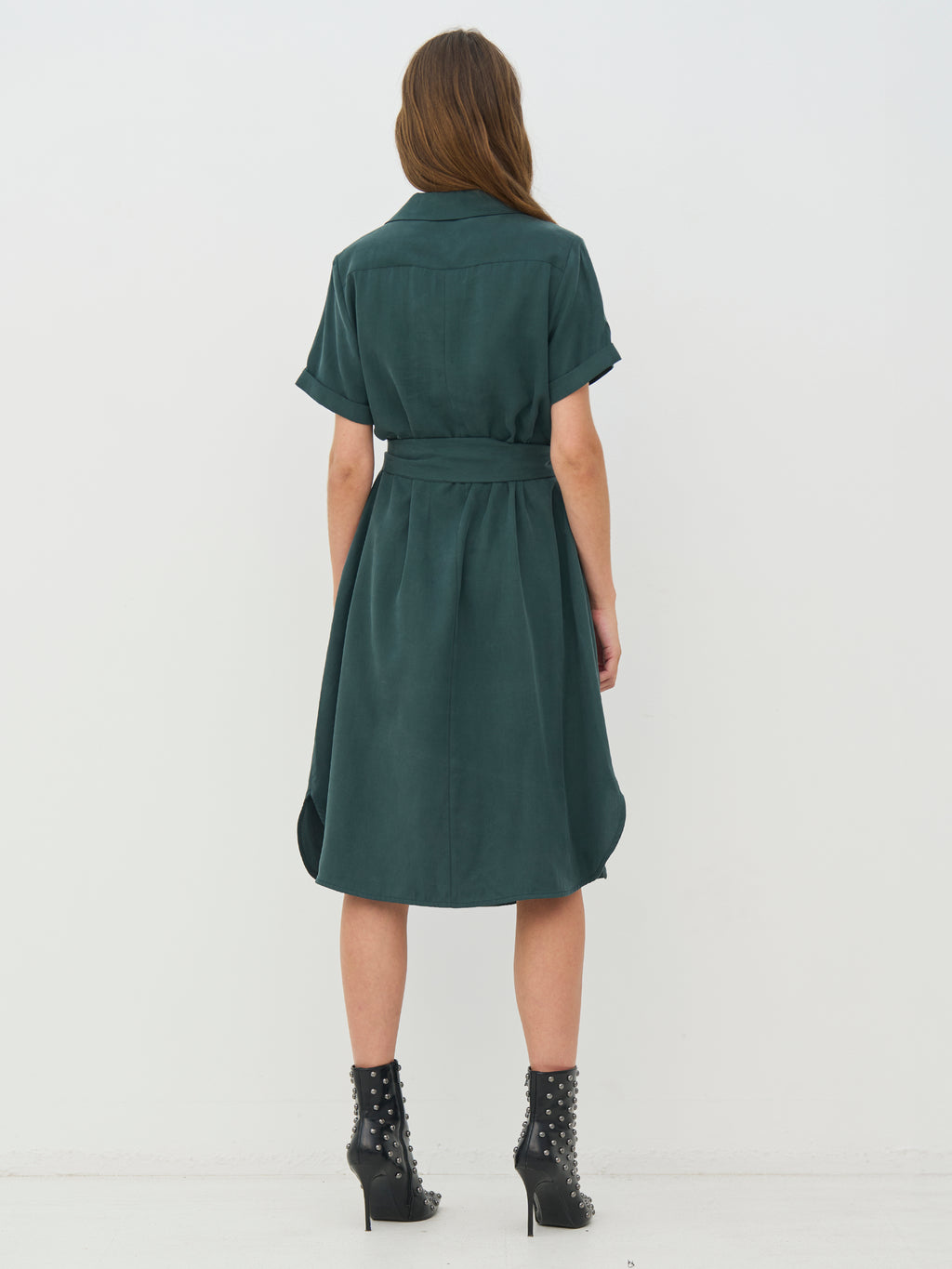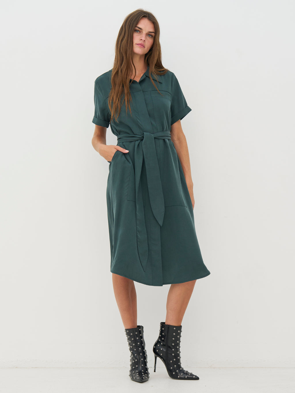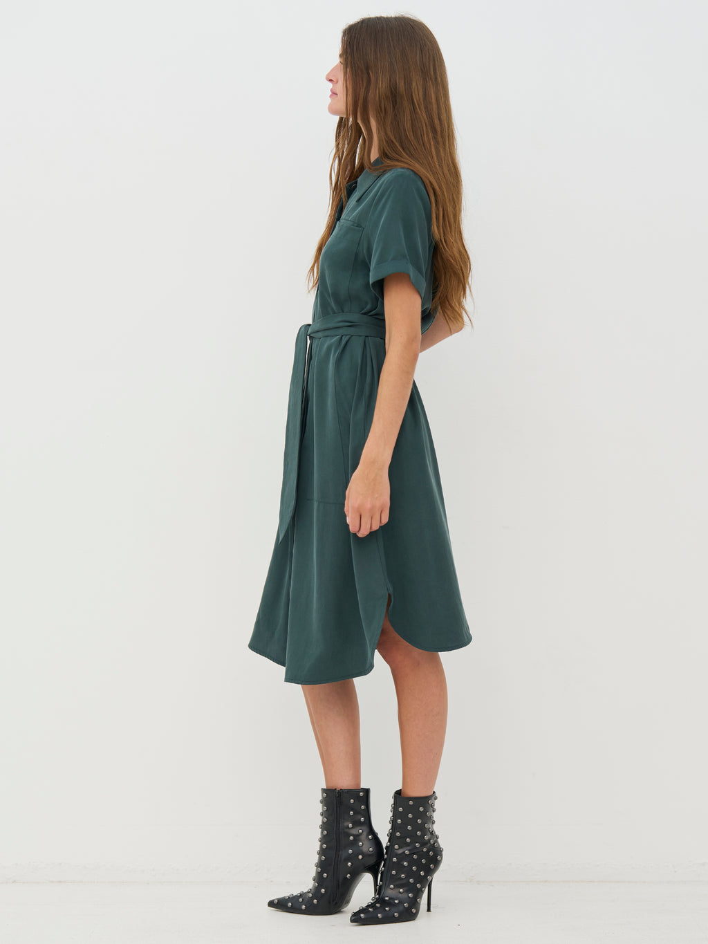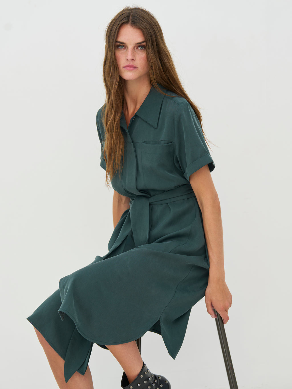 Denne kjolen har et elegant og avslappet utseende med sin skjortekrage, 3/4-ermer og rene linjer. Det brede belte i midjen lar deg forme silhuetten, mens de fine brettene foran gir litt bevegelse til skjørtet. På baksiden har kjolen en myk, fallende passform og små splitt i sidene, som gir ekstra komfort. Styl den med sandaler for en avslappet look eller med støvler for et mer iøynefallende utseende.