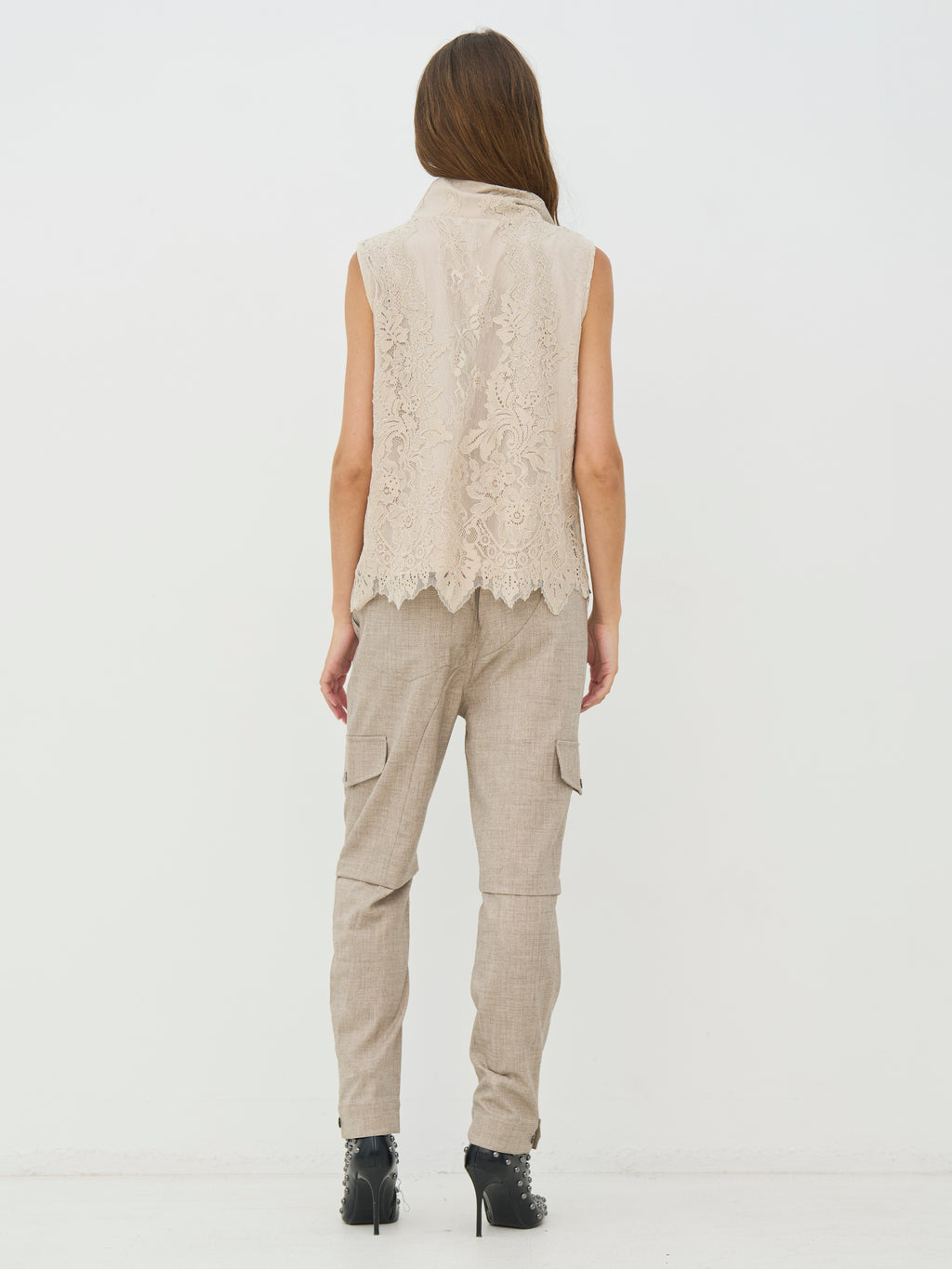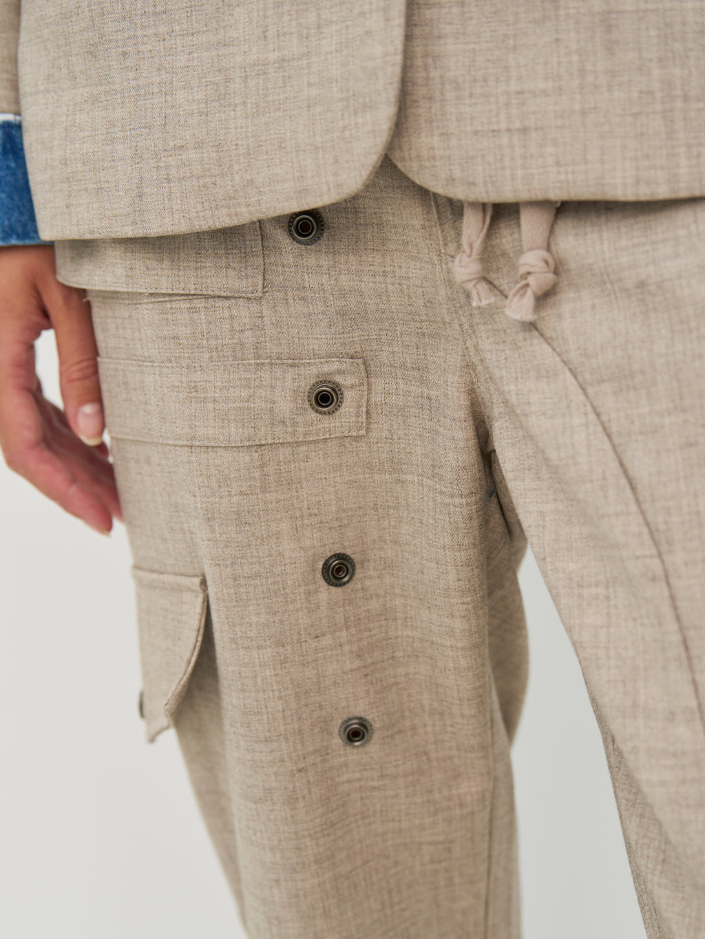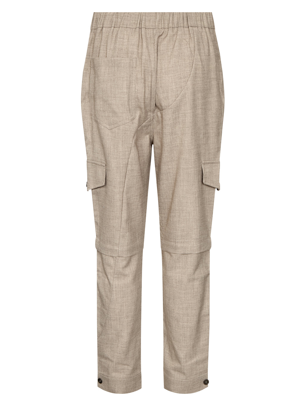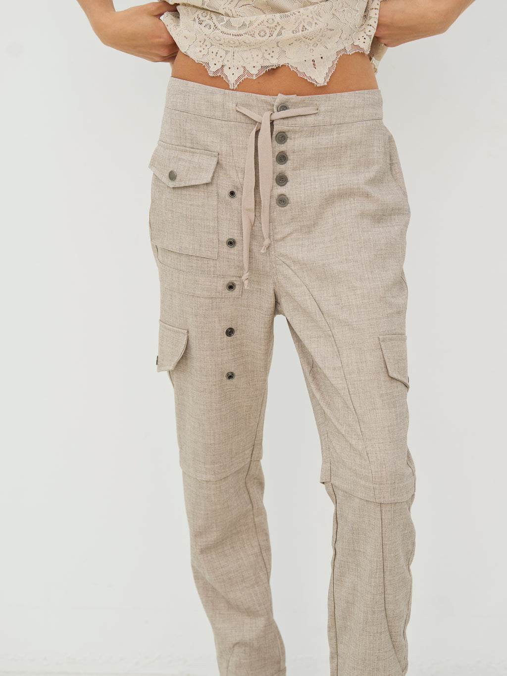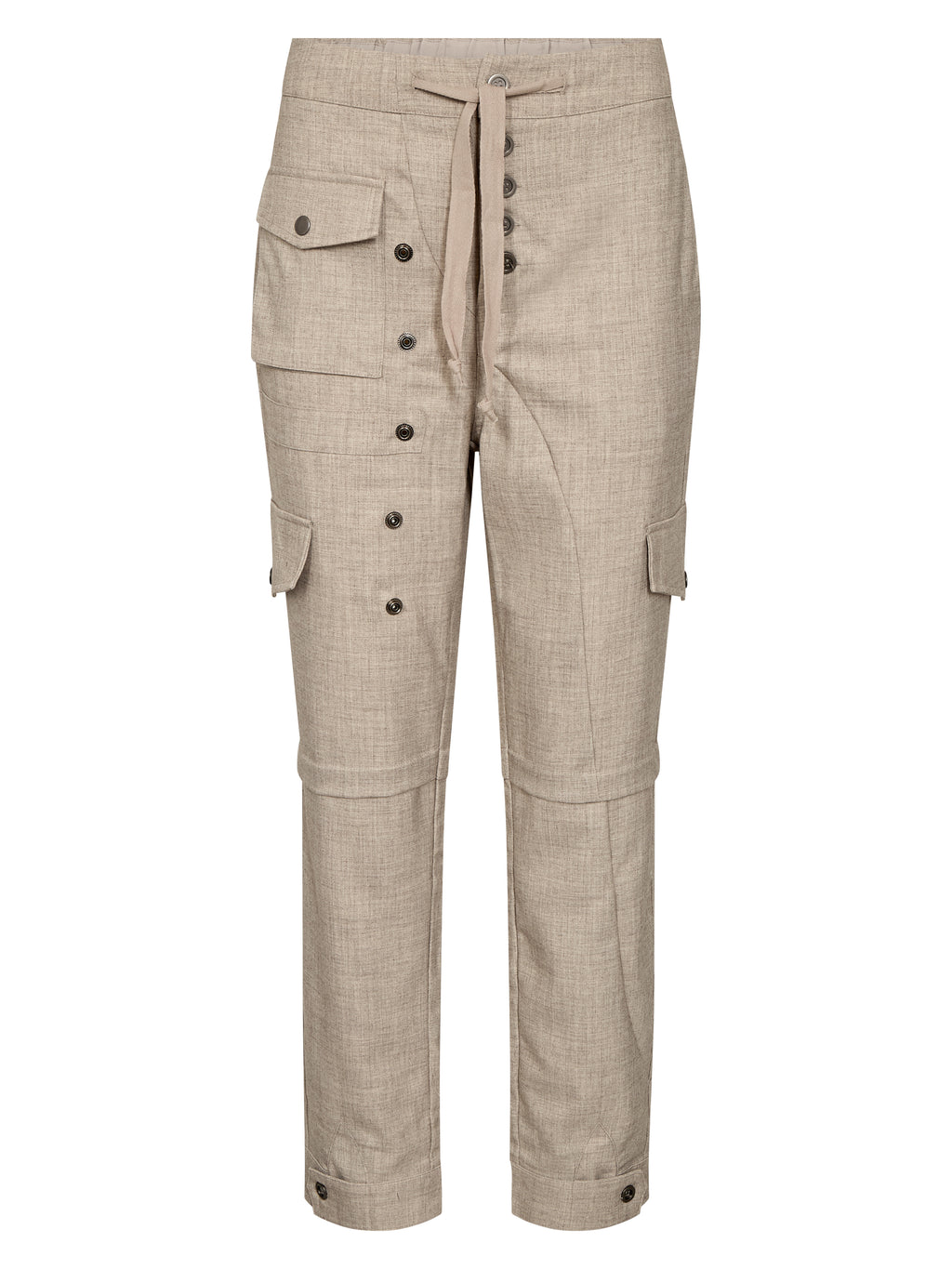 Disse buksene har en moderne design med flere praktiske lommer og dekorative knapper, som gir et markant og detaljert utseende. Foran har de en knappelukking kombinert med en justerbar snor i midjen for en behagelig passform. Style dem med en enkel topp eller en lett skjorte for et kult og ubesværet hverdagsutseende.