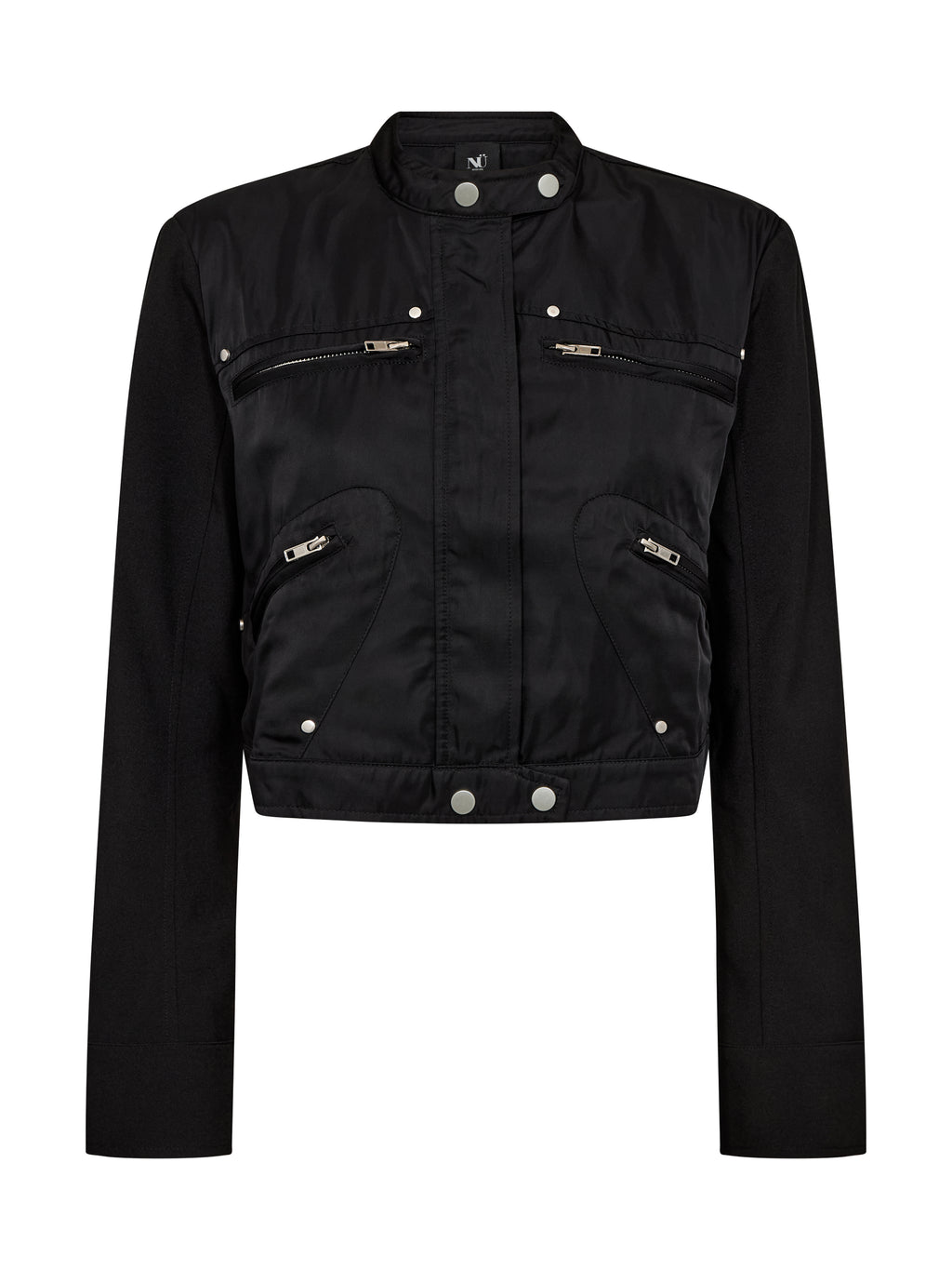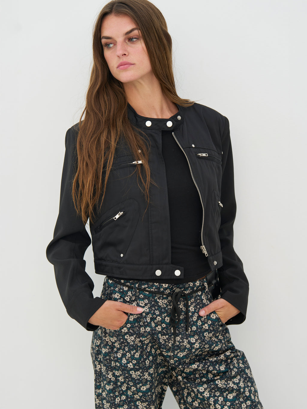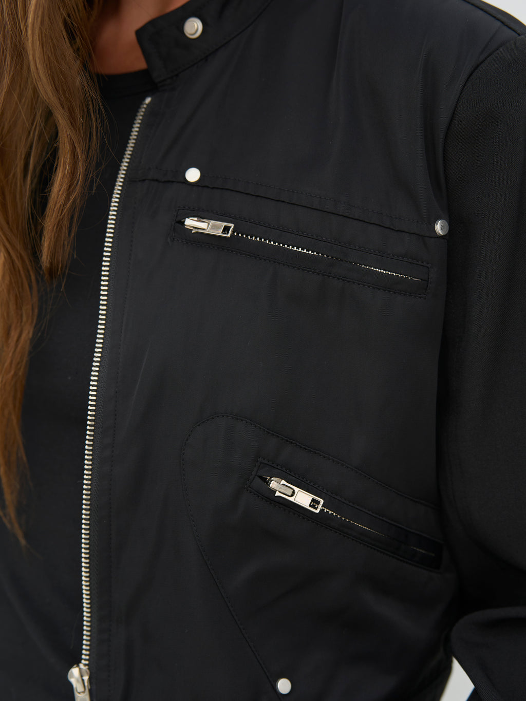 Denne jakken har et moderne, kul uttrykk med sin korte lengde og kombinasjonen av matte og blanke materialer. Foran har den flere glidelåser og trykknapper som legger til både funksjon og karakter til designet. Den høye kragen med trykknapp gir et skarpt utseende, mens de lange ermene avslutter antrekket på en klassisk måte. På baksiden holdes jakken enkel med rene linjer. Styl den over en topp, kjole eller lett strikk for et stilig hverdagsutseende med kant.