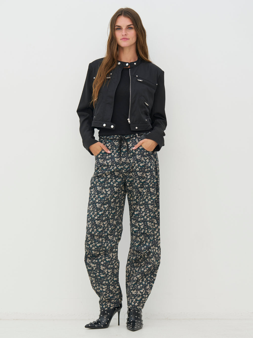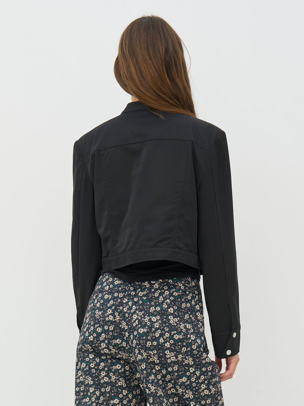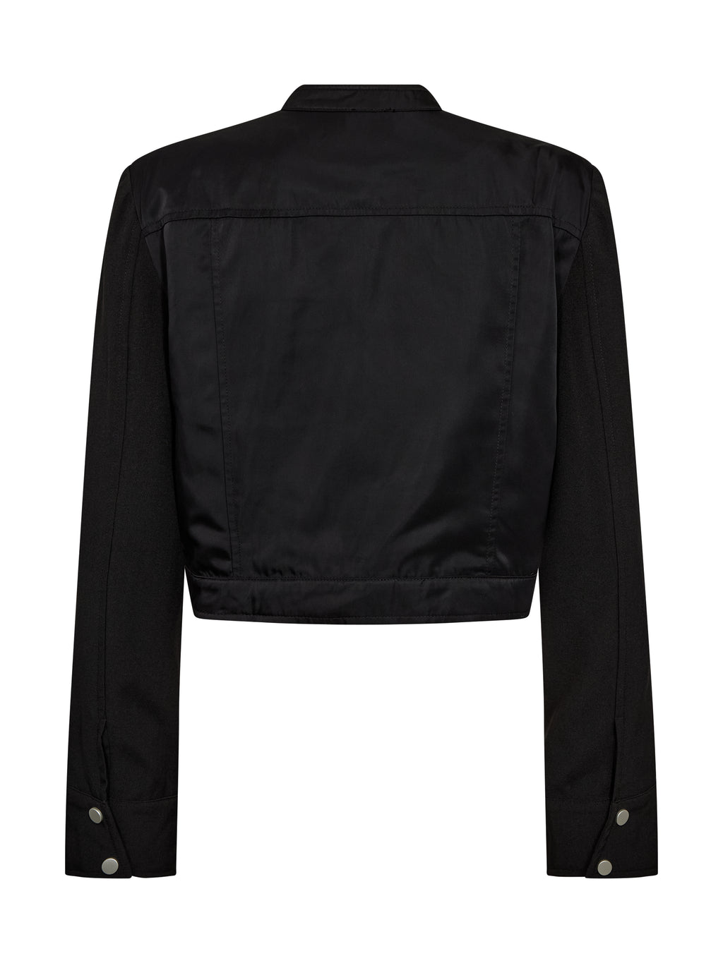 Denne jakken har et moderne, kul uttrykk med sin korte lengde og kombinasjonen av matte og blanke materialer. Foran har den flere glidelåser og trykknapper som legger til både funksjon og karakter til designet. Den høye kragen med trykknapp gir et skarpt utseende, mens de lange ermene avslutter antrekket på en klassisk måte. På baksiden holdes jakken enkel med rene linjer. Styl den over en topp, kjole eller lett strikk for et stilig hverdagsutseende med kant.