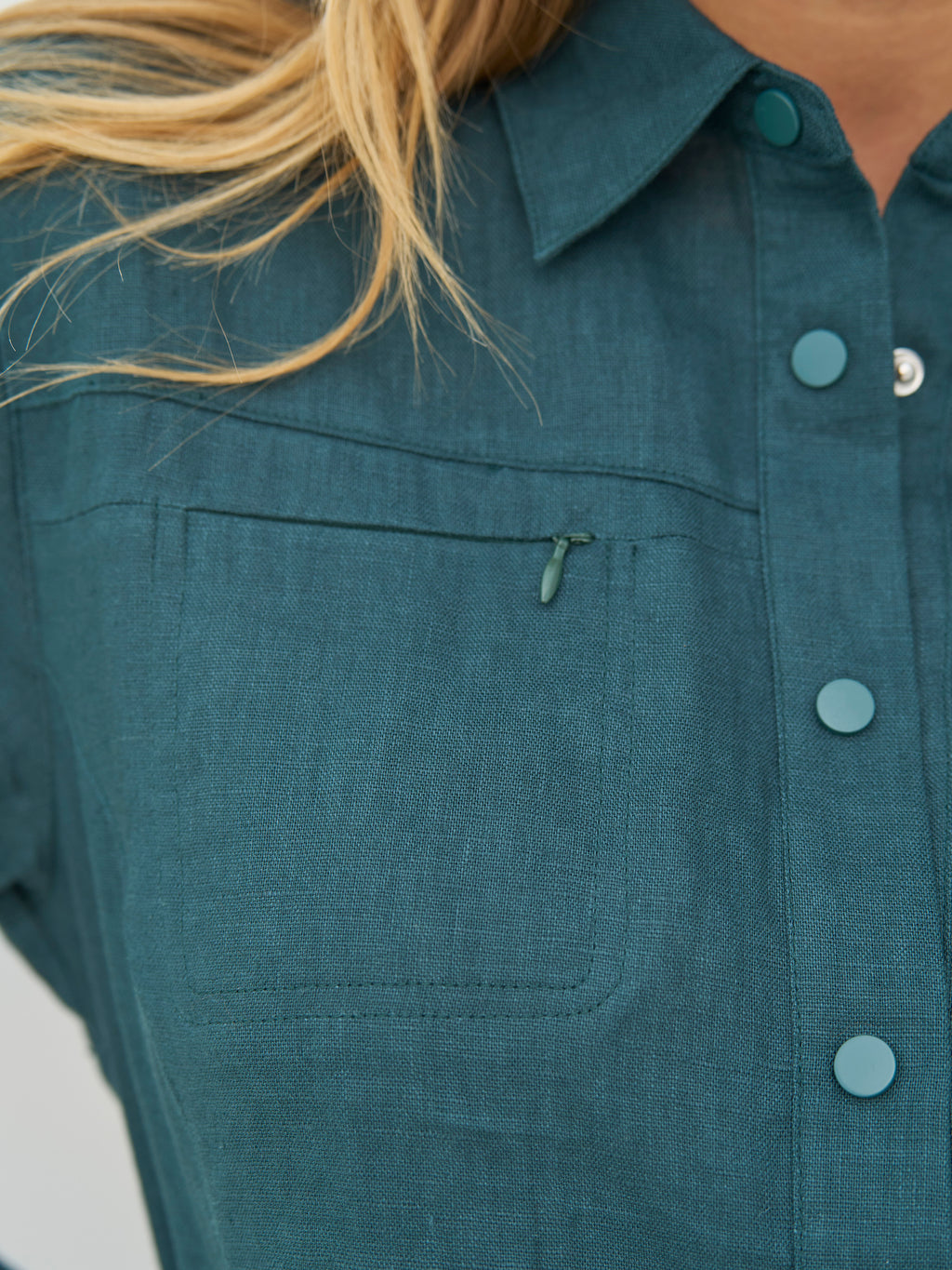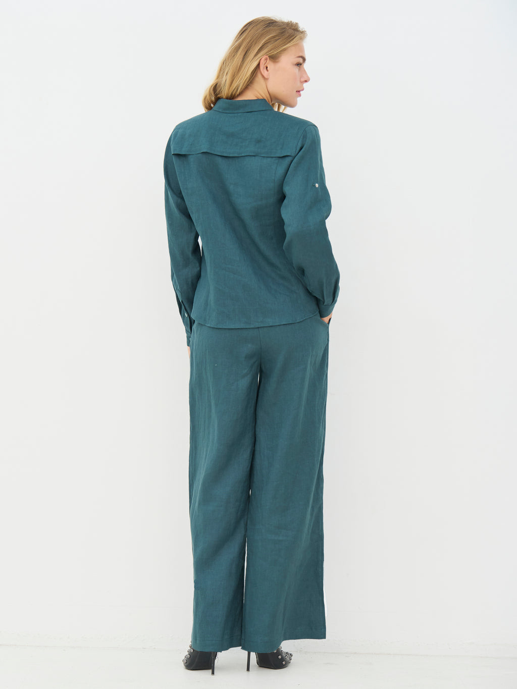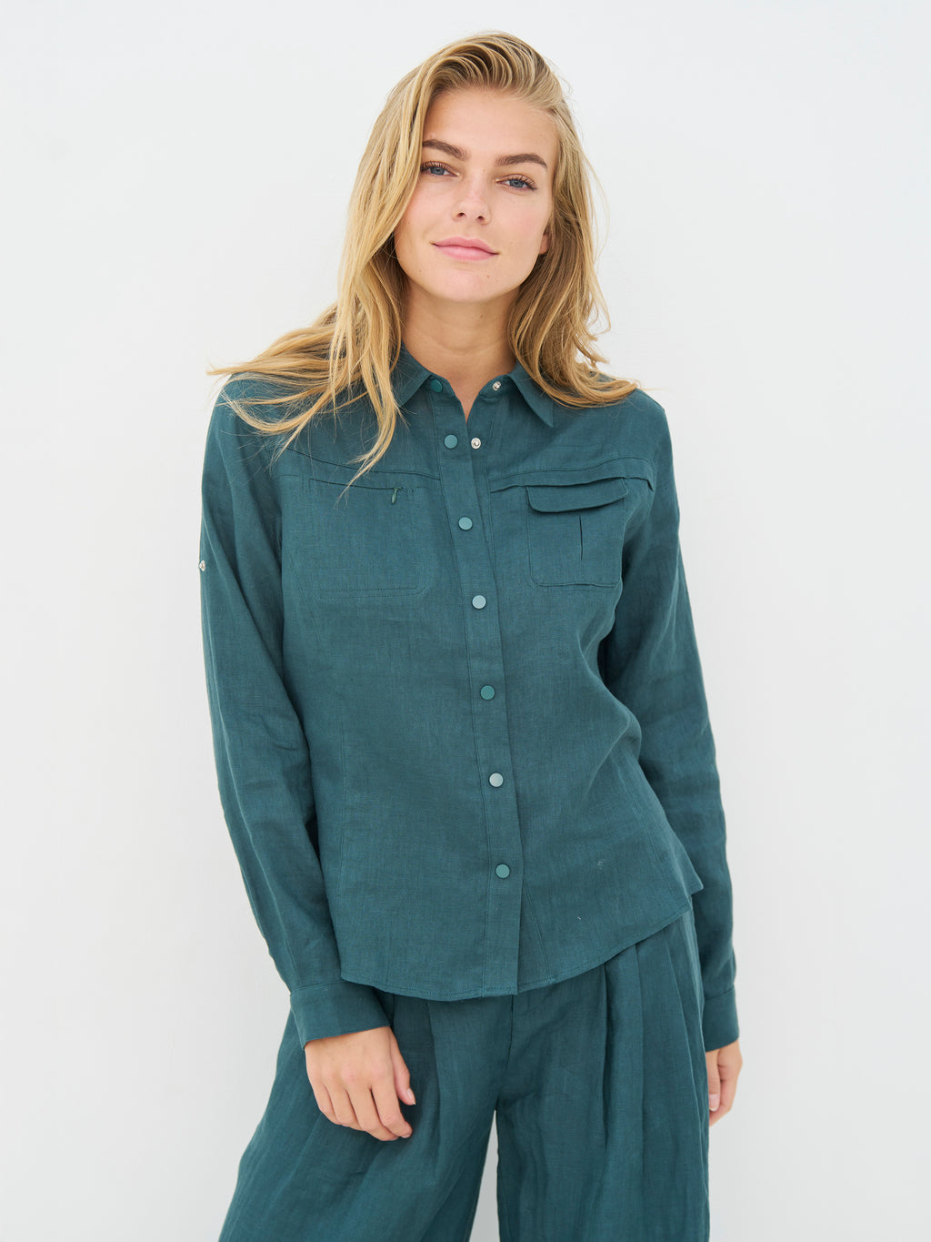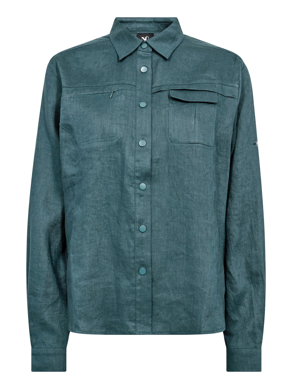 Denne skjorten har et enkelt og stilig utseende med klassisk krage og gjennomgående trykknapper foran. Brystlommene tilfører et diskret, funksjonelt element, mens baksiden er mer enkel og faller pent ned langs ryggen. Passformen er rett og behagelig, noe som gjør skjorten enkel å bruke både lukket og åpen. Styl den med matchende bukser for et gjennomtenkt utseende, eller bruk den med jeans til hverdags.