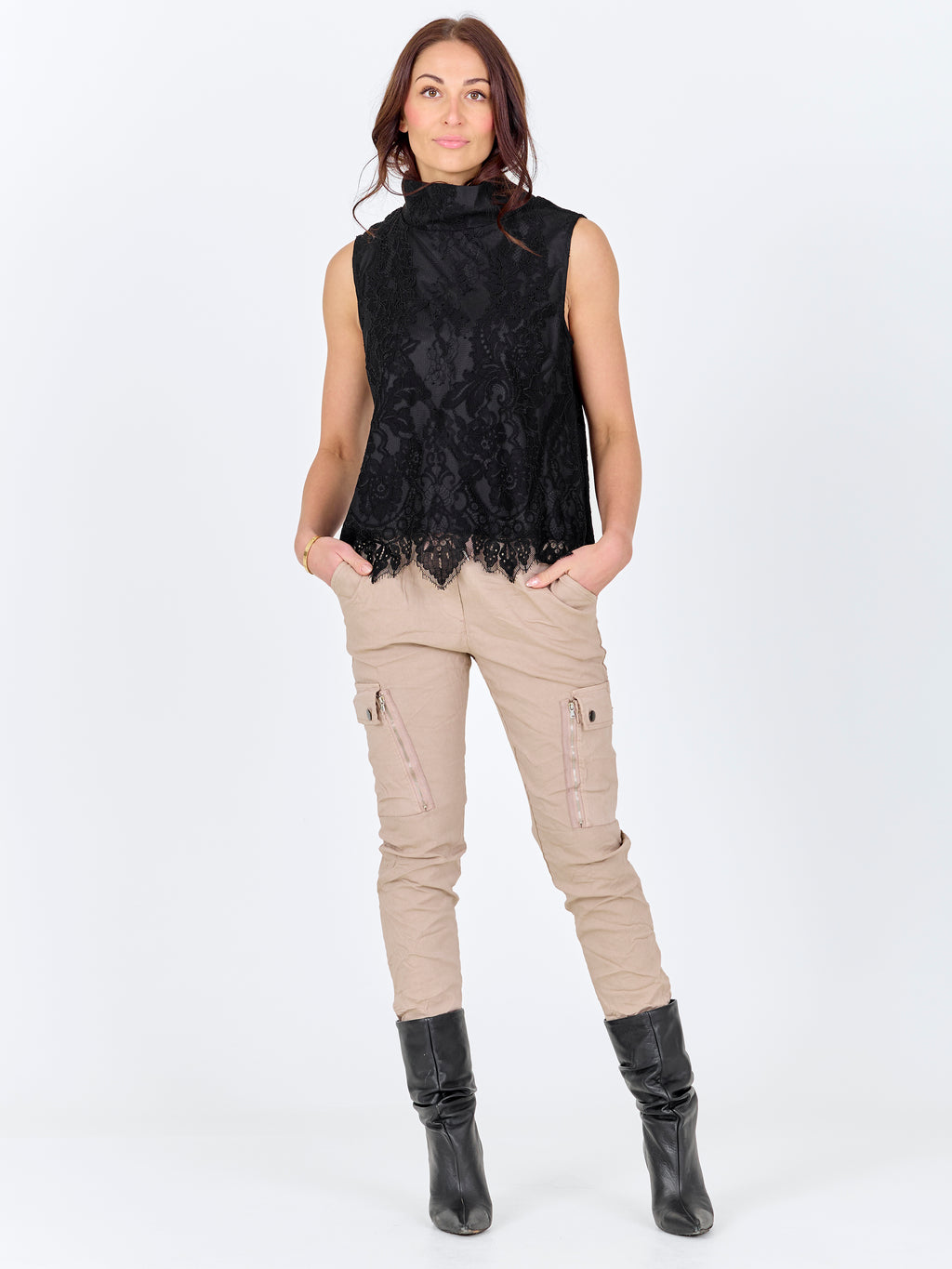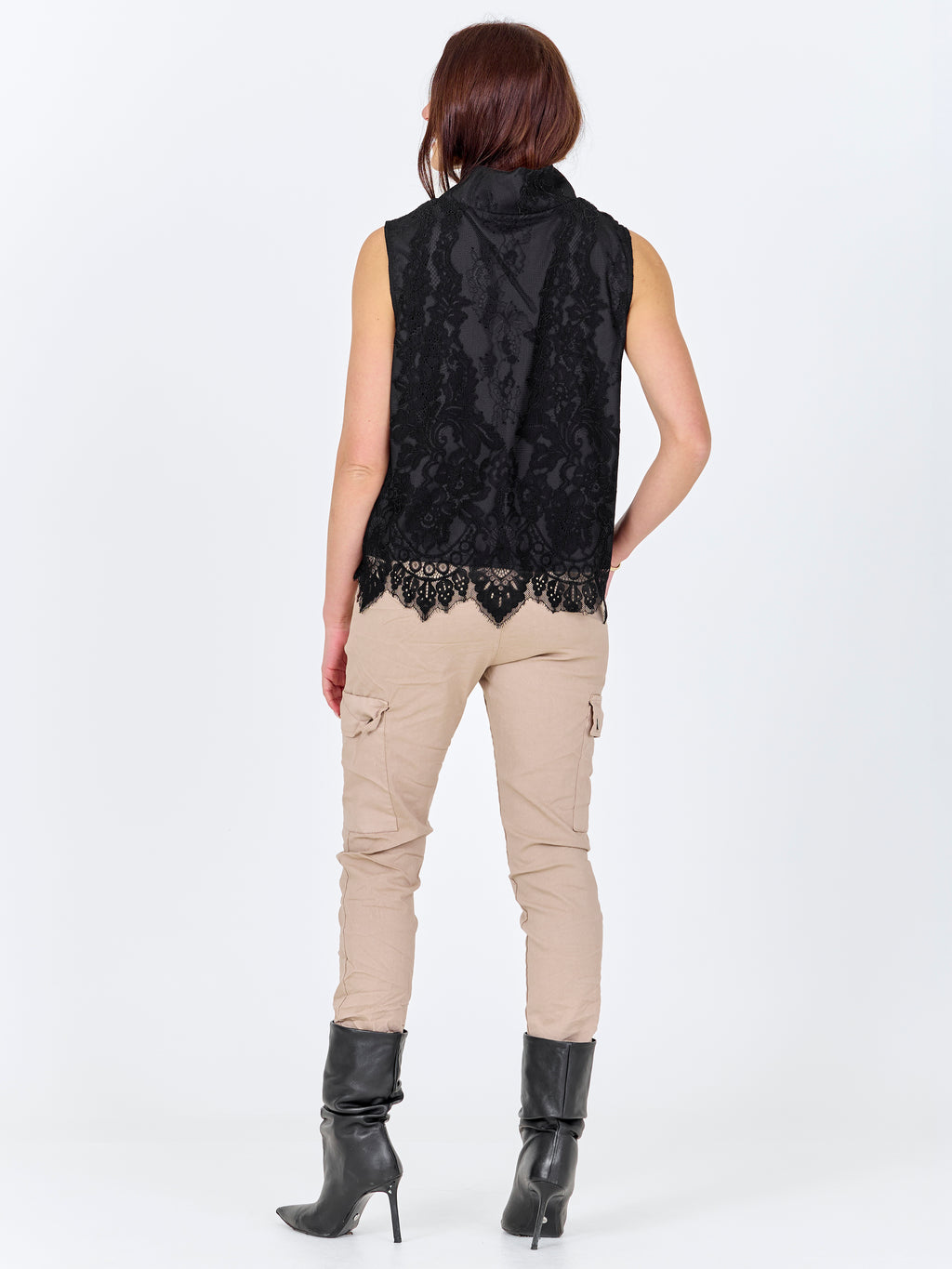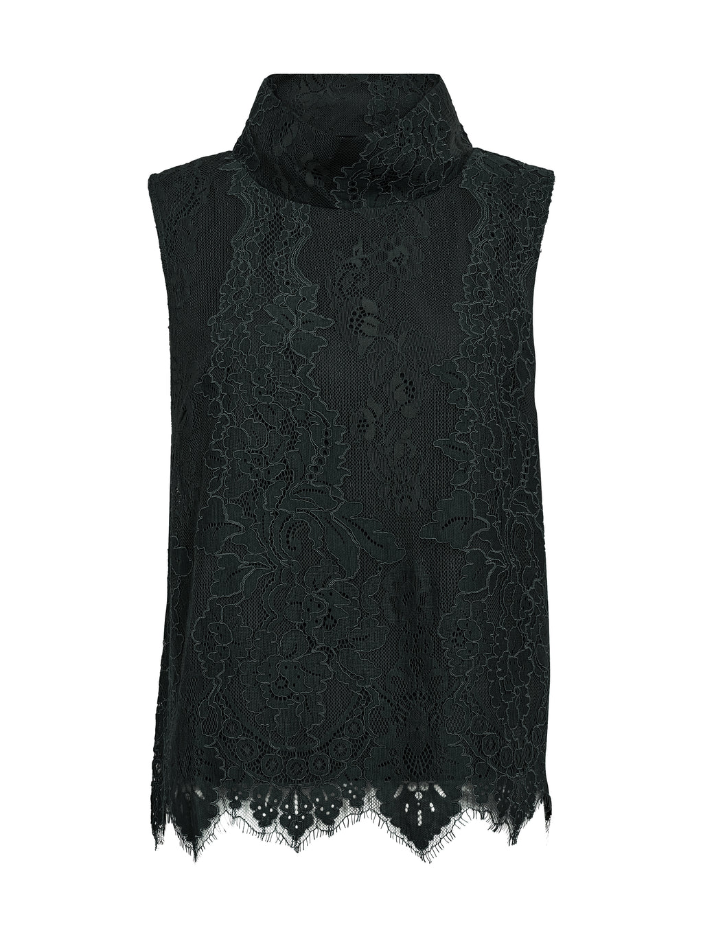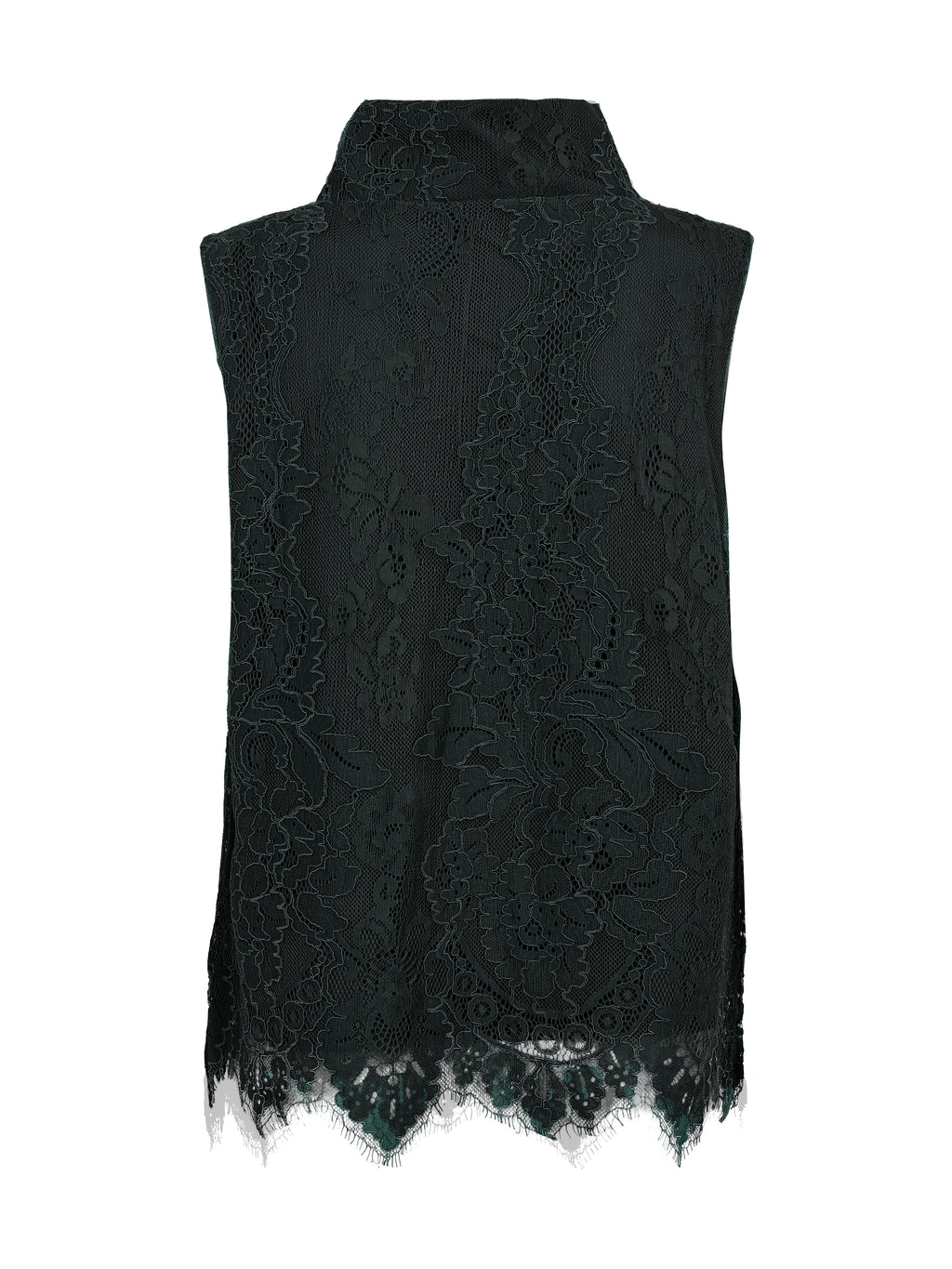 Denne toppen er laget av blondestoff og har et feminint uttrykk med høy hals og ermeløst snitt. Blondene gir en fin spilleffekt på overflaten, mens kanten nederst er lett bølget og avslutter designet på en pen måte. Uttrykket foran og bak er ensartet, slik at toppen faller rolig og lett rundt kroppen. Den er enkel å style både til hverdag og mer festlige anledninger. Style toppen med et par bukser, skjørt eller under en jakke eller blazer.