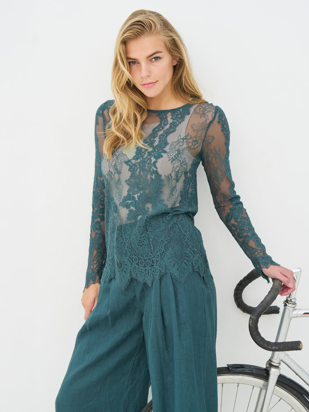 Denne blondetoppen har et feminint og elegant uttrykk med gjennomsiktig blonde og et tydelig blomstrete mønster. Det lette materialet gir dybde i utseendet og fungerer vakkert som et lag over en enkel topp. Kantene er avsluttet med en lett bølget kant, noe som gir en pen og gjennomført finish. Toppen er behagelig å ha på seg og kan styles både til hverdag og til mer festlige anledninger - alene eller under en blazer eller strikk.