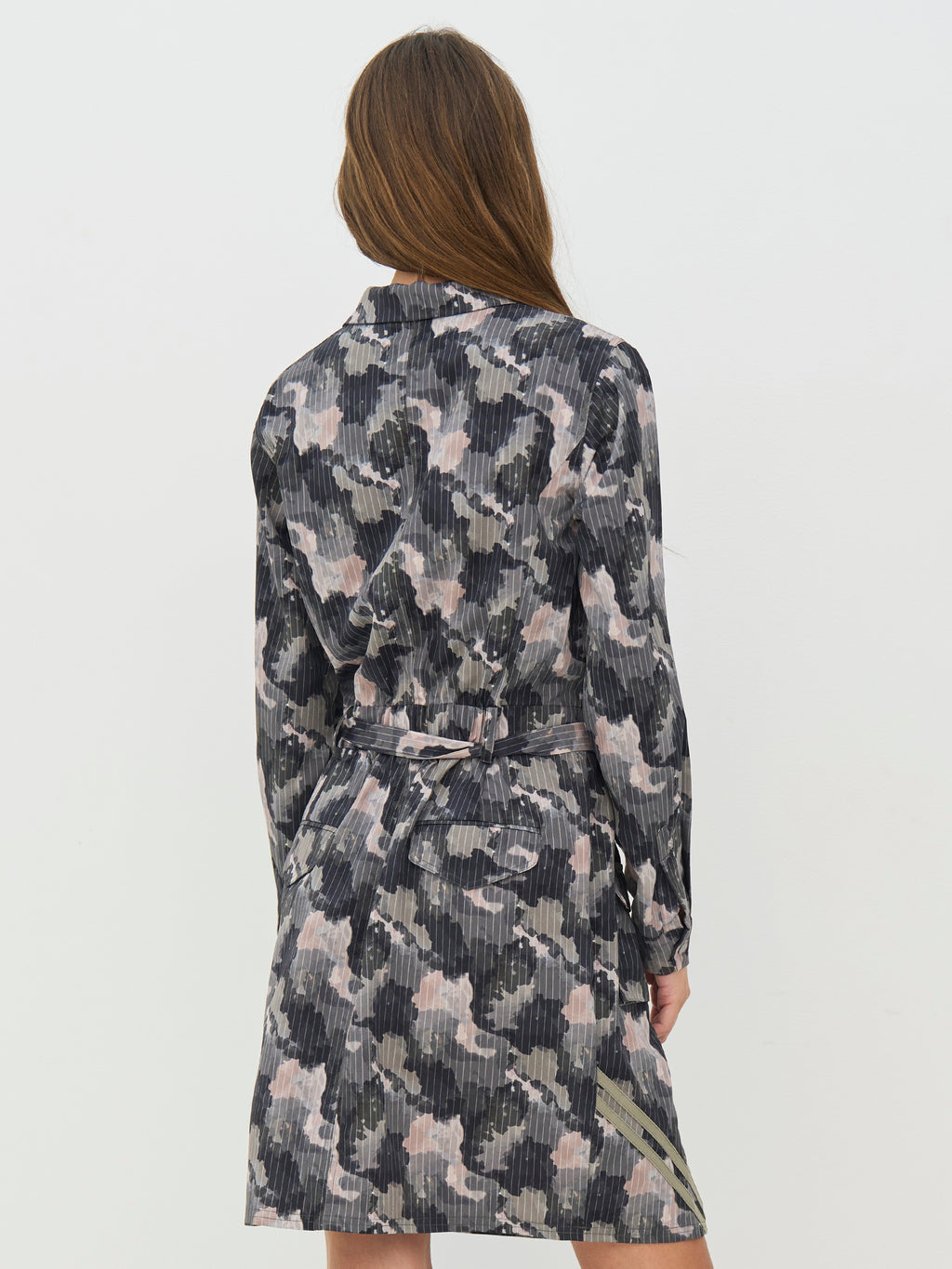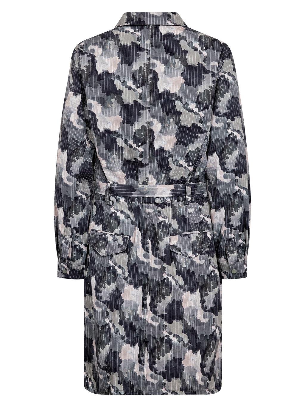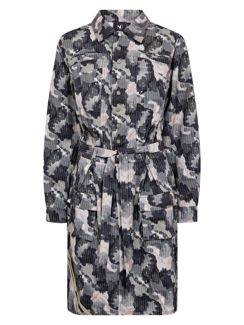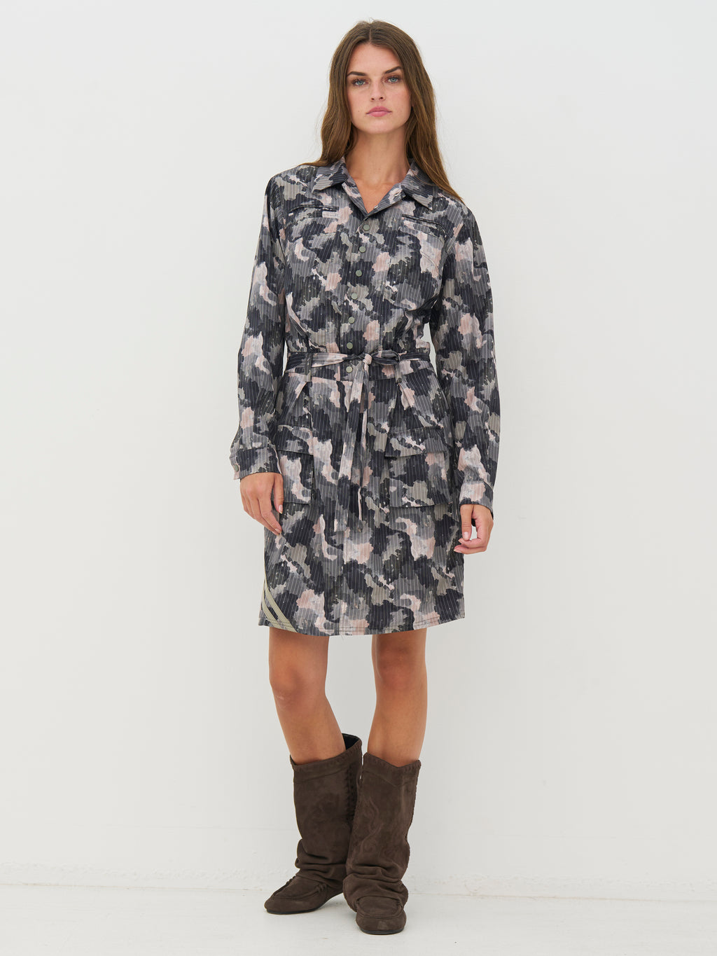 Kjolen har en klassisk skjortekrage og knapping øverst foran. Knappene er plassert ved brystet og fungerer som et dekorativt detalj, samtidig som kjolen er lukket. Foran har den brystlommer og et knyteskjørt i midjen som gir mulighet for å justere silhuetten. Bakstykket er enkelt med diskrete lommedetaljer. Style kjolen med støvler for en tøffere hverdagslook, eller med flate sko for et roligere uttrykk.