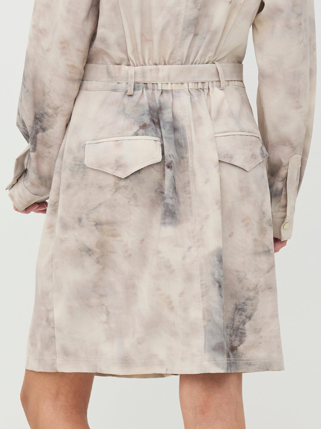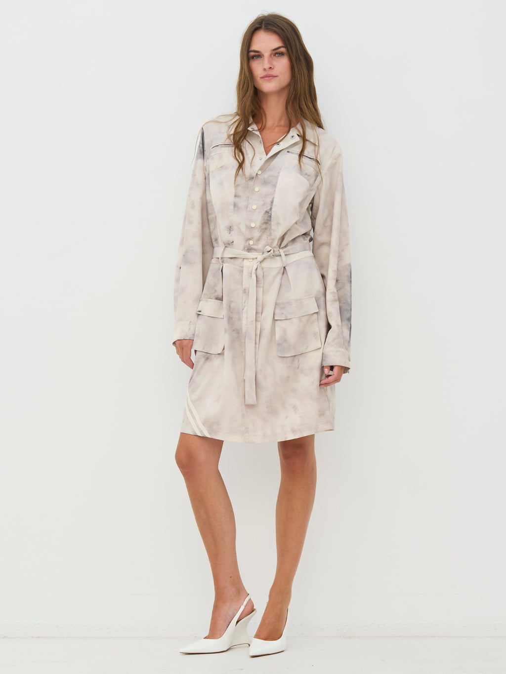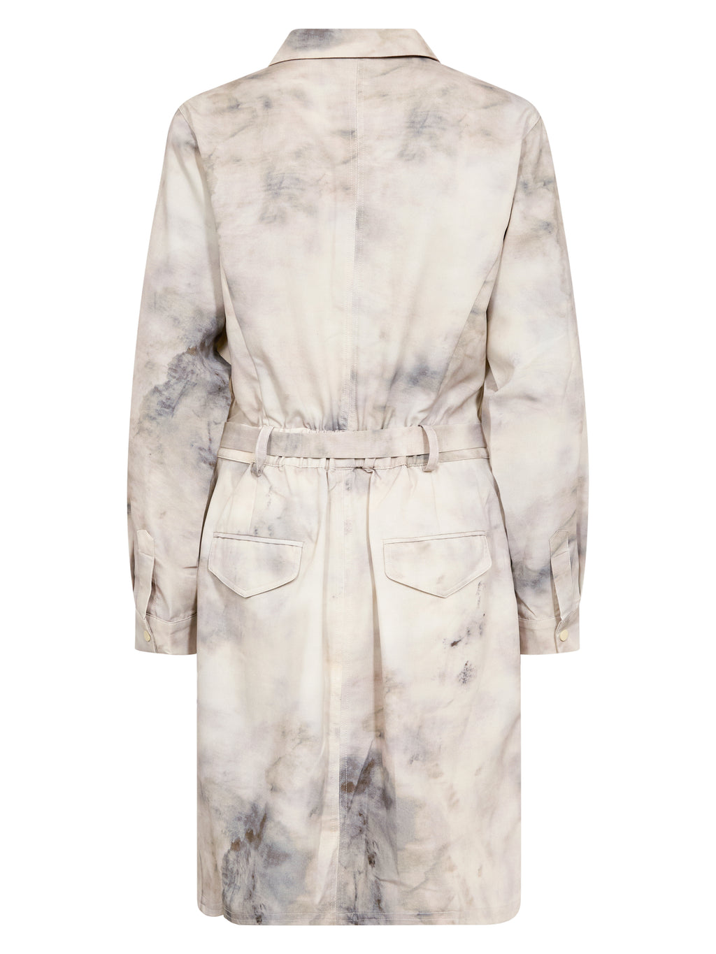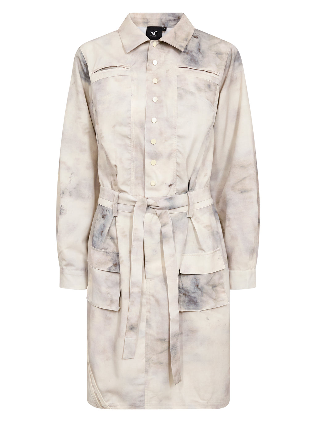 Kjolen har en klassisk skjortekrage og knapping øverst foran. Knappene er plassert ved brystet og fungerer som et dekorativt detalj, samtidig som kjolen er lukket. Foran har den brystlommer og et knyteskjørt i midjen som gir mulighet for å justere silhuetten. Bakstykket er enkelt med diskrete lommedetaljer. Style kjolen med støvler for en tøffere hverdagslook, eller med flate sko for et roligere uttrykk.