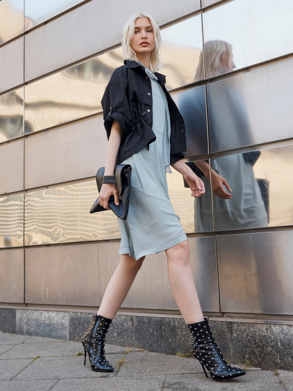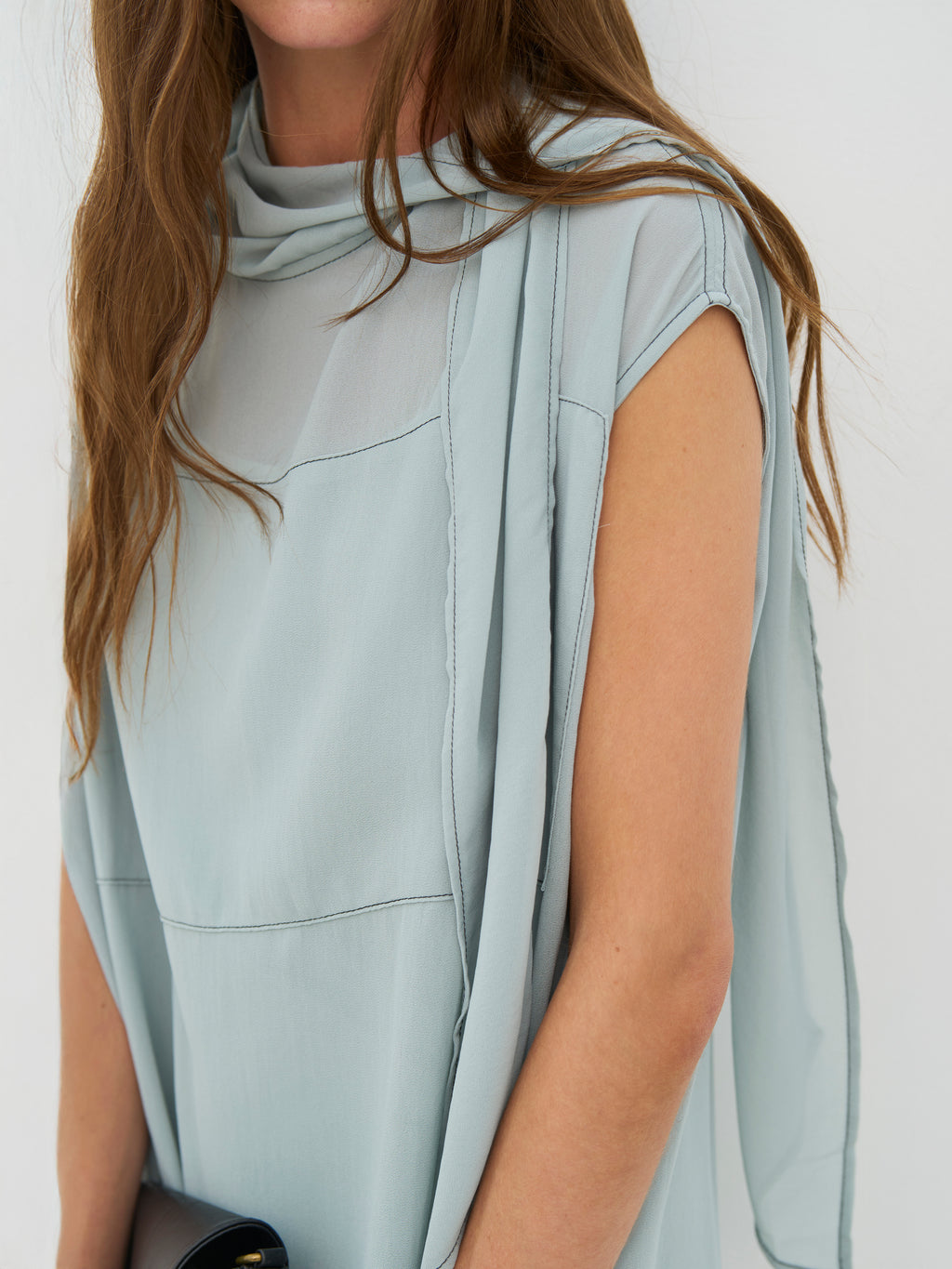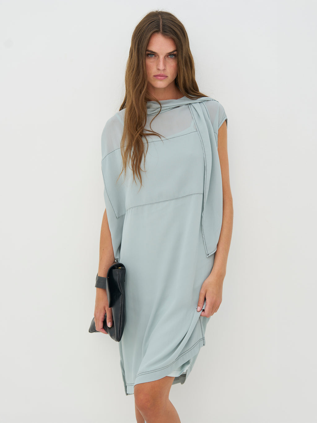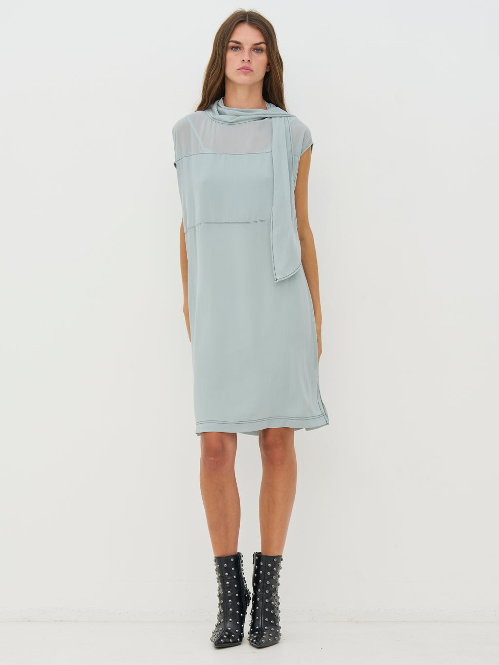 Denne kjolen har et enkelt og elegant uttrykk med en rett passform som faller pent langs kroppen. Den korte ermelengden gir et lett utseende, mens det løstsittende skjerfet rundt halsen legger til bevegelse og et fint detalj som kan styles på flere måter. De diskrete sømmene skaper en rolig struktur og gir kjolen et gjennomtenkt utseende. Baksiden er veldig enkel og understreker den rene silhuetten. Bruk kjolen med flate sko til hverdagsbruk eller med hæler og smykker til mer formelle anledninger.