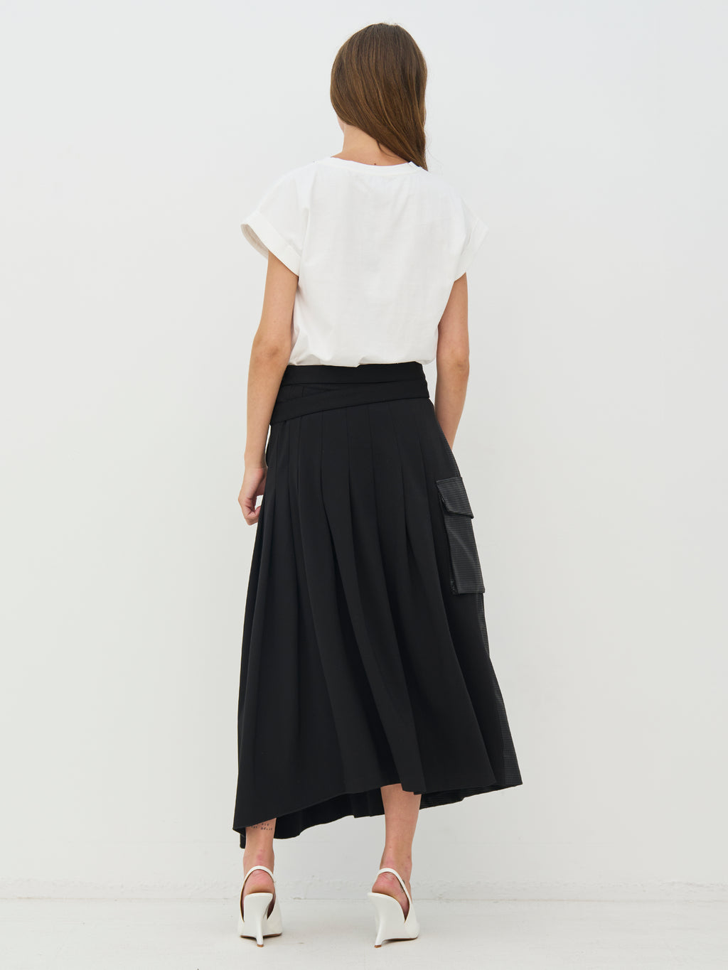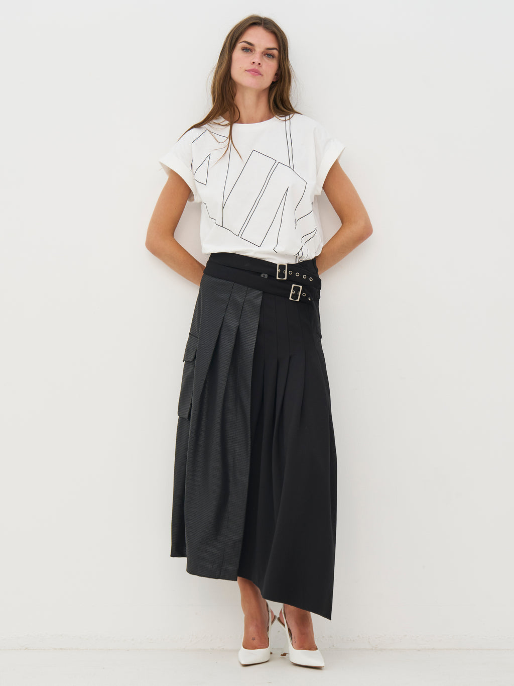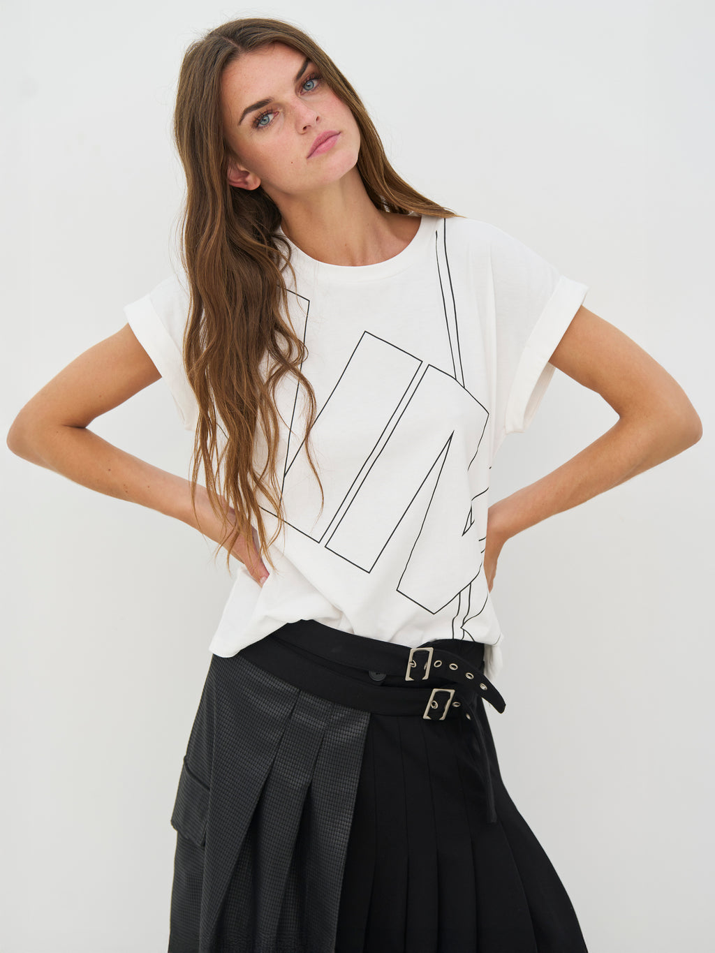 Denne T-skjorten har et enkelt og røft utseende med rund hals og korte ermer med lett opprulling. Det hvite trykket på forsiden gir en tydelig visuell uttrykk, mens baksiden er helt enkel og rolig. Passformen er rett og behagelig, noe som gjør T-skjorten enkel å bruke til hverdags. Bruk den med bukser eller skjørt for et avslappet utseende, eller style den under en blazer for et mer sammensatt uttrykk.
